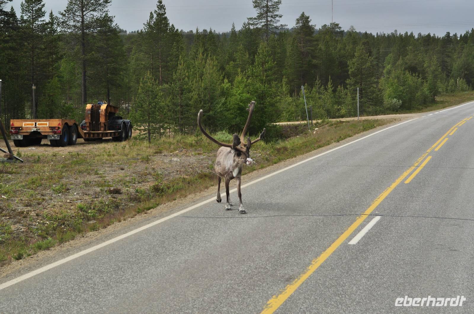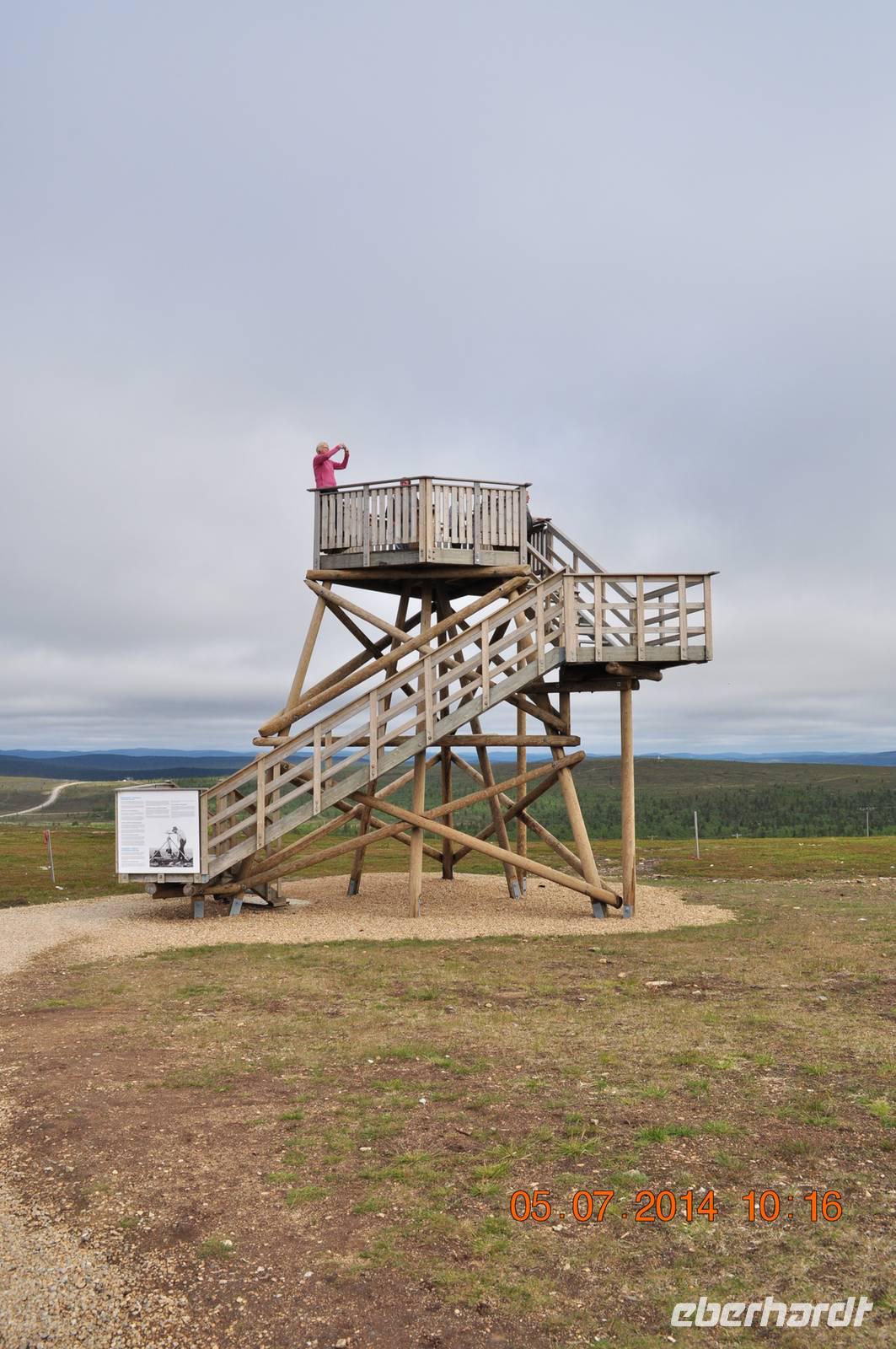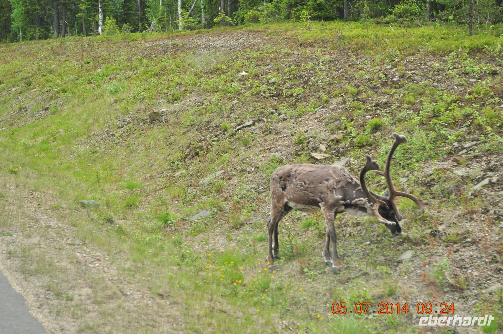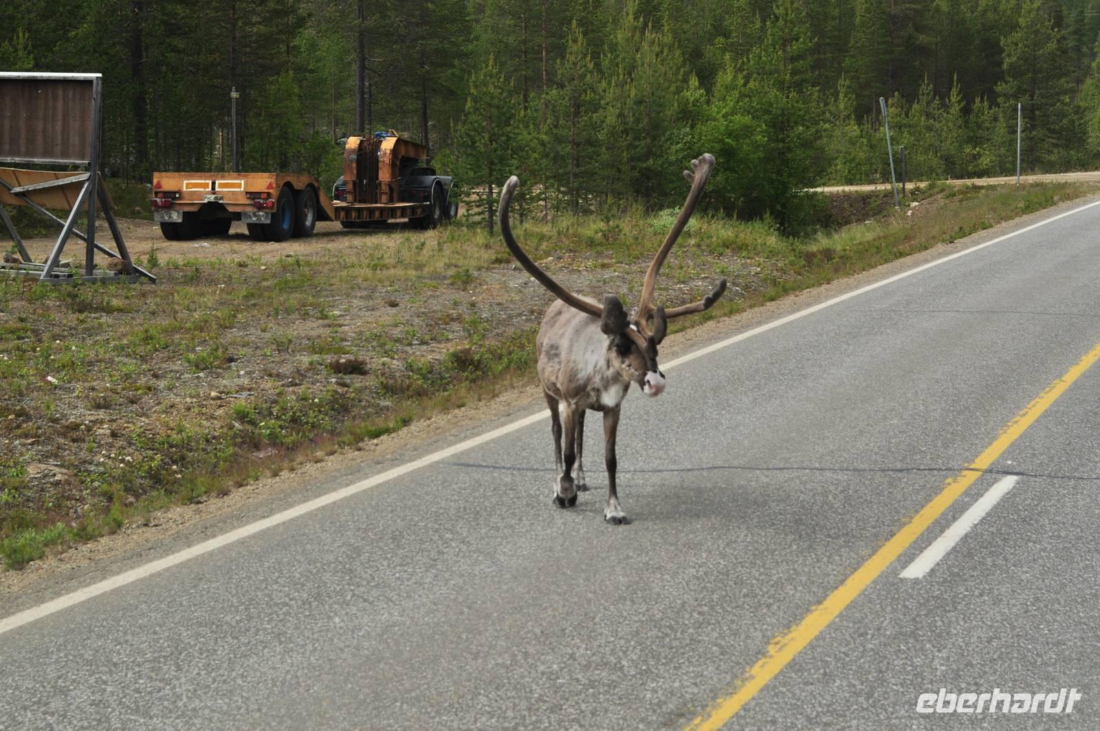 Nach dem alle wichtigen Weihnachtseinkäufe erledigt sind fahren wir weiter ins wilde Lappland. Unser heutiges Hotel liegt gewollt irgendwo im nirgendwo. Um uns herum liegt absolute Wildnis. Im Winter ein beliebtes Wintersporthotel, im Sommer lockt eine kurze Wanderung auf den nahe gelegenen Luostotunturi. Einer von diesen waldlosen Hügeln geprägt durch die karge Vegetation der Bergtundra. Mitten in der Wildnis. Die finnische Luftwaffe ist stark vertreten, kann uns aber von einem Abendspaziergang auf den Gipfel des Luostotunturi nicht abhalten. Unser Mut wird belohnt durch die Sichtung einer Rentiergruppe, die mit uns absteigt.