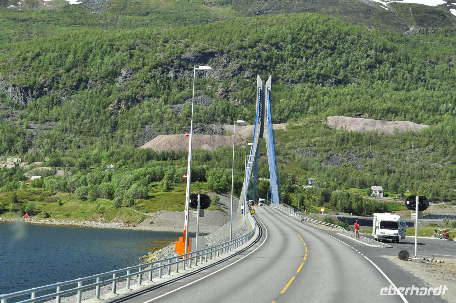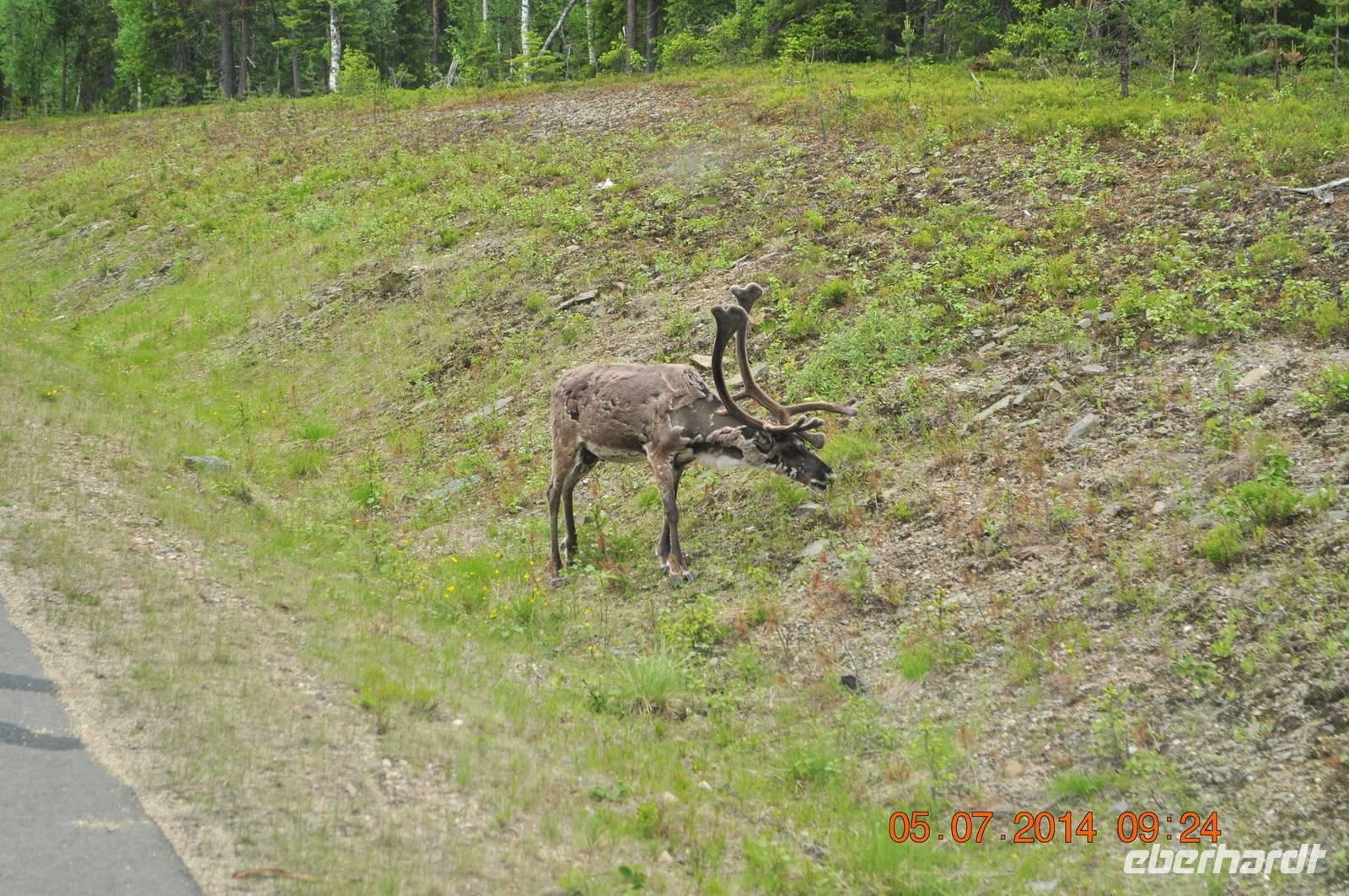Gegen Mittag erreichen wir Alta. Die bis zu 6.000 Jahre alten Felsritzungen gehören zum UNSESCO Weltkulturerbe. Sie liegen verstreut auf einer Vielzahl von Felsen, die über einen angelegten 1,2 km langen Weg miteinander verbunden sind. Häufig läuft man über Holzbohlen um die Kunstwerke nicht zu beschädigen. Nach der Mittagspause geht es weiter auf der E6 in Richtung Süden. Es wird wieder mal schwer gebaut hier oben im Norden. Die Brücke über den Kåfjorden und eine Reihe von Tunnel, die die alte kurvenreiche enge Strecke etwas sicherer machen ist nun im Jahr 2014 endlich fertig.