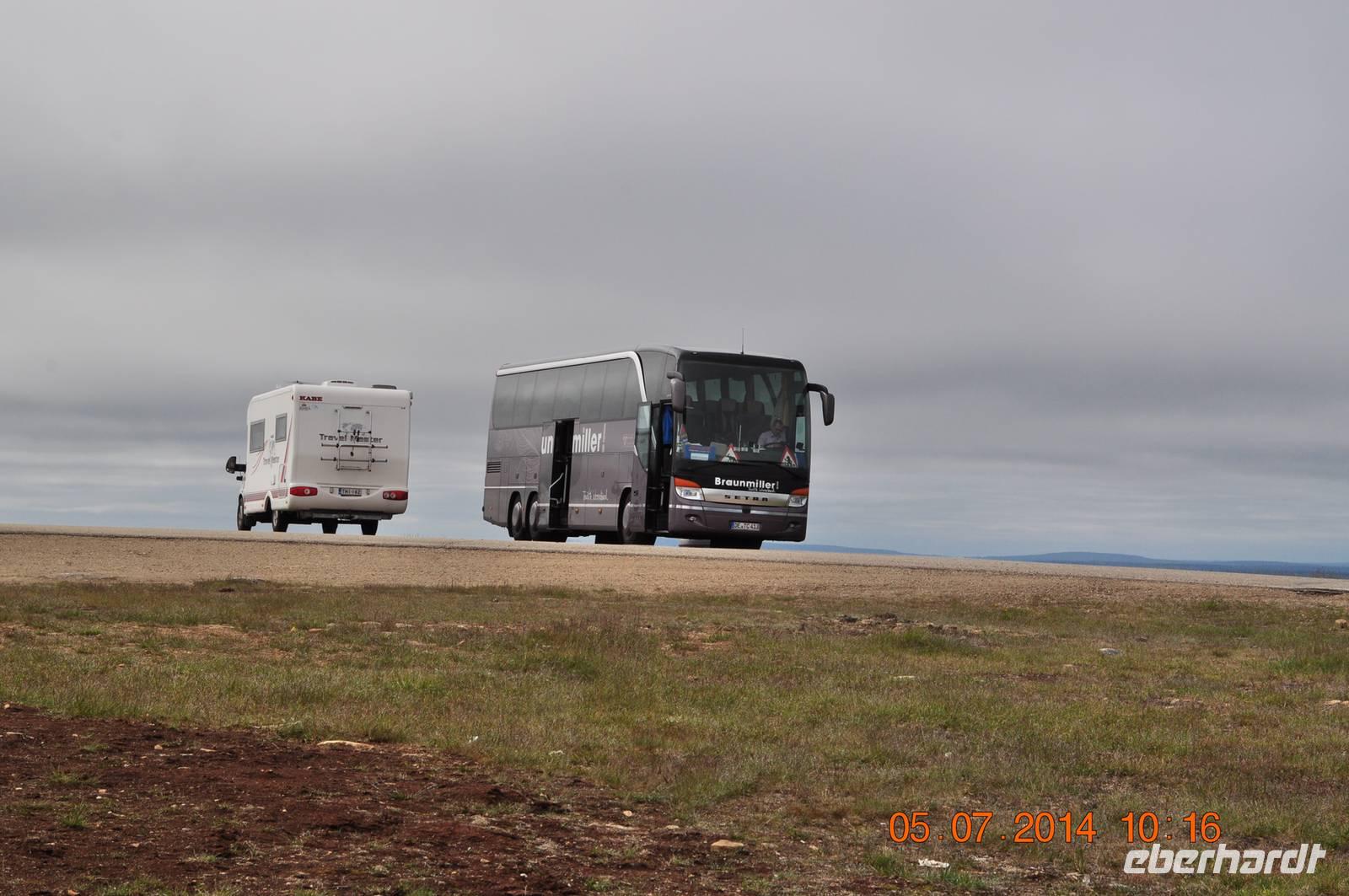 Unsere Reise führt uns nun wieder nach Süden. Es geht zurück über die E69 vorbei an Honingsvåg. Wir verlassen die Insel Magerøya wieder durch den Nordkapptunnelen. Vorbei an den schroffen Felsen, dem Porsangerfjord, Wasserfällen und Rentieren. Heute bekommt die andere Seite des Busses die Gelegenheit zu fotografieren. Keine Seite wird benachteiligt!