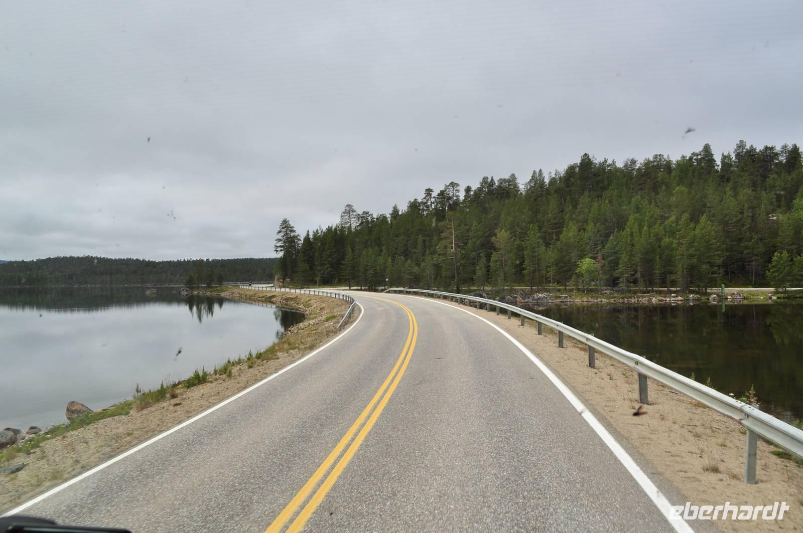 Für den Rest des Tages nehmen wir uns die Zeit um eine ganz besondere Strecke in Richtung Jyväskylä zu wählen. Wir nehmen eben nicht die wenig reizvolle Strecke der Europastraße sondern kleine Nebenstraßen, die uns über Sysmä direkt in den Päijänne-Nationalpark führen, mitten hinein in das wunderschöne Reich der finnischen Seenplatte. Die Straße führt stellenweise scheinbar direkt durch den See.