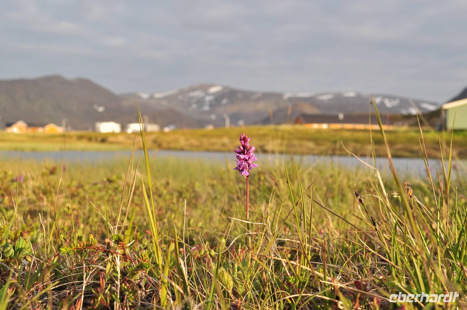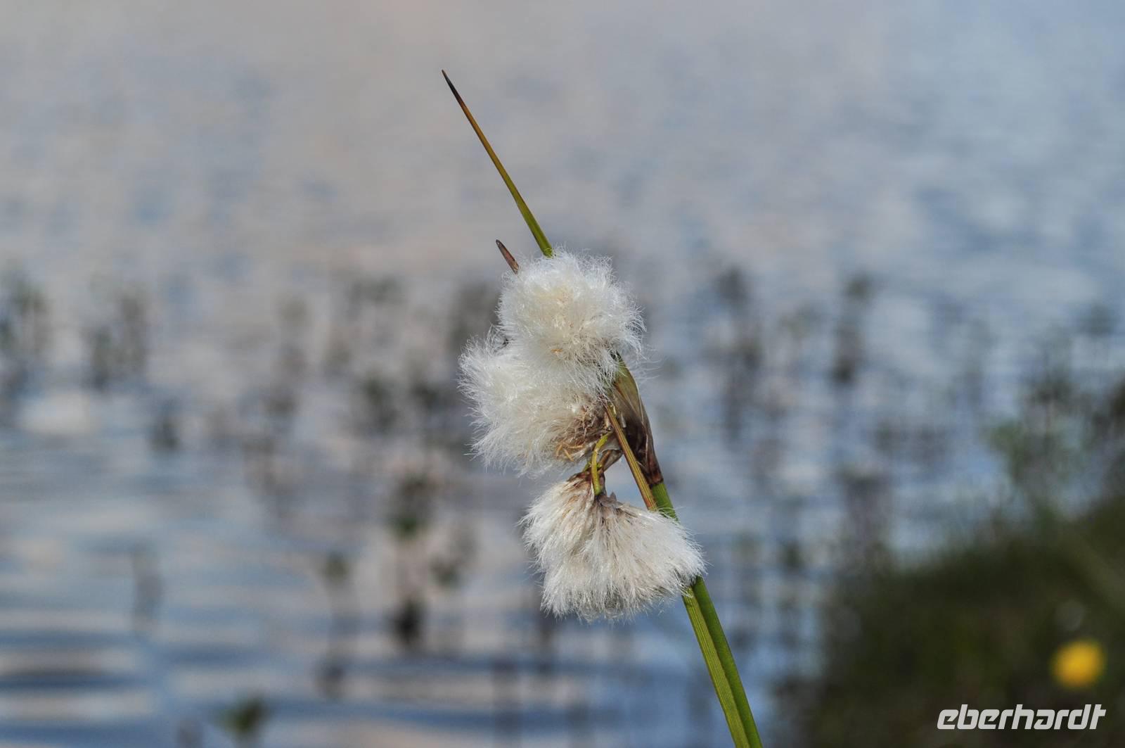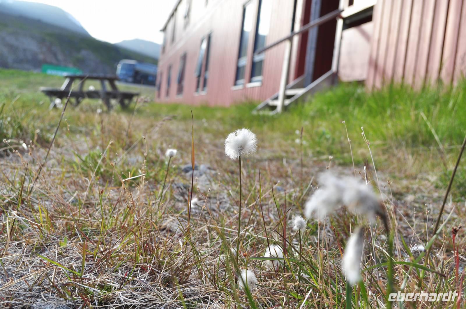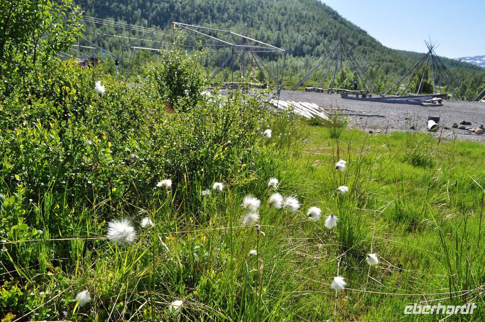 Über die E6 dringen wir ein in die raue Welt der Finnmarksvidda. Tundra und Straßen bis zum Horizont erwarten uns. In den mit Wasser gefüllten Straßengräben gedeiht das schön anzusehende Wollgras, überall wächst es an feuchten und nassen Stellen, von denen es in ganz Skandinavien reichlich gibt.