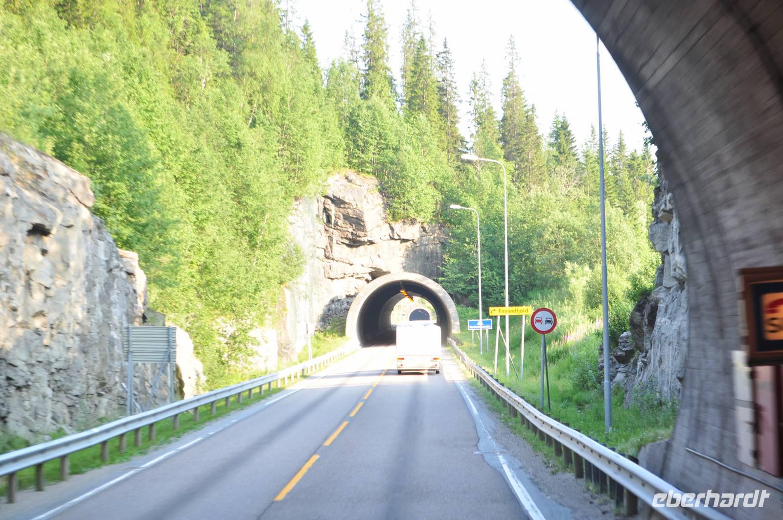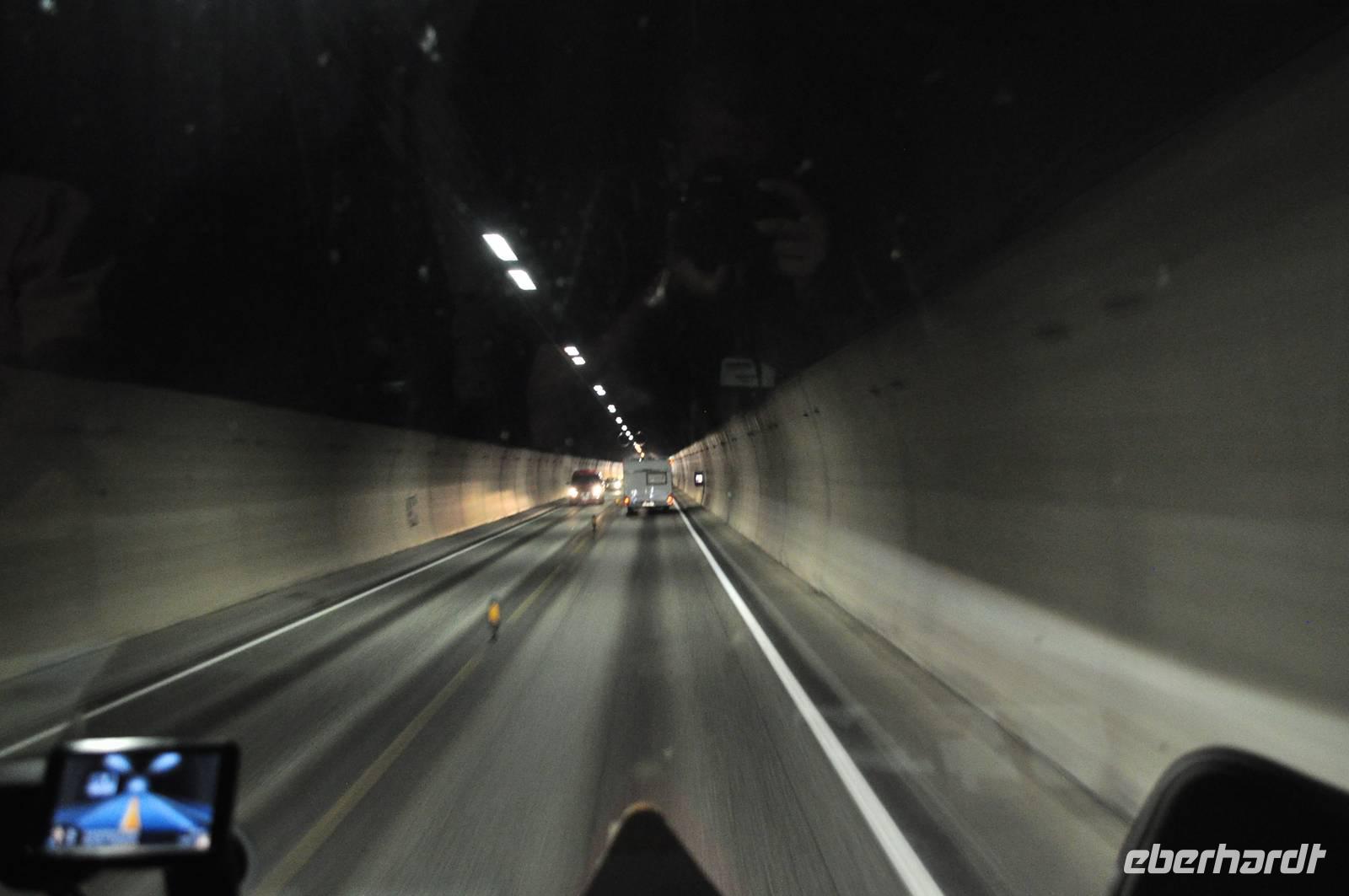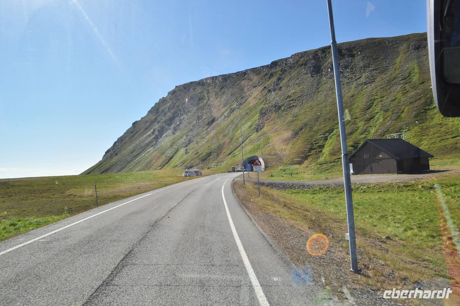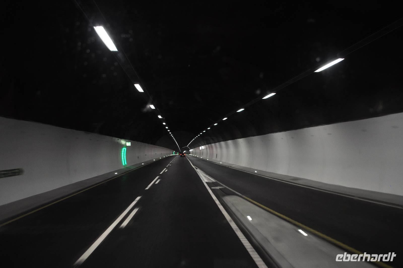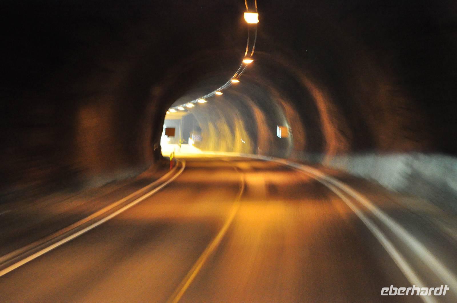Wir erreichen den Fatima-Tunnel (norw. Fastlandsforbindelse til Magerøya = dt. Festlandsverbindung nach Magerøya) besser bekannt als Nordkapptunnelen. Mit den 10% Gefälle und 10% Steigung, einer Tiefe von 232m unter dem Fjord und einer Länge von gut 7 km ist er einer der längsten und tiefsten Unterwassertunnel Europas.
