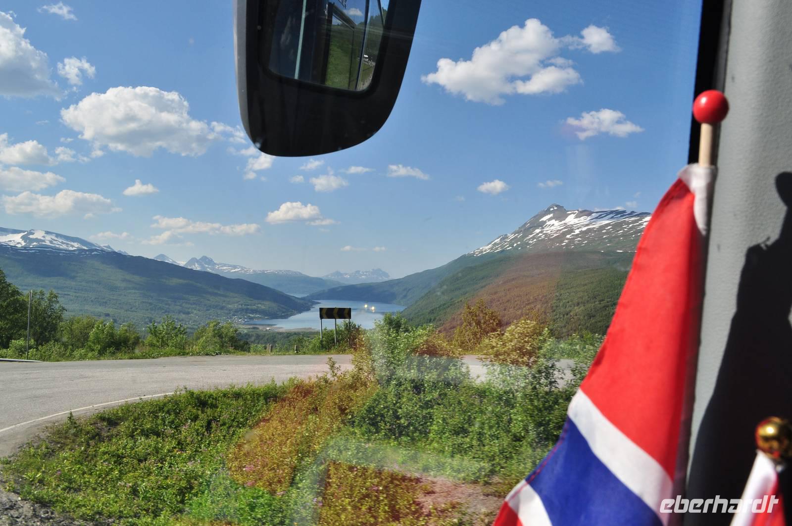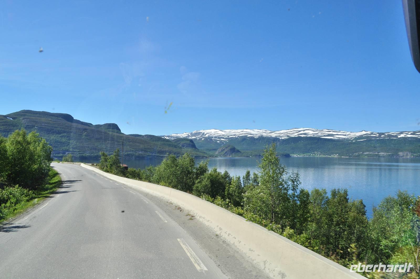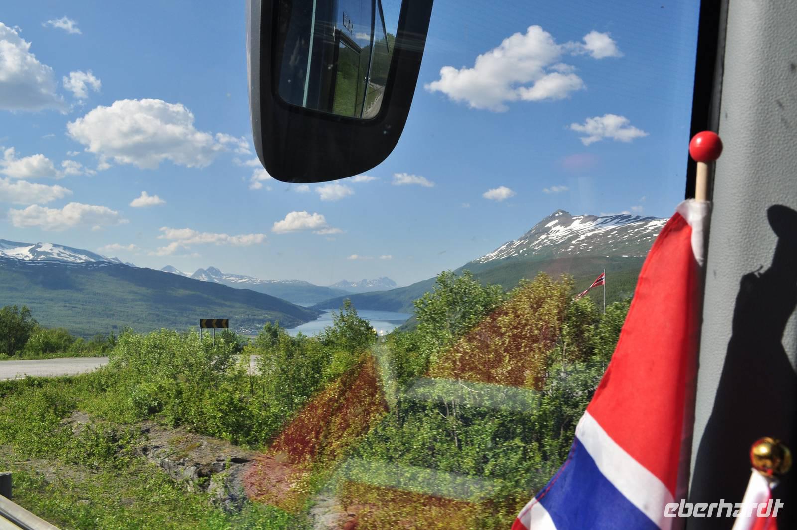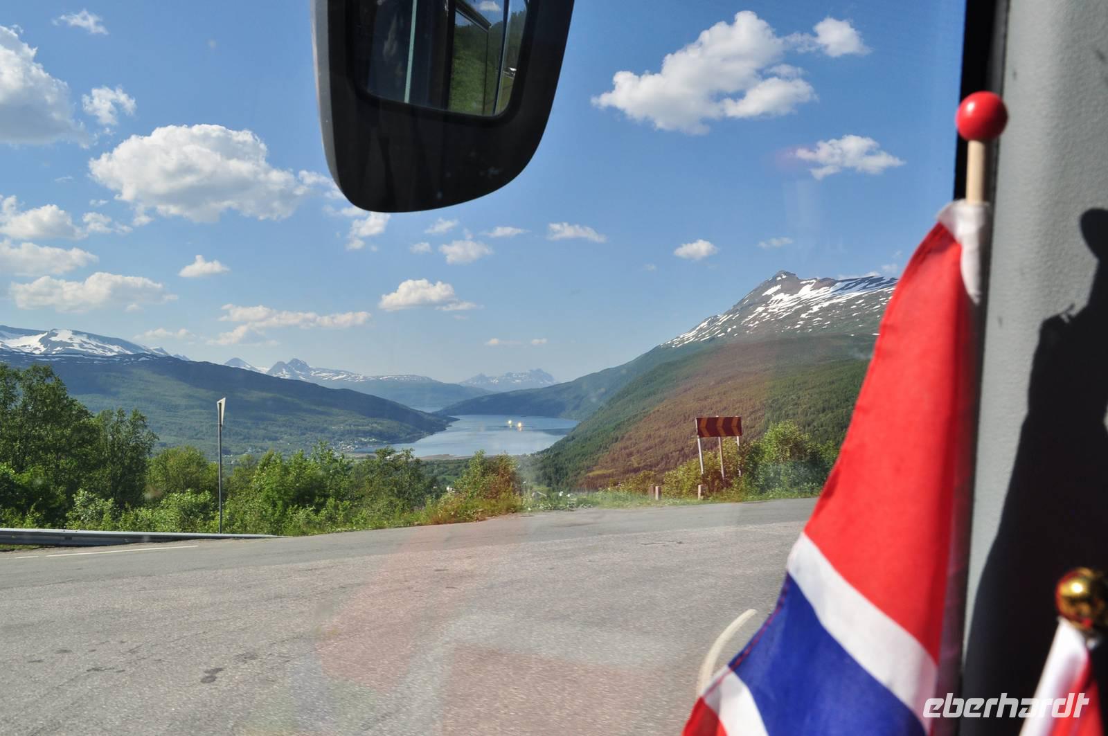 Nach kurzer Fahrt mit dem Bus erreichen wir wieder die E6. Es geht entlang verschiedener Fjorde und über einige Fjelle.