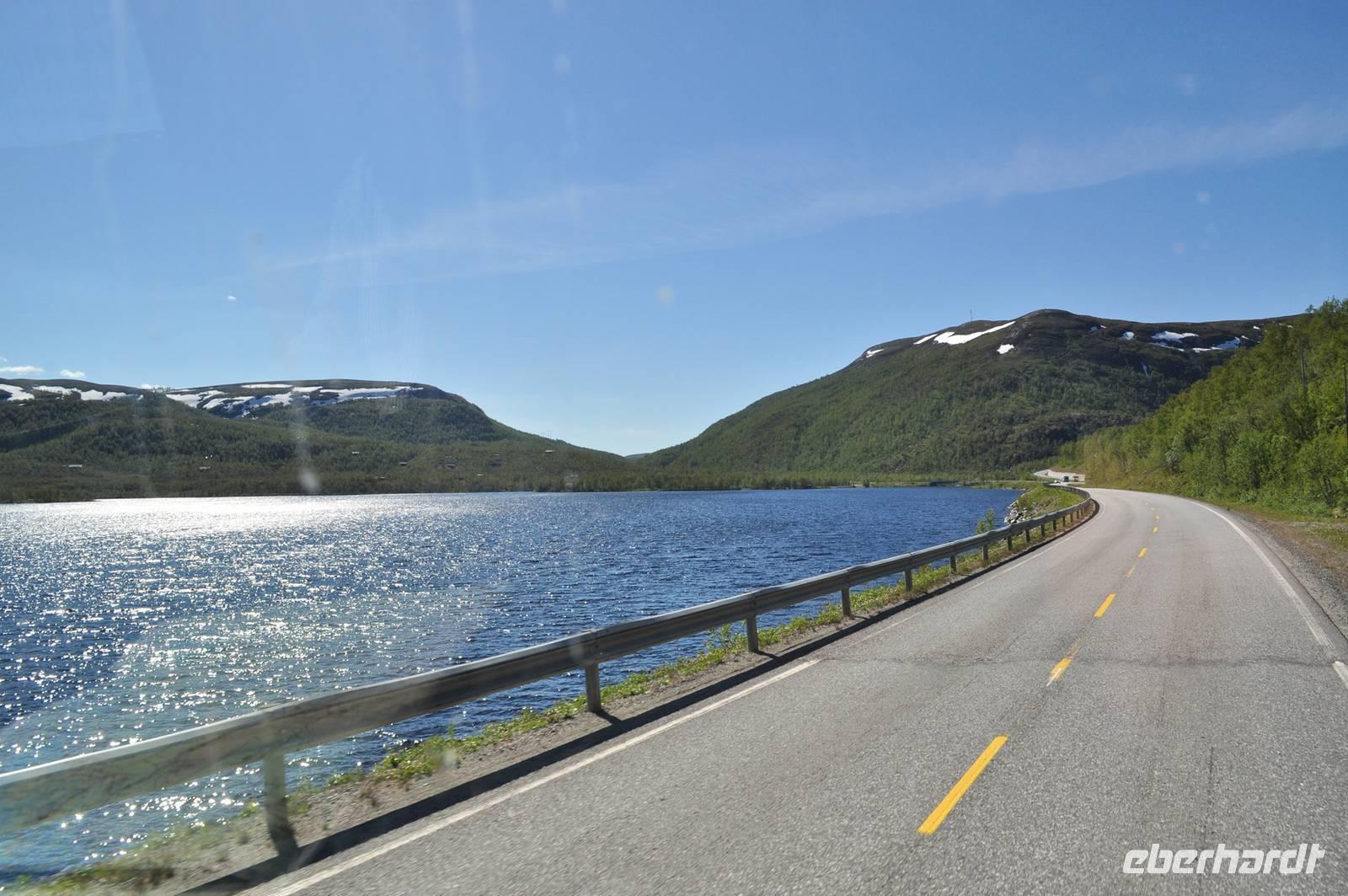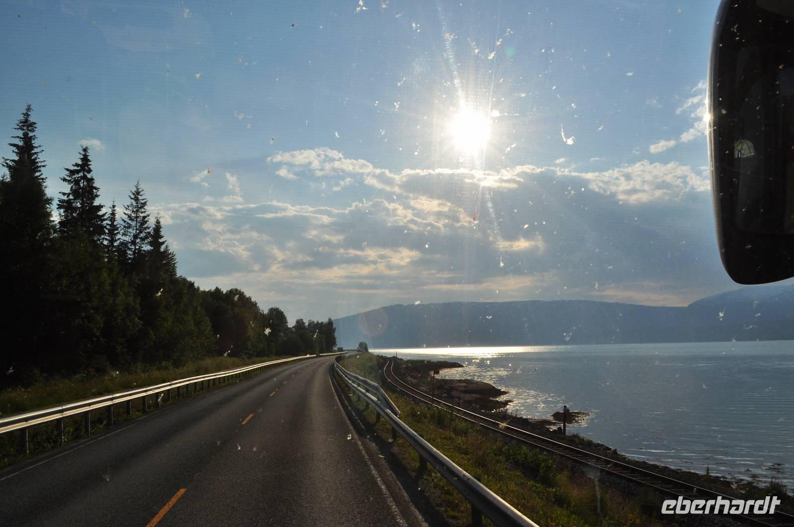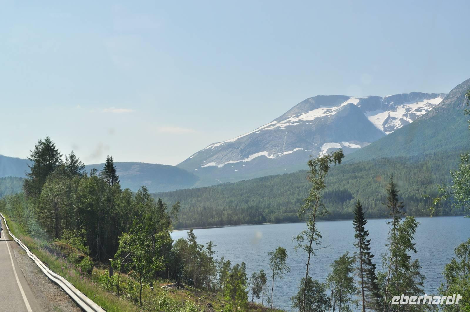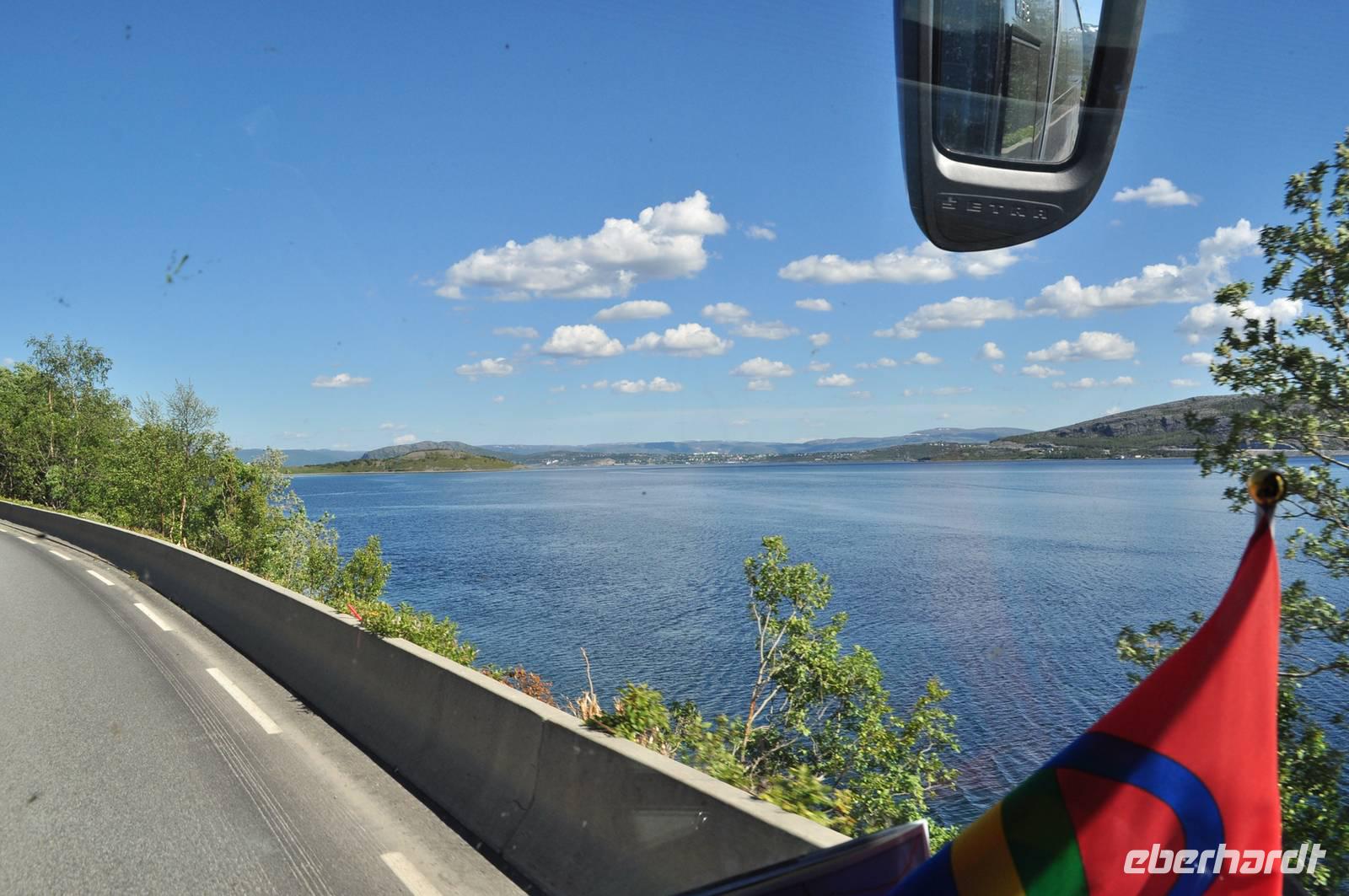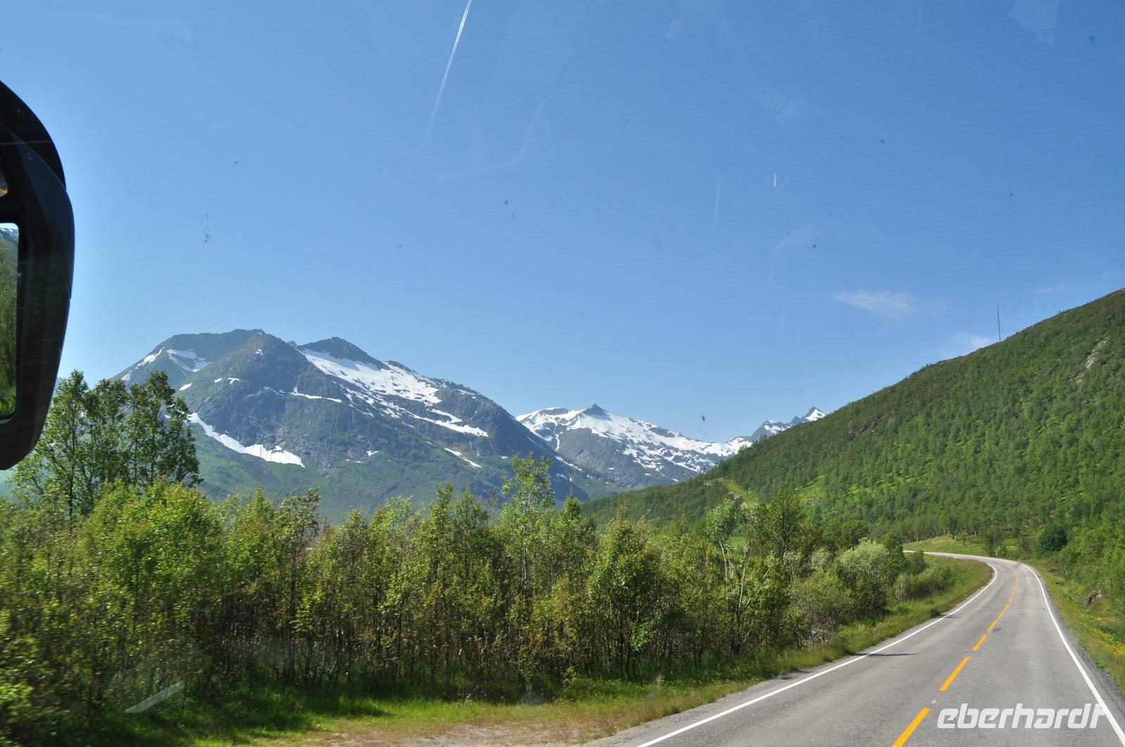 Nach kurzer Fahrt mit dem Bus erreichen wir wieder die E6. Es geht entlang verschiedener Fjorde und über einige Fjelle.