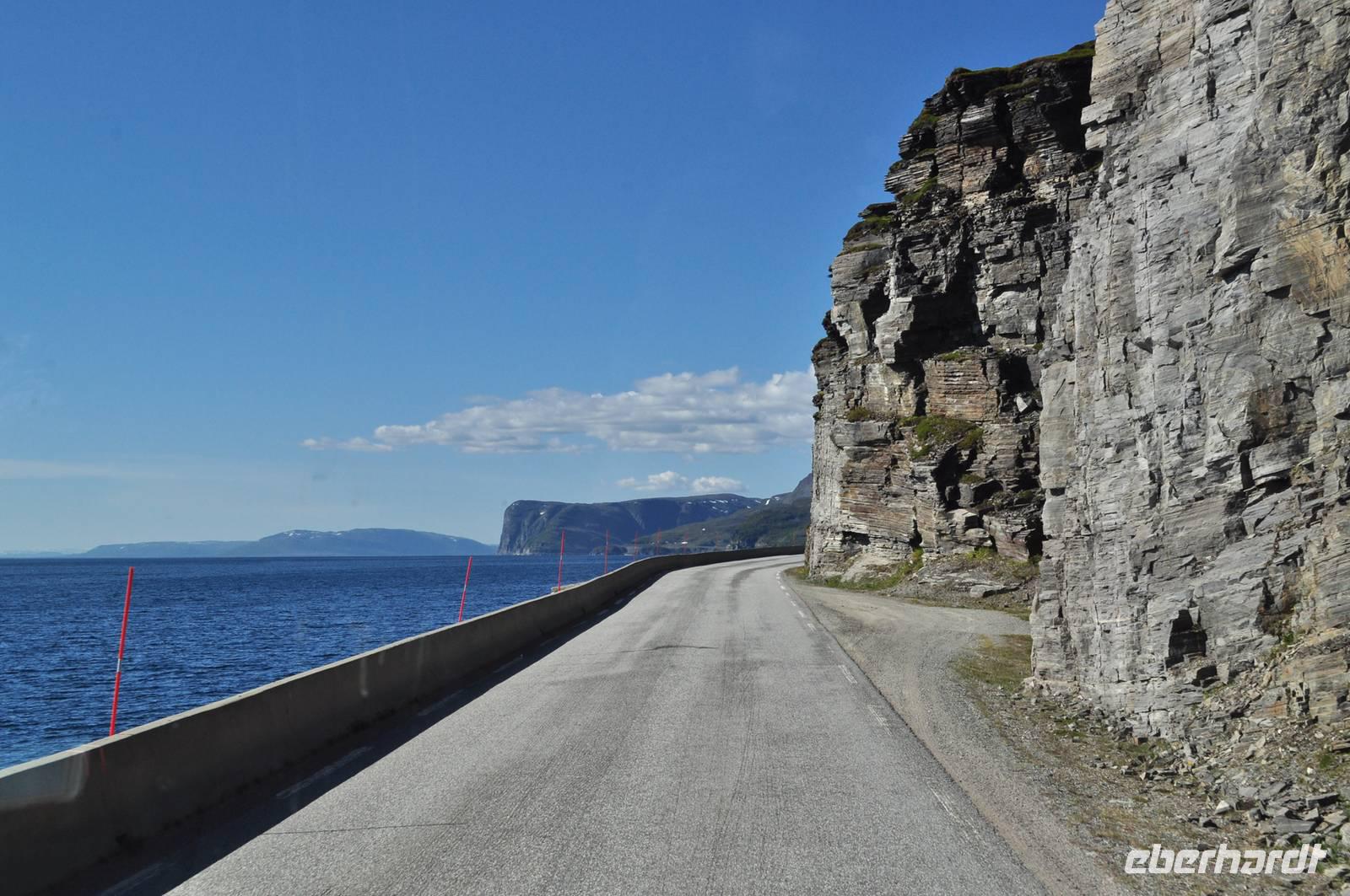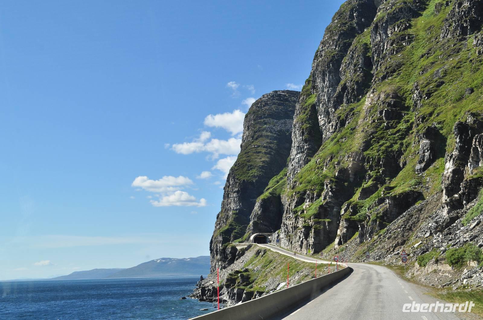 In Olderfjord fahren wir auf die E69, die Straße, die bis hinauf zum Nordkapp führt. Der spektakuläre Fjord begleitet uns über viele Kilometer nach Norden und bietet hinter jeder Kurve neue spektakuläre Perspektiven, gespickt mit bizarren Schieferfelsen, Wasserfällen, Tundra und zahlreichen Rentieren.