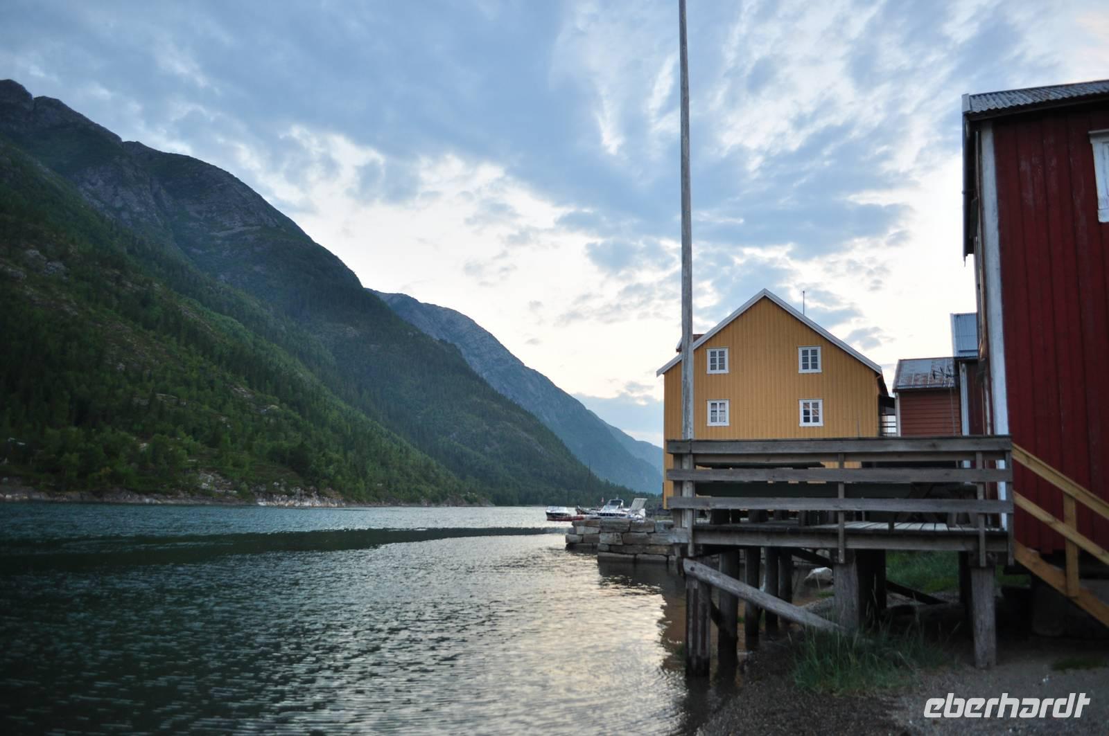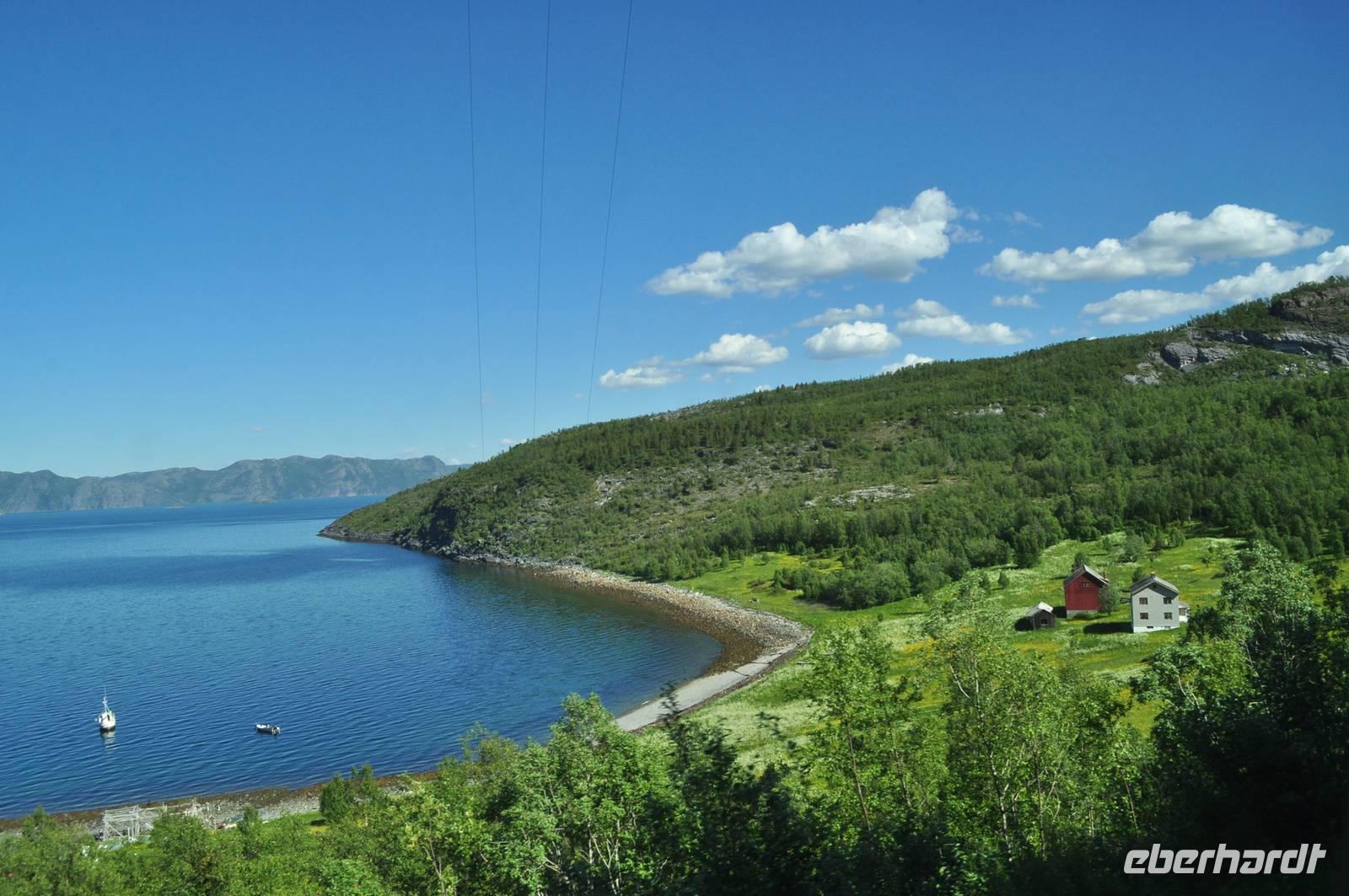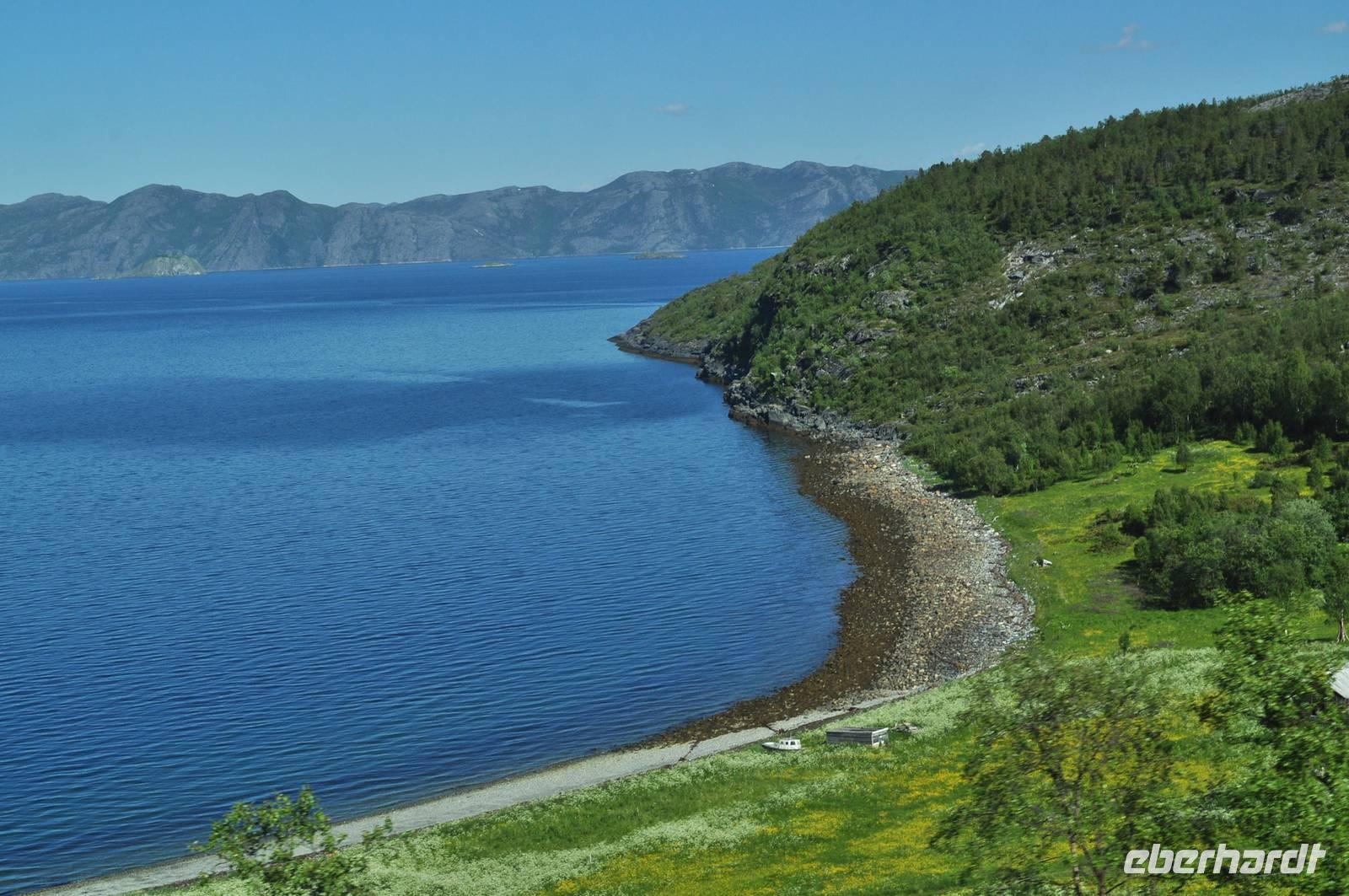 Der Weg führt uns den ganzen Tag von Meereshöhe der Fjorde hinauf auf die baumlosen Fjelle, um uns schnell zurück auf Meeresniveau zu befördern. Es folgt der Langfjorden und das Gebirgsmassiv des Øksfjordjøkelen, dem 9. größten Gletscher Norwegens.