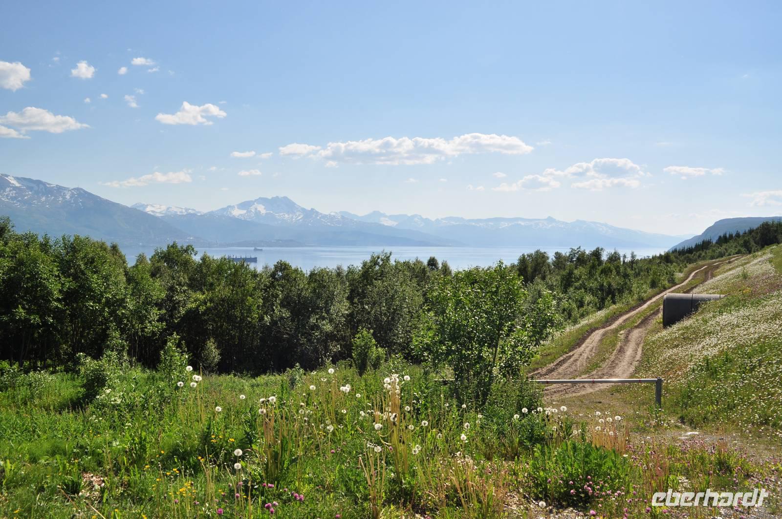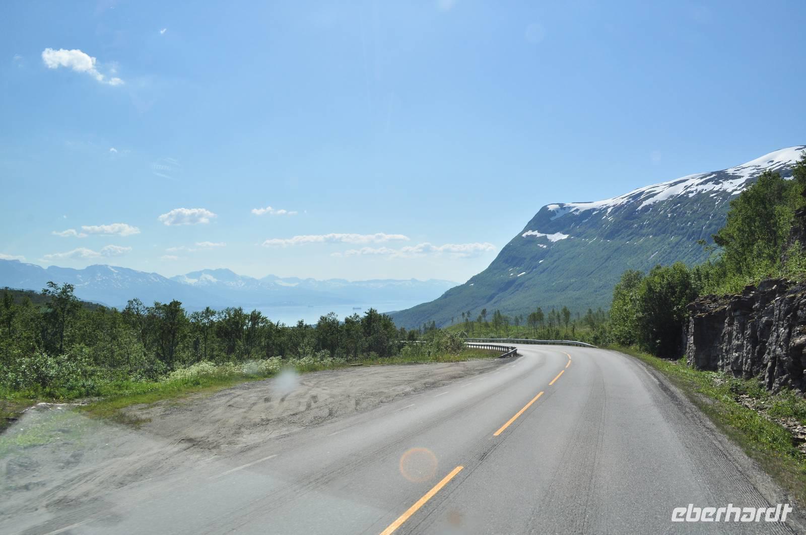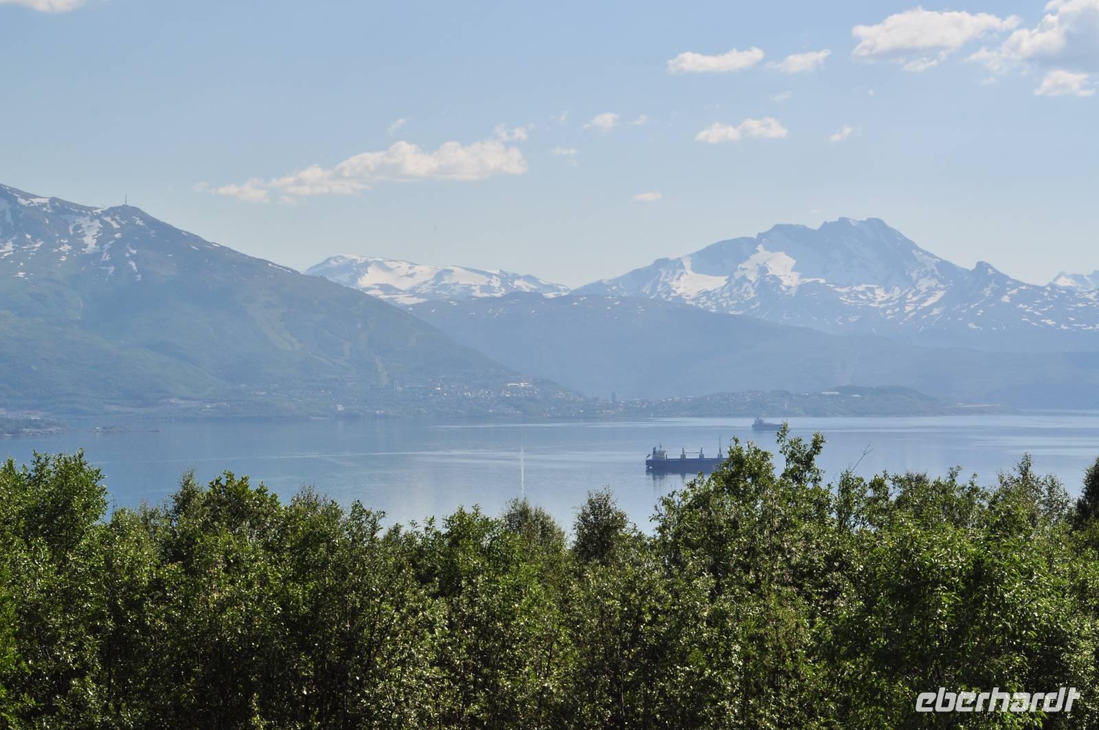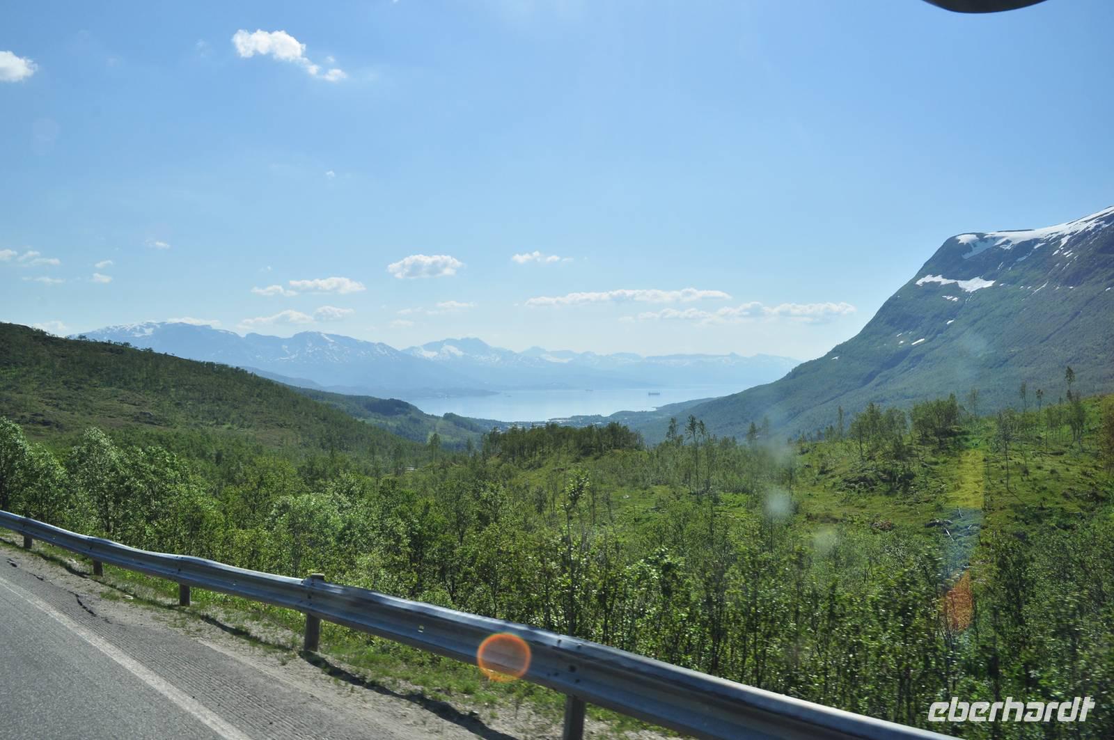 Dann geht weiter nach Süden, wir erreichen den Ofotfjord und genießen den Blick auf die Stadt Narvik, die auf der anderen Fjordseite liegt. Wir verlassen hier für einige Tage die E6 und nutzen nun die E10 in Richtung Vesterålen und Lofoten.