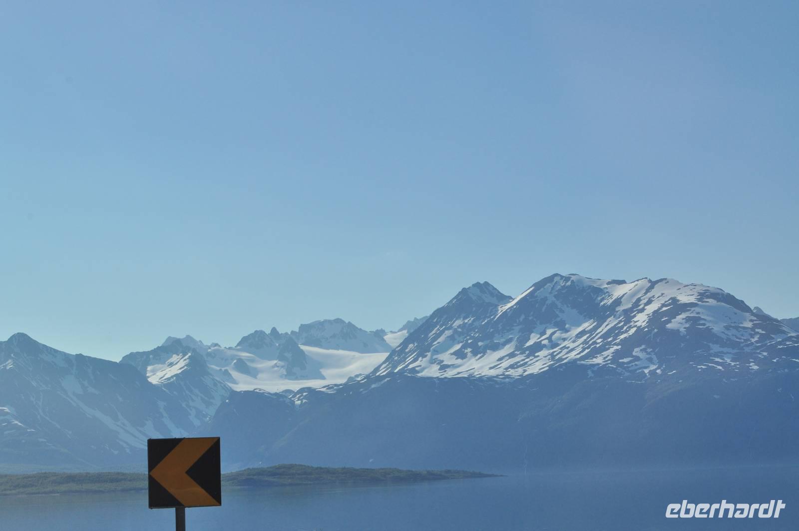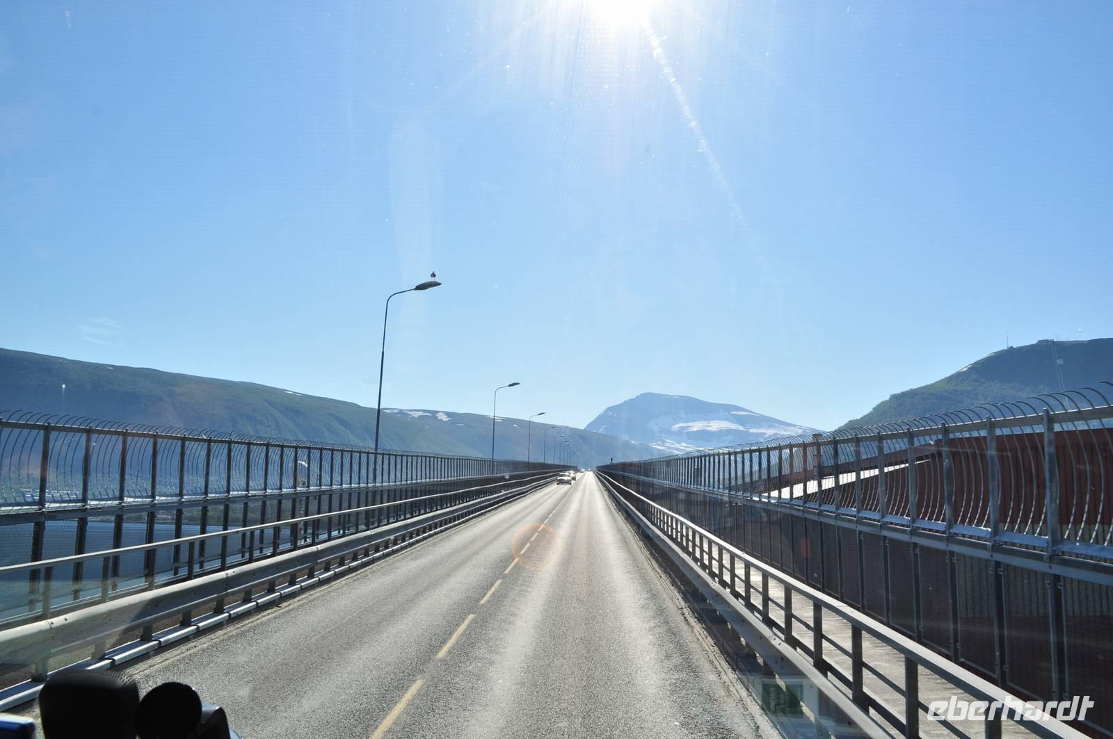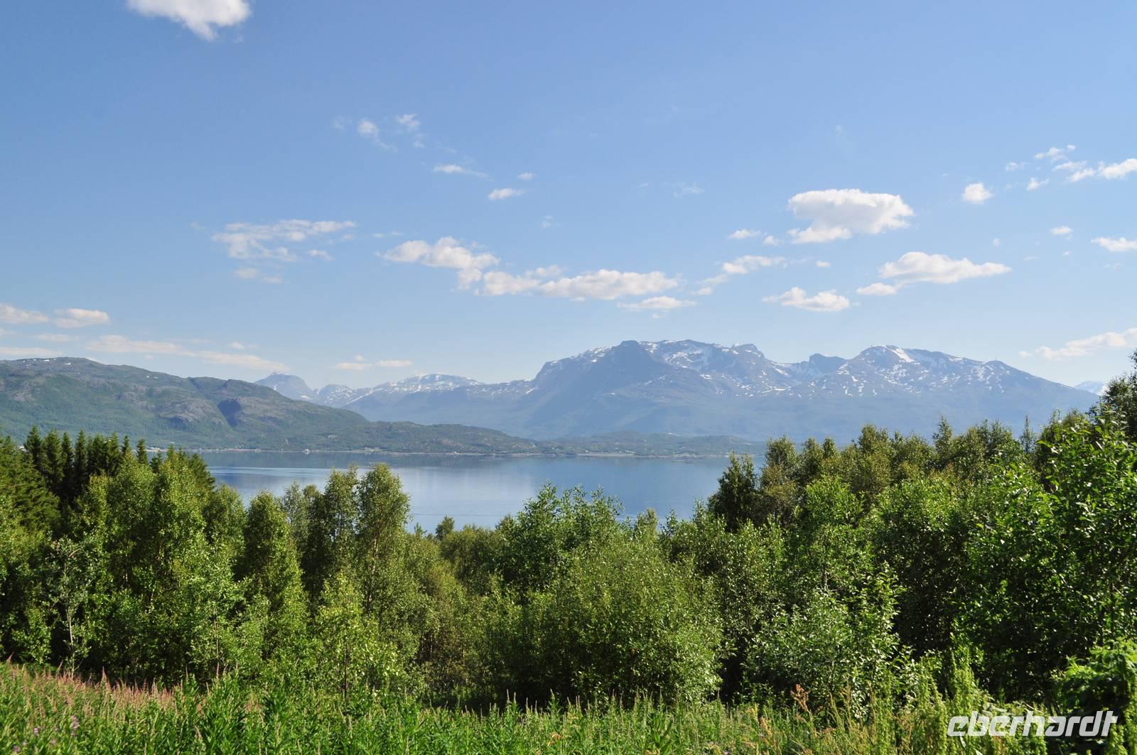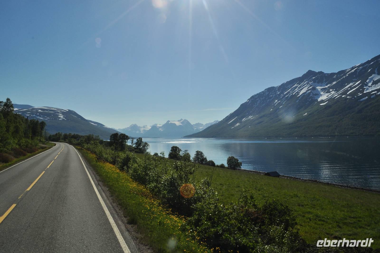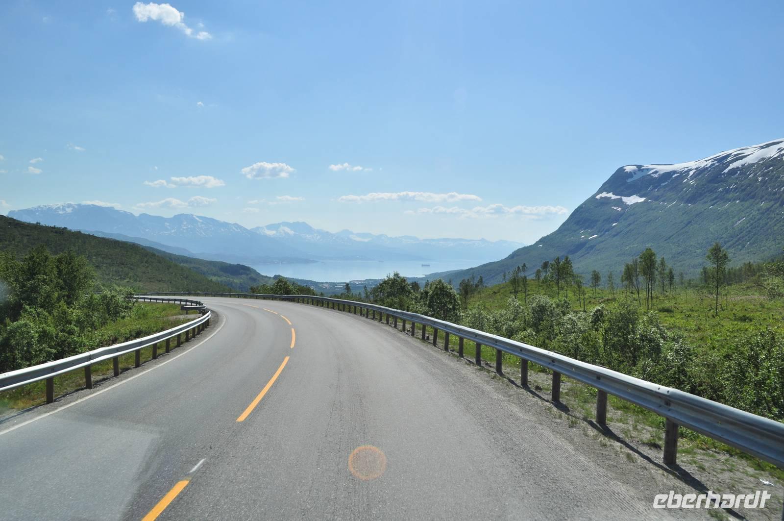 Dann geht weiter nach Süden, wir erreichen den Ofotfjord und genießen den Blick auf die Stadt Narvik, die auf der anderen Fjordseite liegt. Wir verlassen hier für einige Tage die E6 und nutzen nun die E10 in Richtung Vesterålen und Lofoten.