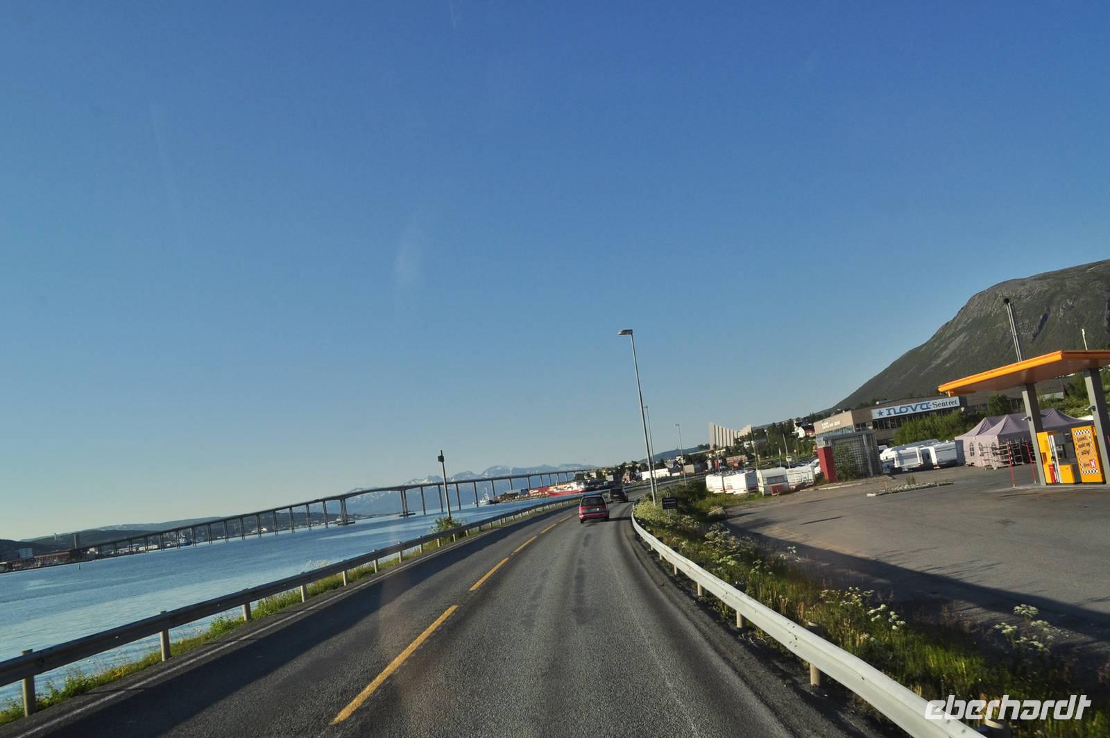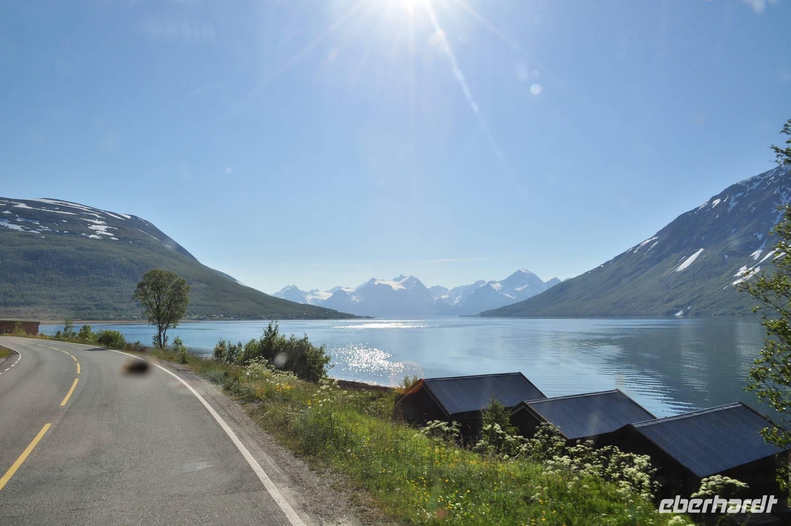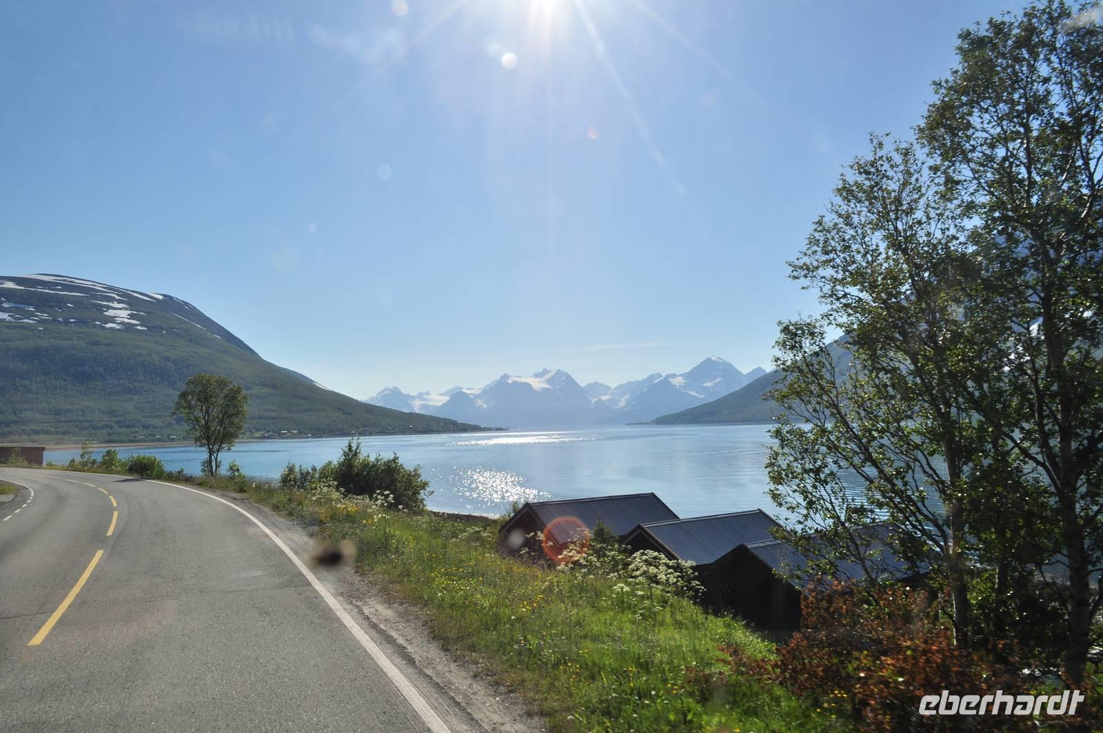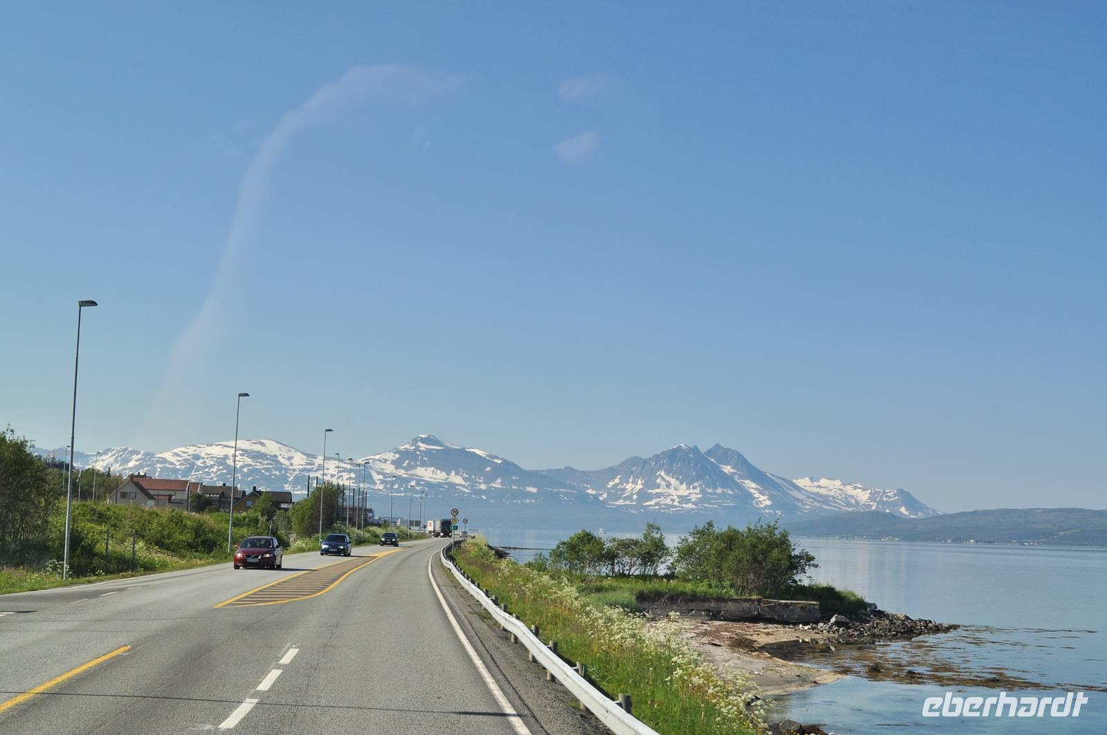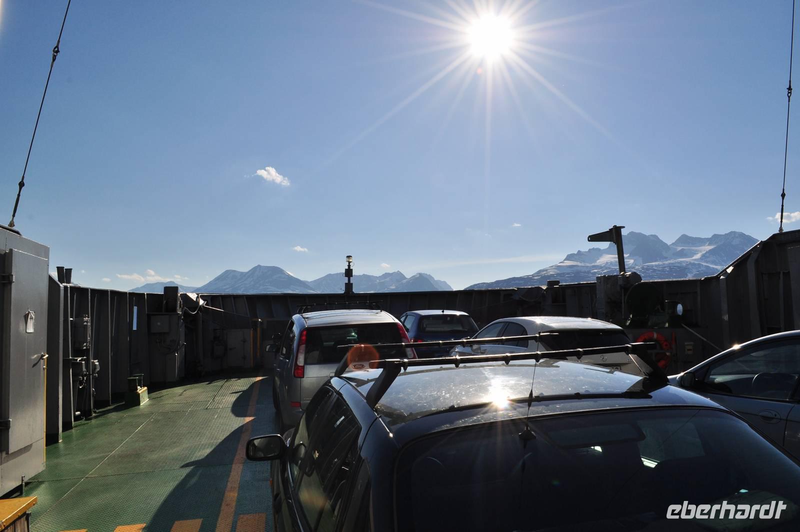 Die zweite Passage führte von Svensby nach Breivikeidet über den gut 6,5 km breiten Ullsfjorden, was ca. 25 Minuten dauert. Von Olderdalen nach Tromsø sind es mit den beiden Fjordfähren über die #91 und die E8 gut 100 km. Auf dem Landweg wären es über die E6 und E8 gut 182 km gewesen.