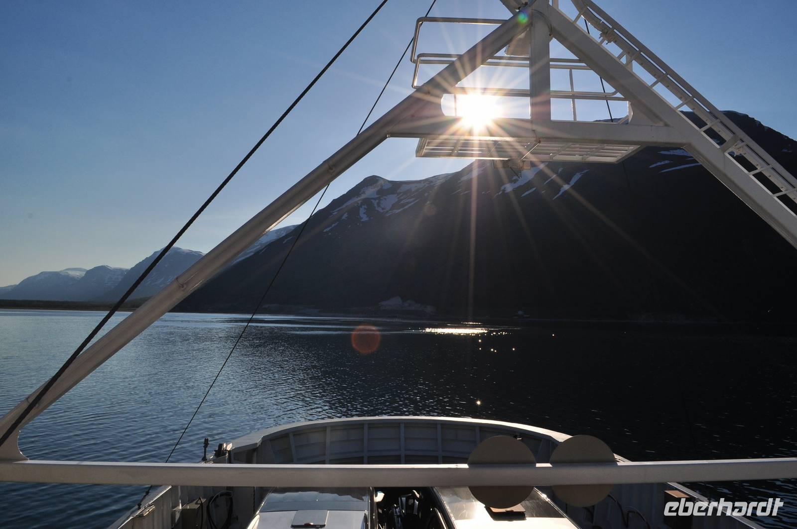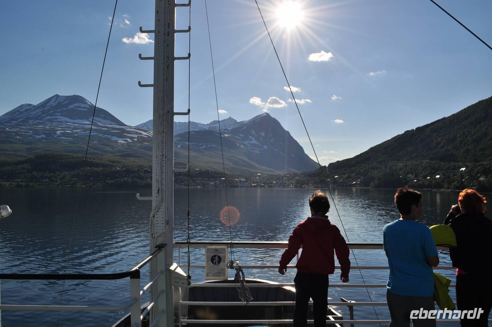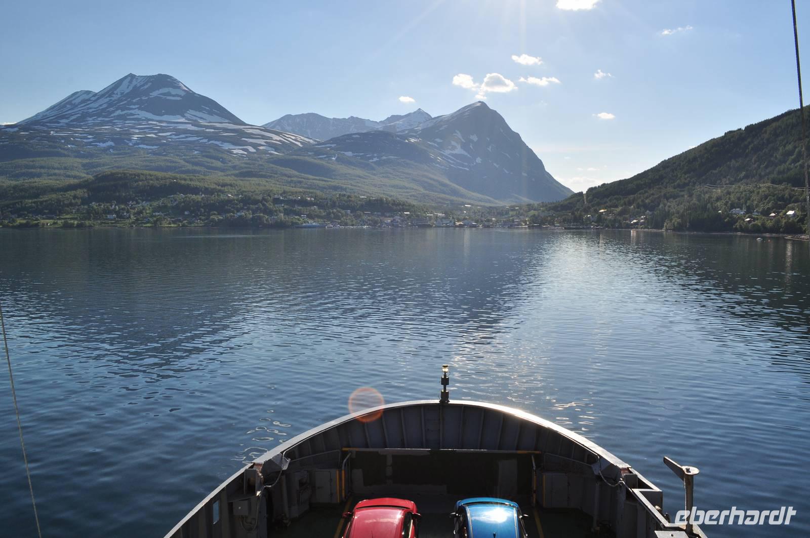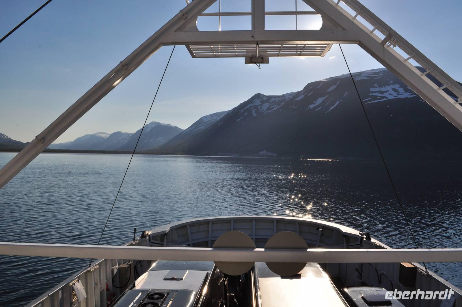 Am späten Nachmittag erreichen wir den Lyngenfjord. Die Fjordquerung in Richtung Tromsø besteht aus zwei kleinen Fähren, die zeitlich miteinander gekoppelt sind, die erste Passage über den Lyngenfjord führt uns von Olderdalen nach Lyngseidet und dauert für die ca. 13 km lange Strecke ca. 45 Minuten. Eine Umrundung des Fjordes hätte uns