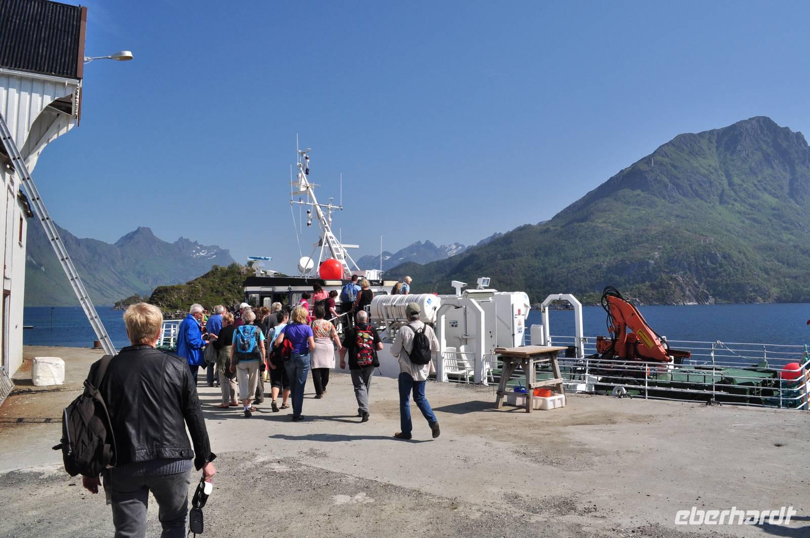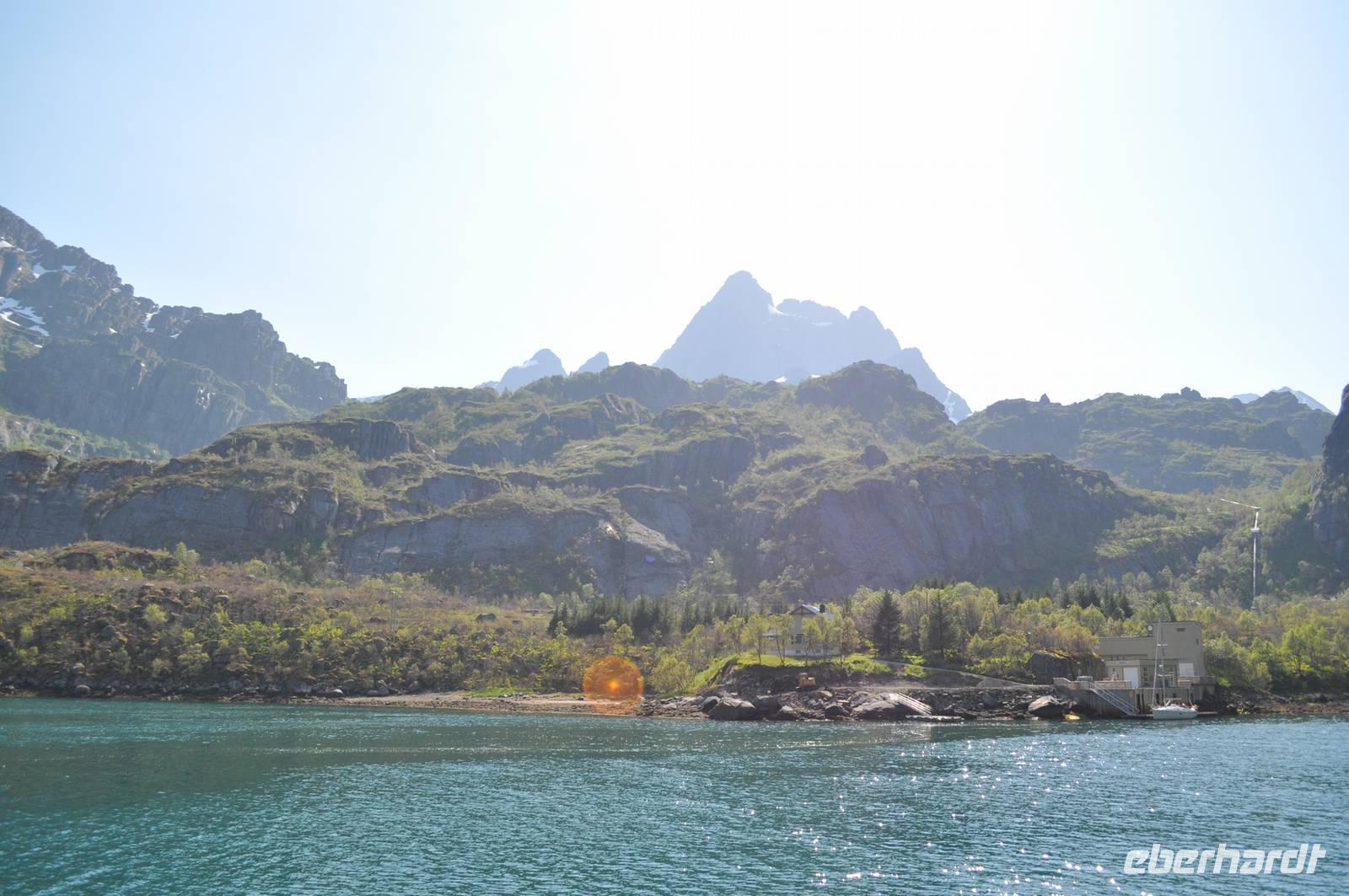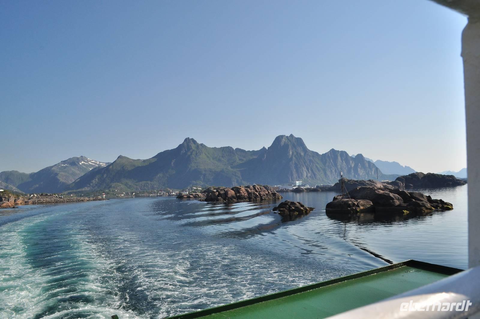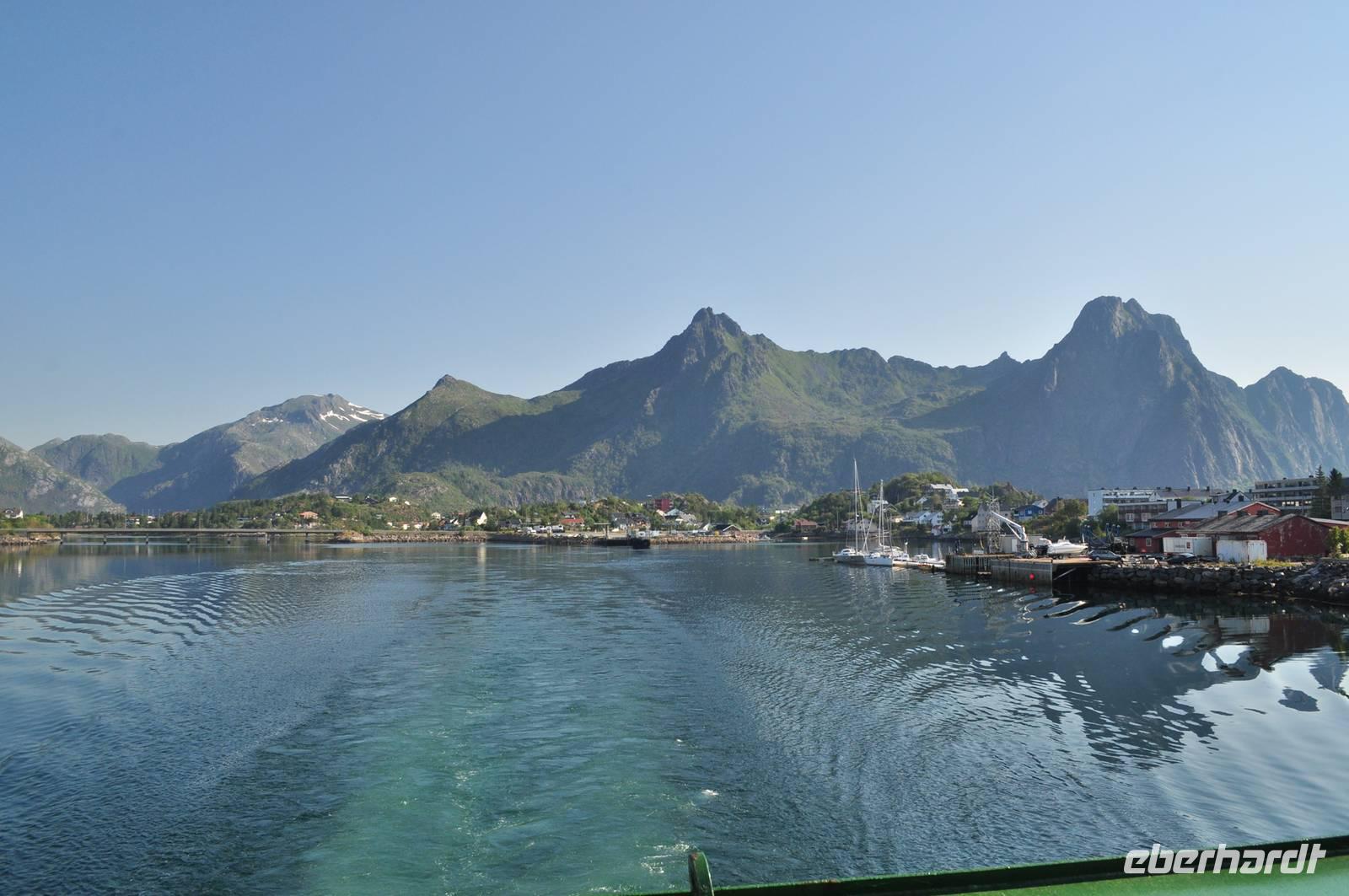 Am Morgen müssen wir die wunderschönen Lofoten verlassen. Wir tun es standesgemäß mit dem Schiff. Die Fähre führt gut zwei Stunden über den Vestfjorden von Svolvær nach Skutvik mit Zwischenstopp in Skrova. Mit zunehmenden Abstand zu den Lofoten verstehen wir den Begriff "Lofotwand", von der Ferne meint man, der Lofot Archipel sei eine kompakte Felswand mitten im Meer. Erst wenn man sich nähert erkennt man die schmalen Durchlässe zwischen den Inseln.