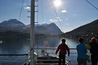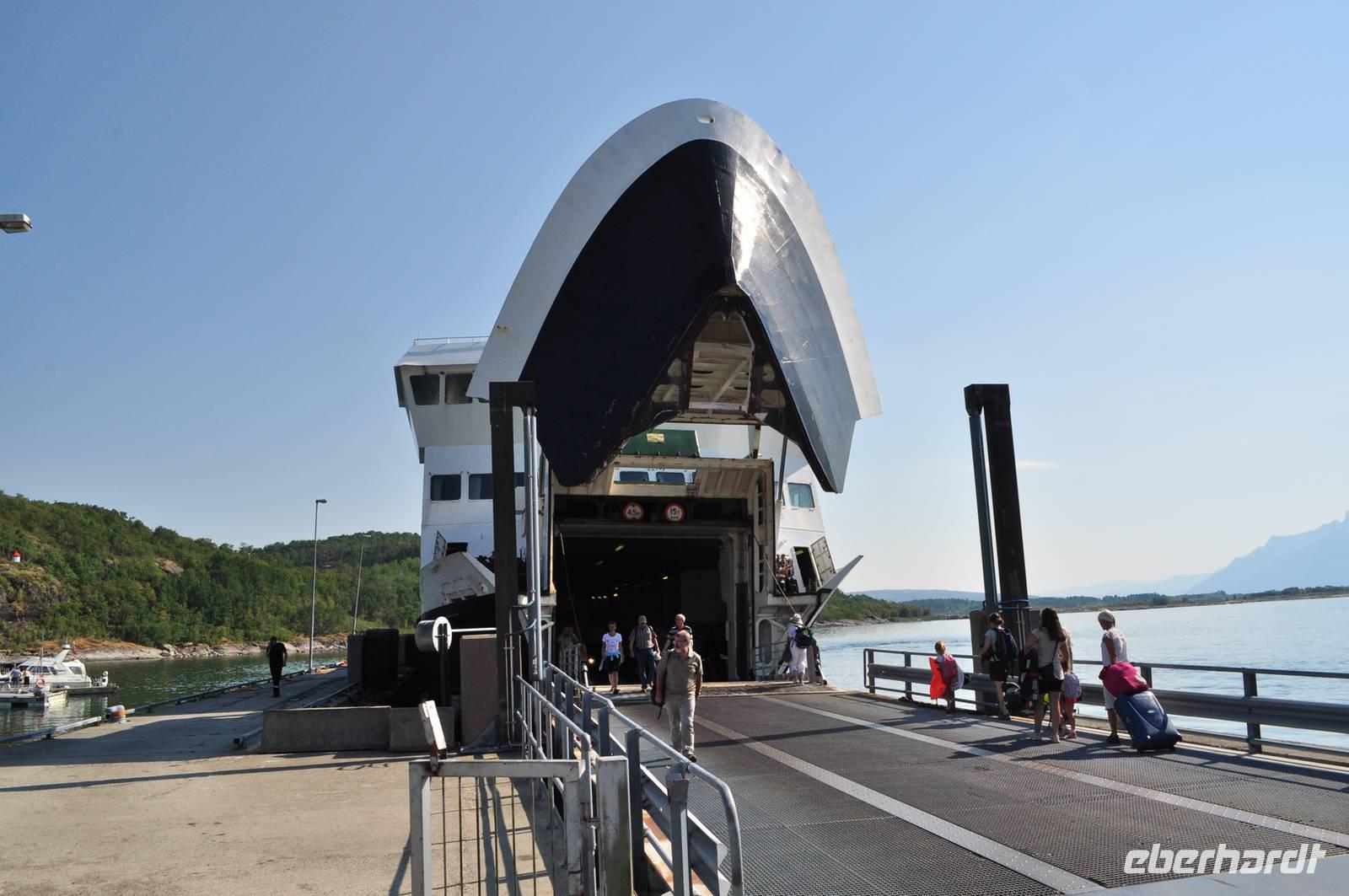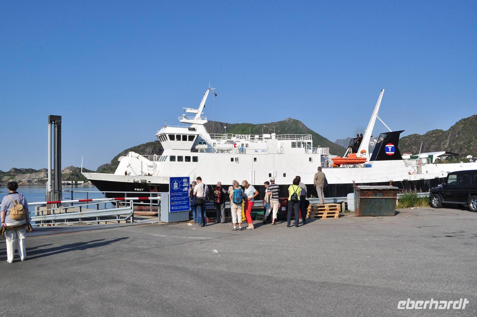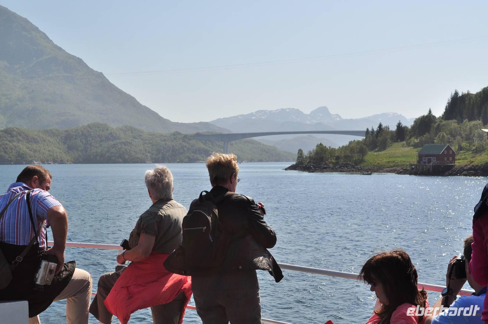 Am Morgen müssen wir die wunderschönen Lofoten verlassen. Wir tun es standesgemäß mit dem Schiff. Die Fähre führt gut zwei Stunden über den Vestfjorden von Svolvær nach Skutvik mit Zwischenstopp in Skrova. Mit zunehmenden Abstand zu den Lofoten verstehen wir den Begriff "Lofotwand", von der Ferne meint man, der Lofot Archipel sei eine kompakte Felswand mitten im Meer. Erst wenn man sich nähert erkennt man die schmalen Durchlässe zwischen den Inseln.