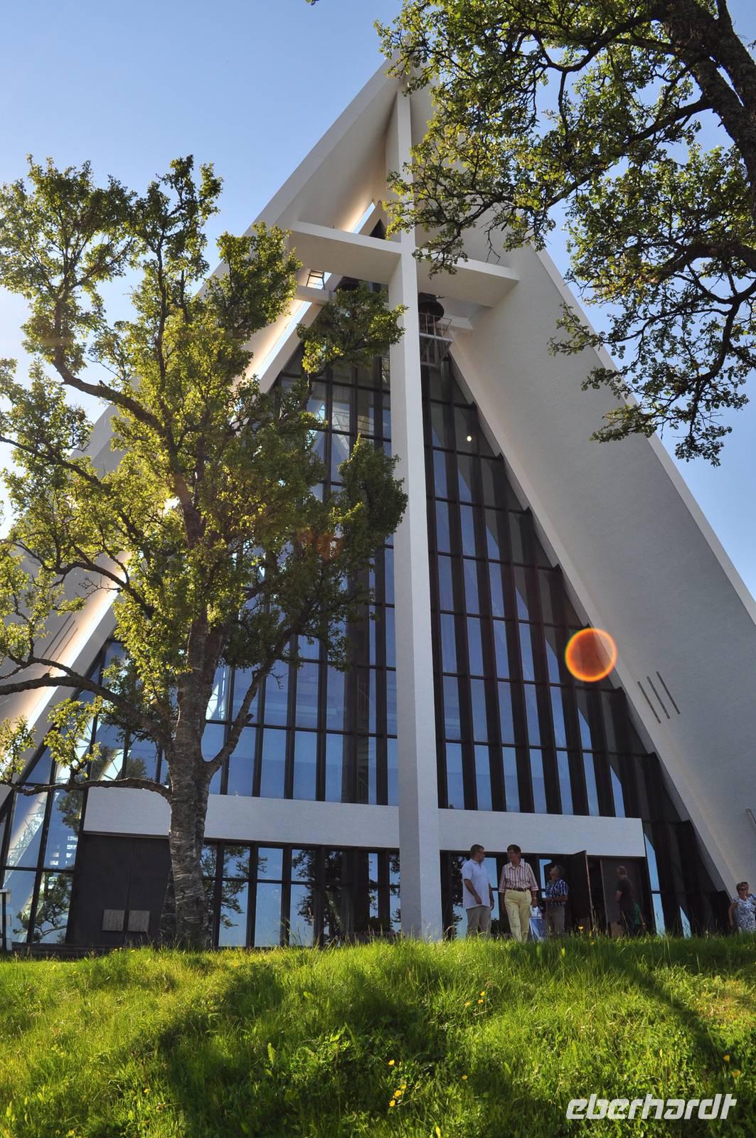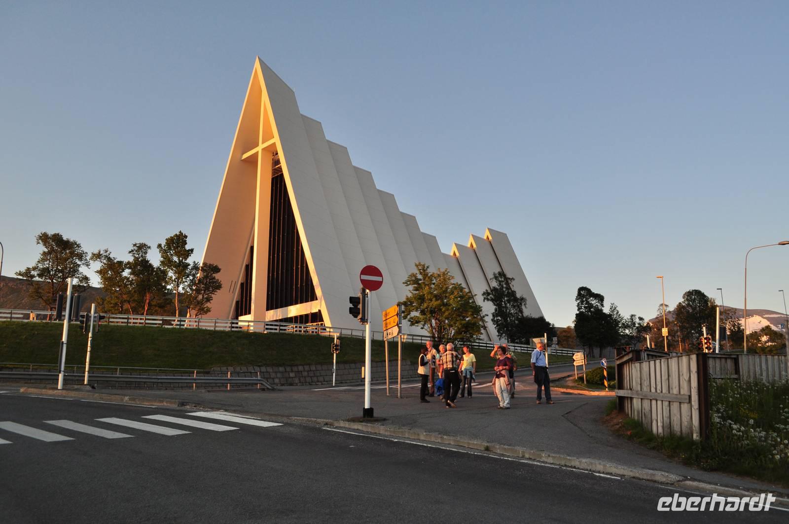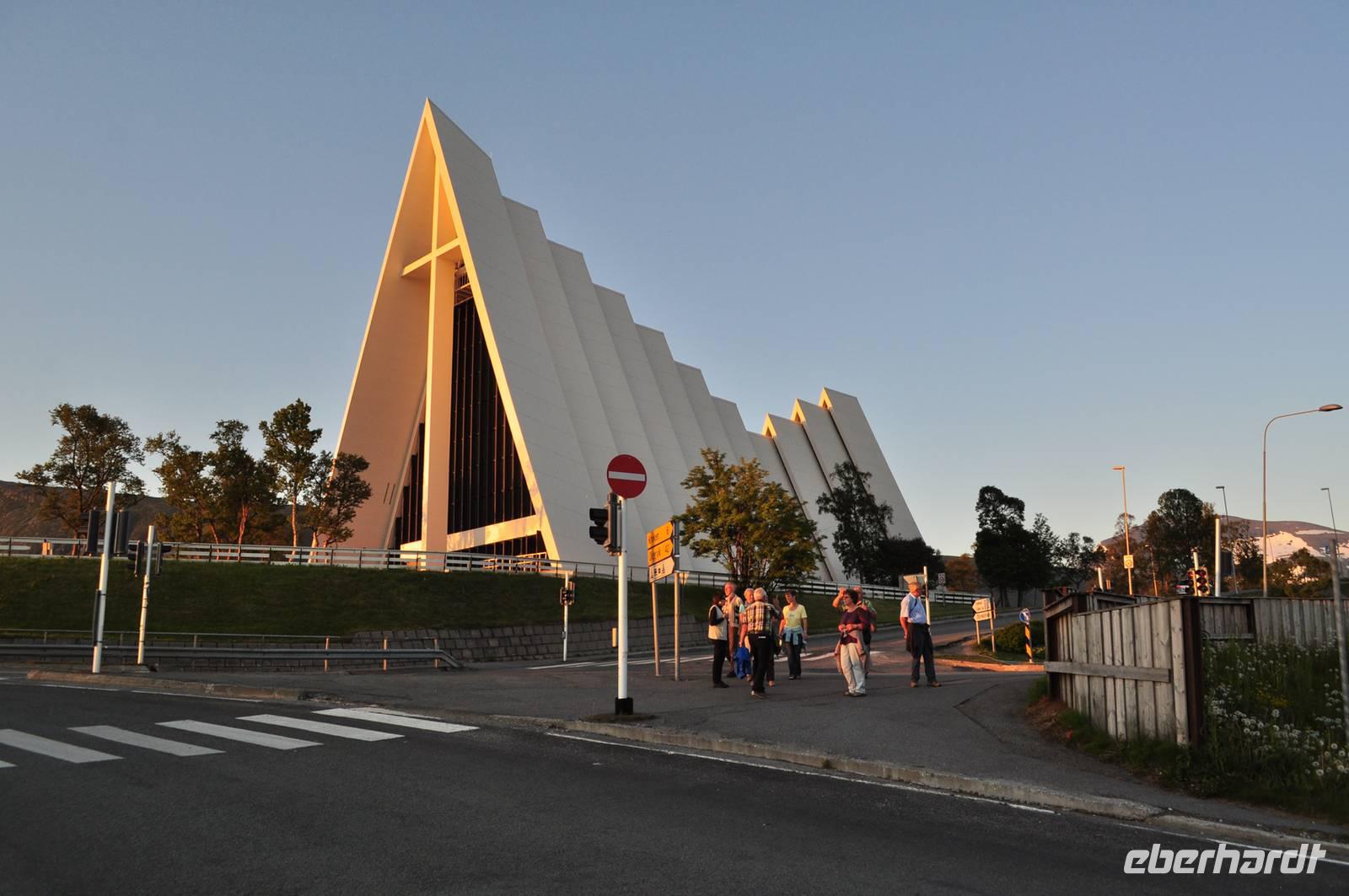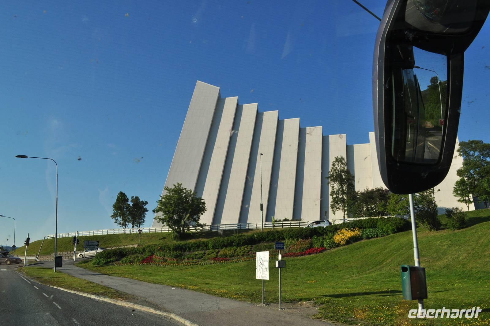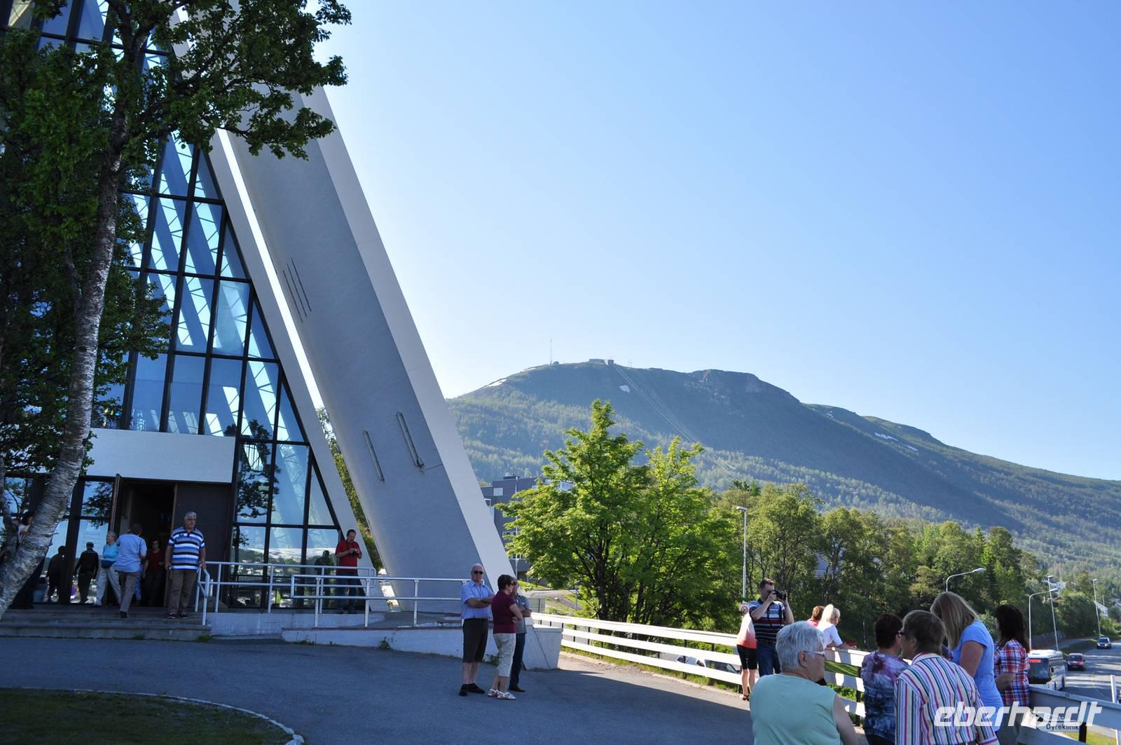 Der Morgen beginnt nach dem Frühstück mit einem Fotostopp an der Tromsdalen kirkke unter dessen Namen sie niemand kennt. Sagt man Eismeerkathedrale wissen die meisten sofort Bescheid. Einige Gäste nutzen Ihre Chance und gehen hinein und bestaunen das größte Buntglasfenster Europas.