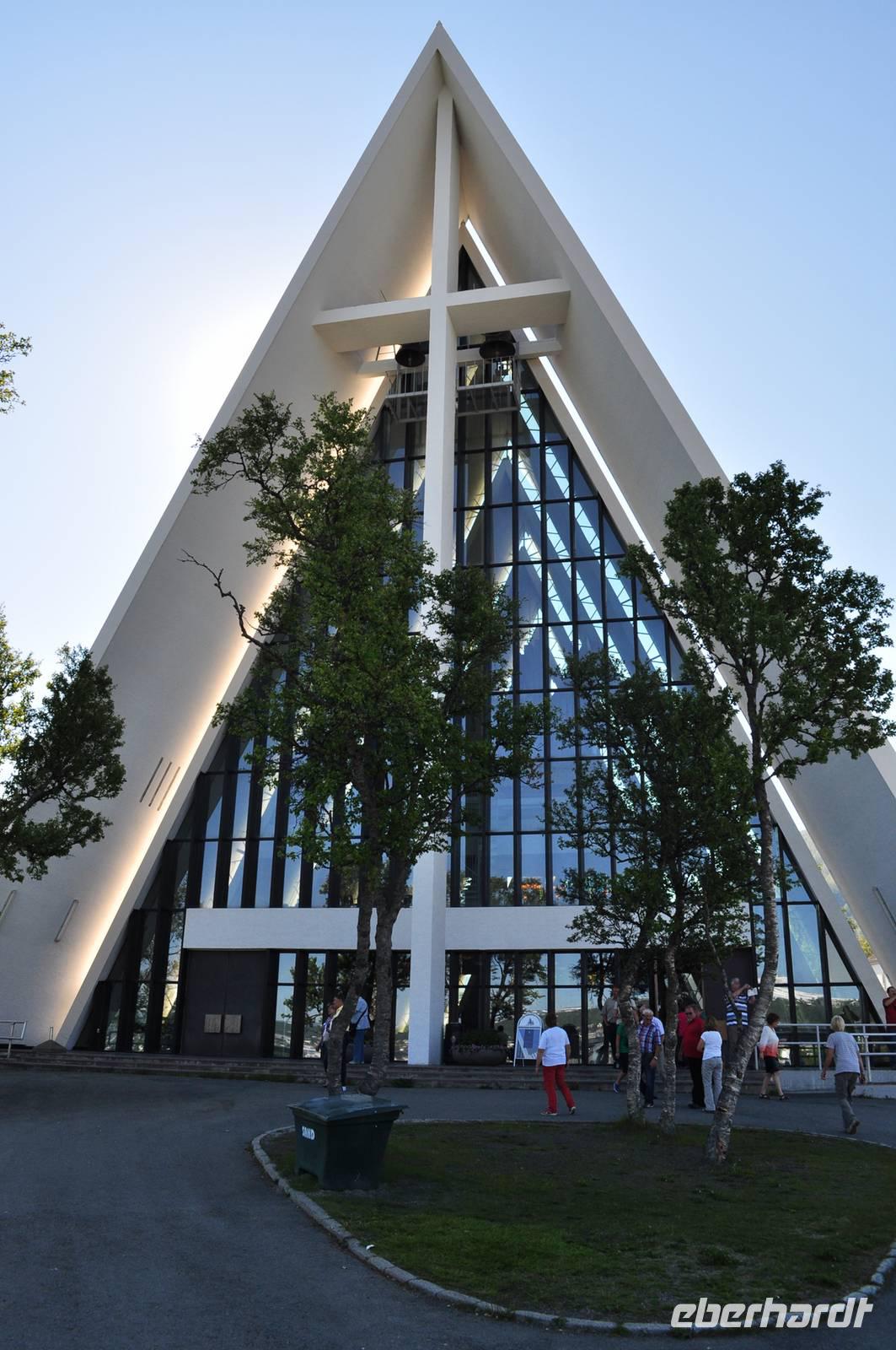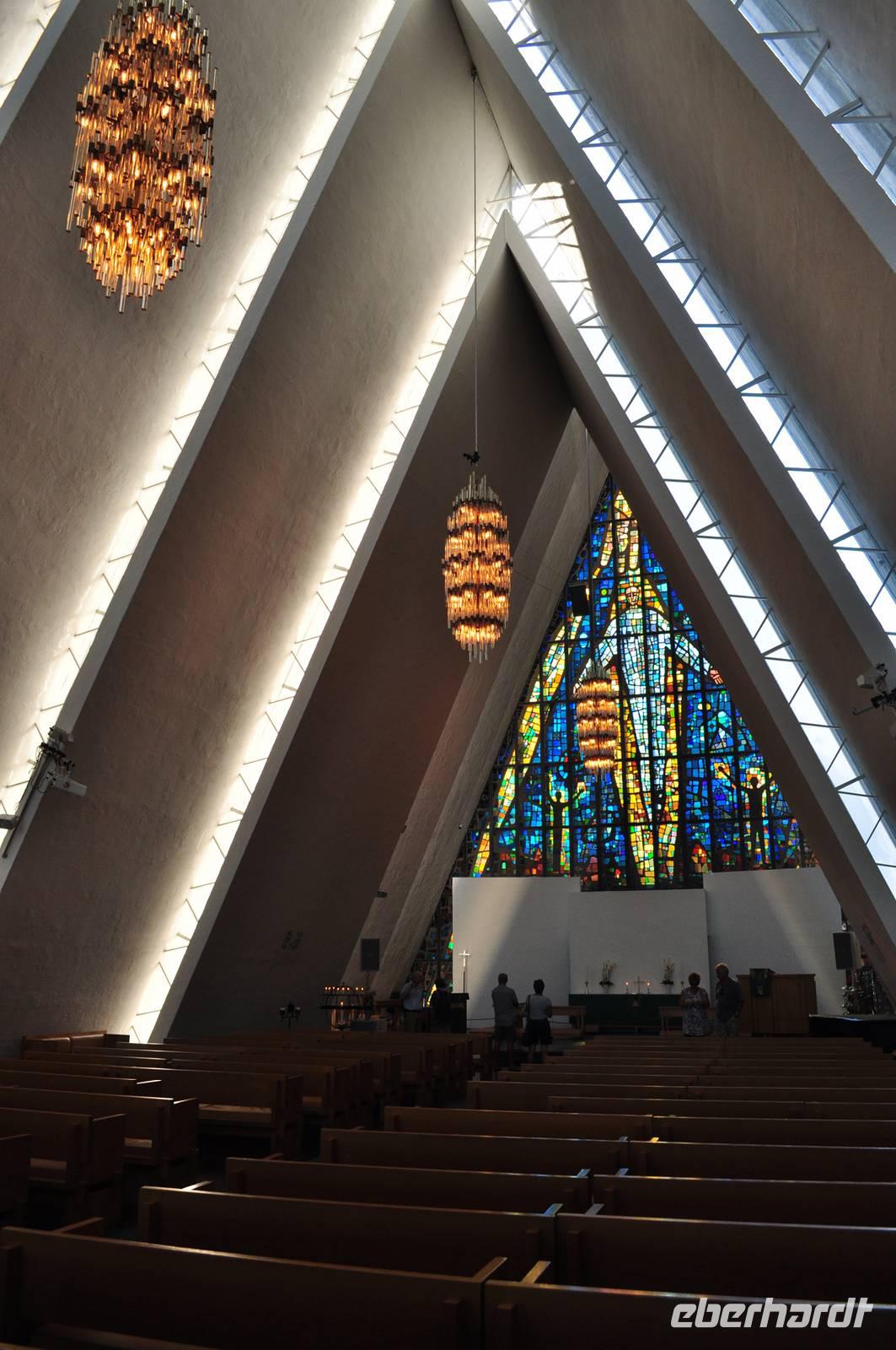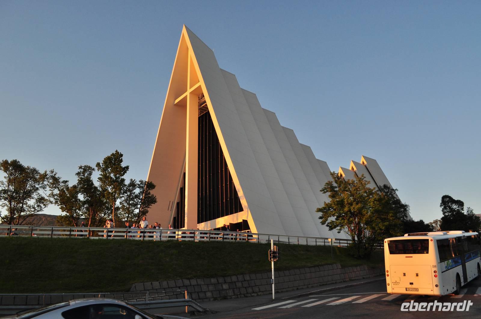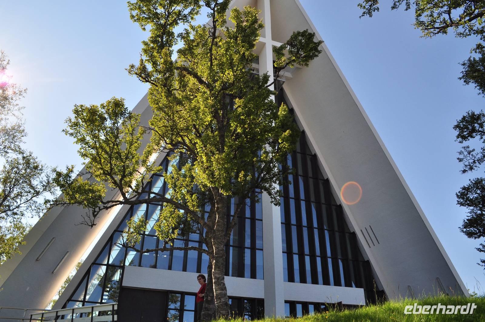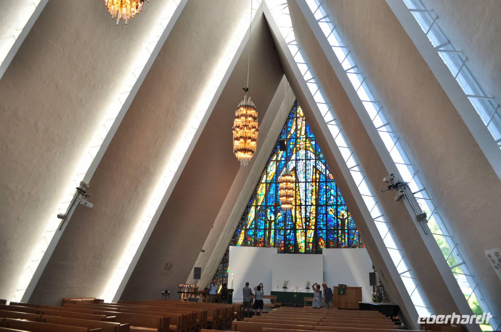 Der Morgen beginnt nach dem Frühstück mit einem Fotostopp an der Tromsdalen kirkke unter dessen Namen sie niemand kennt. Sagt man Eismeerkathedrale wissen die meisten sofort Bescheid. Einige Gäste nutzen Ihre Chance und gehen hinein und bestaunen das größte Buntglasfenster Europas.