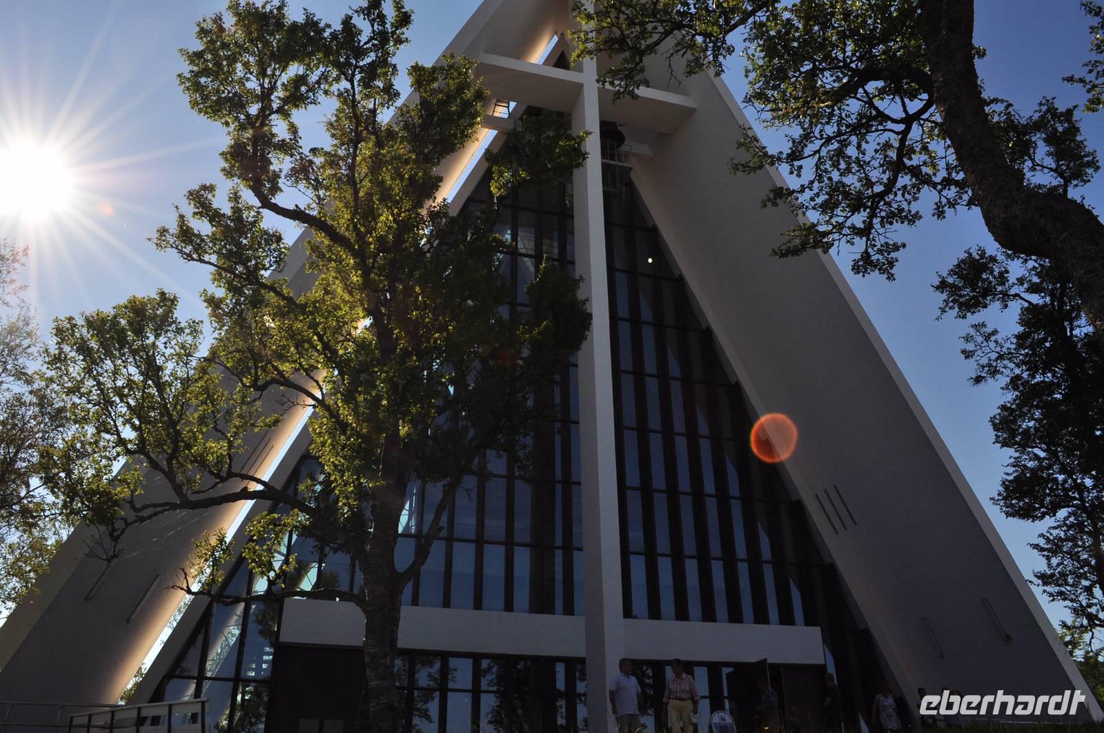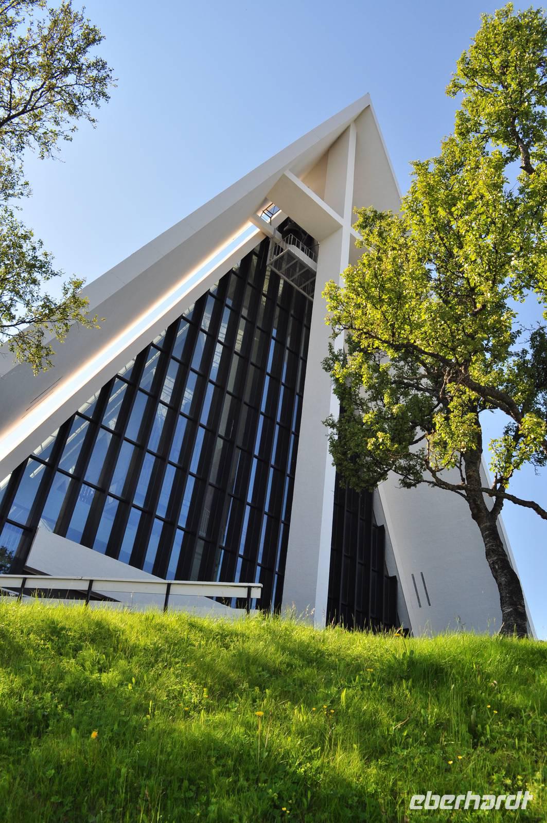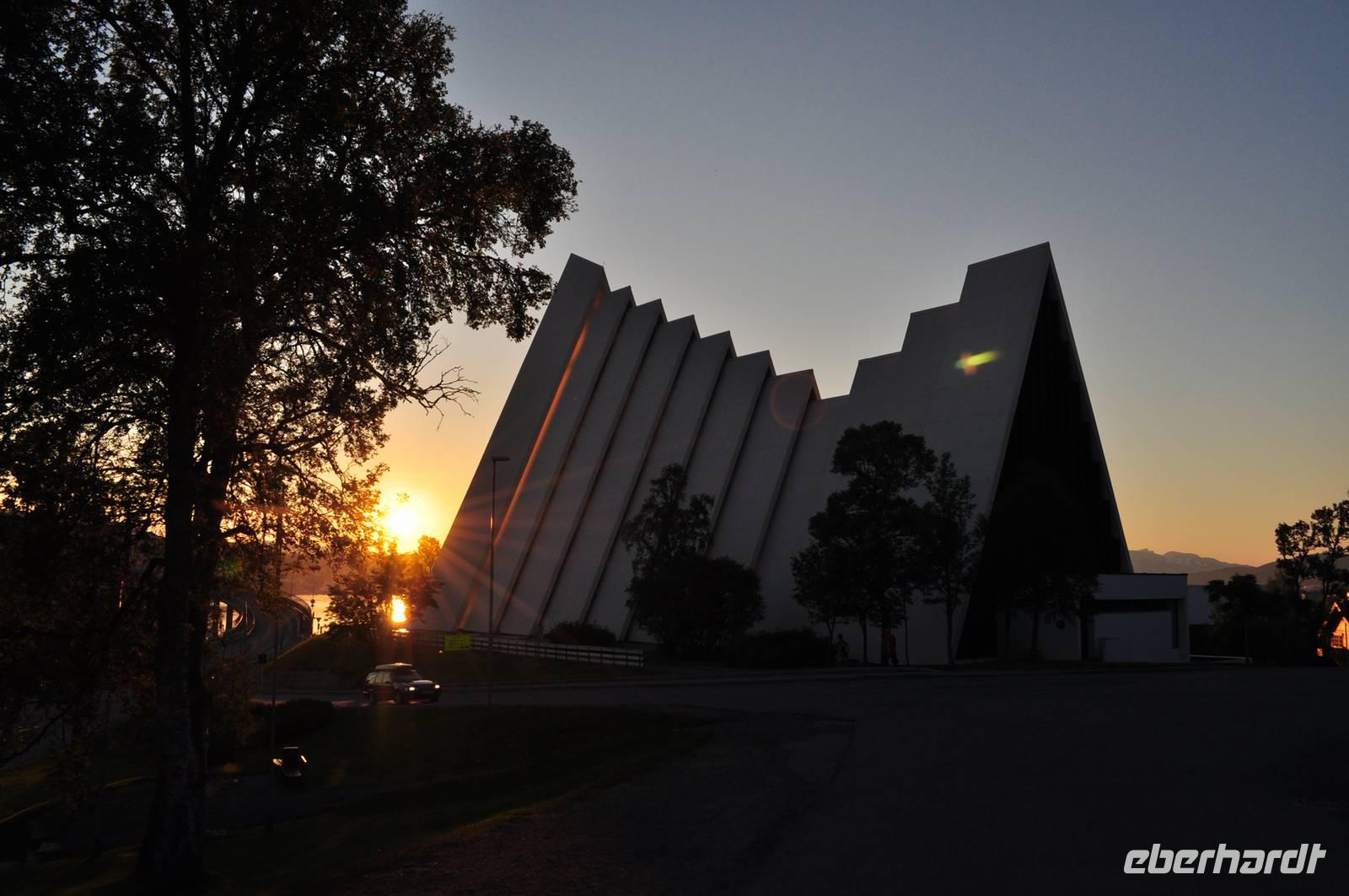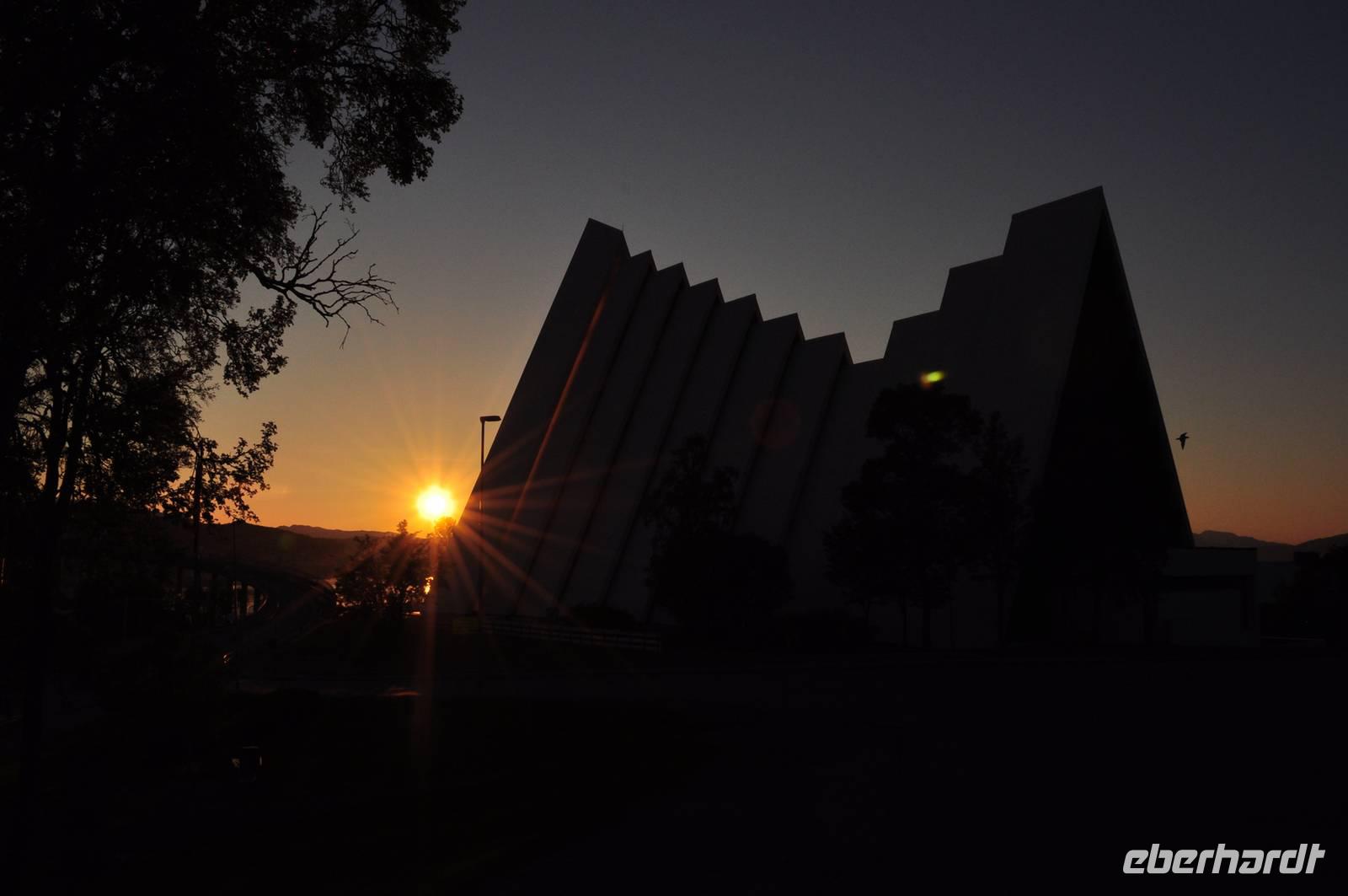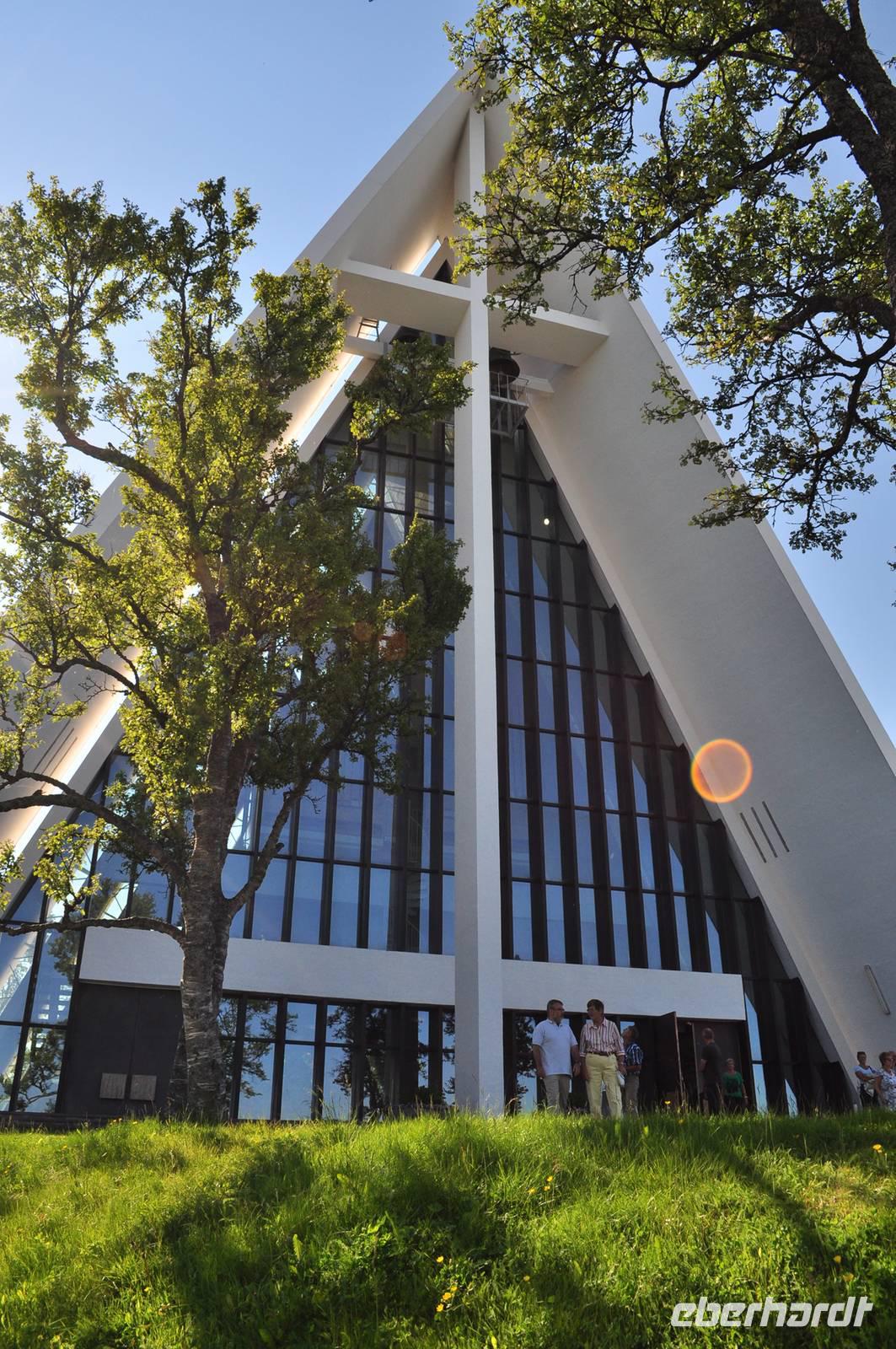 Der Morgen beginnt nach dem Frühstück mit einem Fotostopp an der Tromsdalen kirkke unter dessen Namen sie niemand kennt. Sagt man Eismeerkathedrale wissen die meisten sofort Bescheid. Einige Gäste nutzen Ihre Chance und gehen hinein und bestaunen das größte Buntglasfenster Europas.