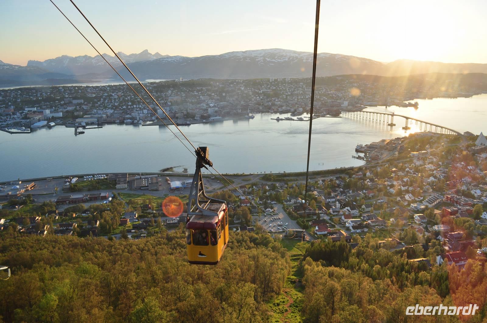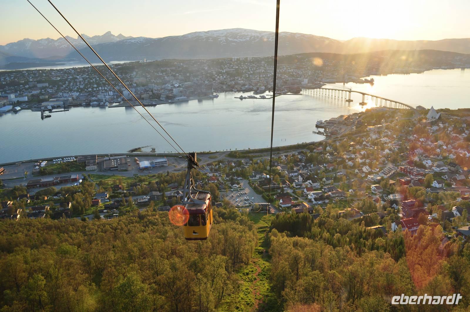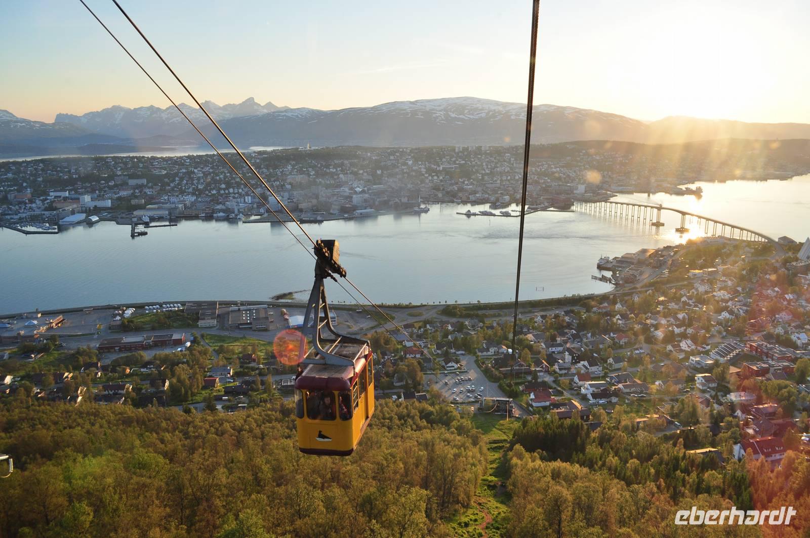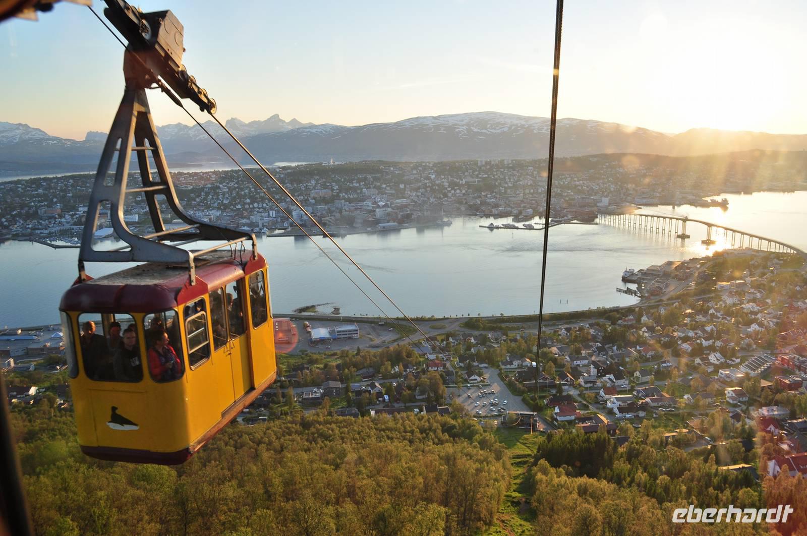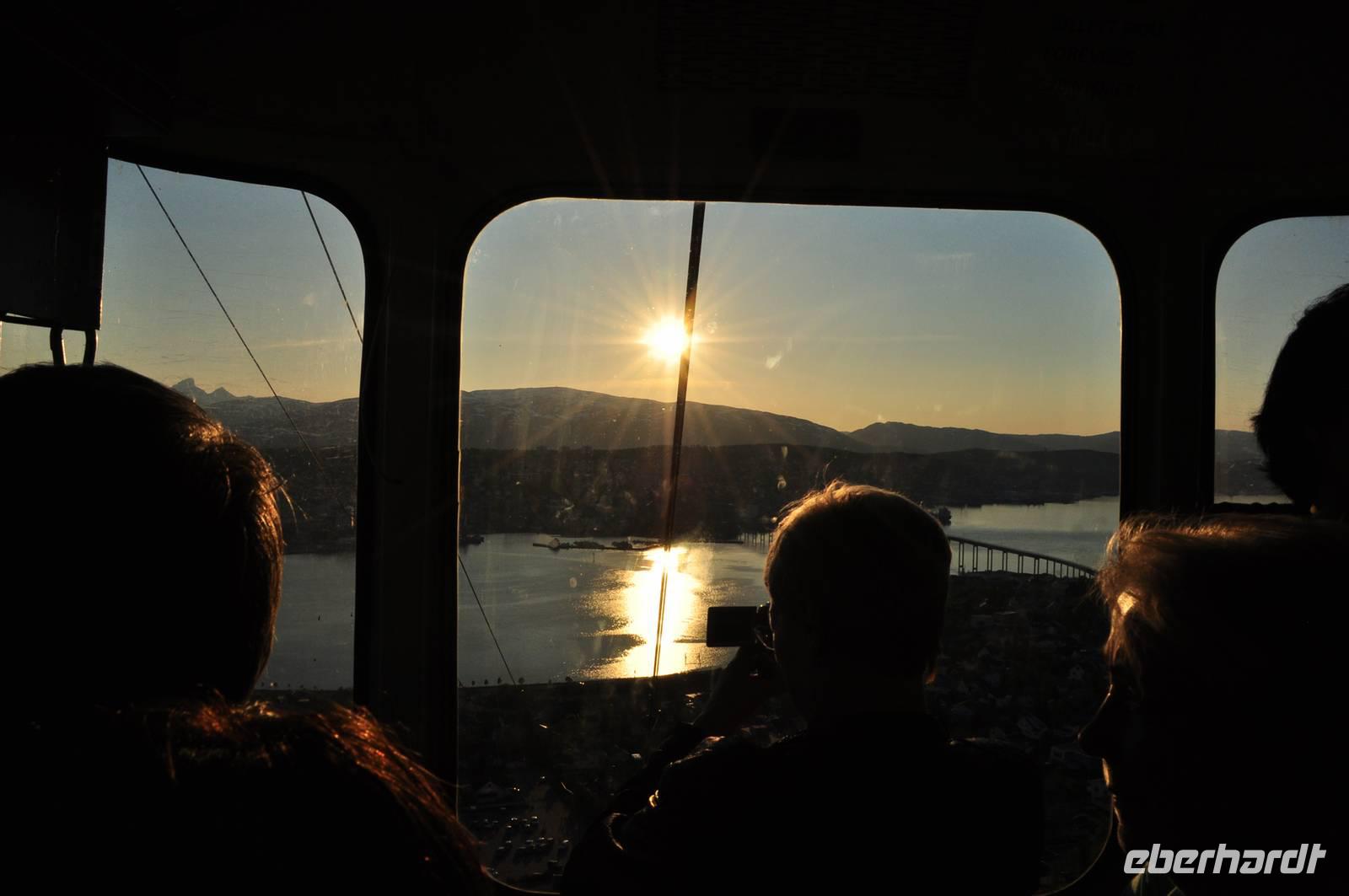 Auch heute gibt es einen Abendspaziergang. Der Linienbus bringt uns zum Festland und zu einer Seilbahnstation. Die Kabelbahn befördert uns hinauf zum Fjellheisen, einem der schönsten Aussichtspunkte von Tromsø.
