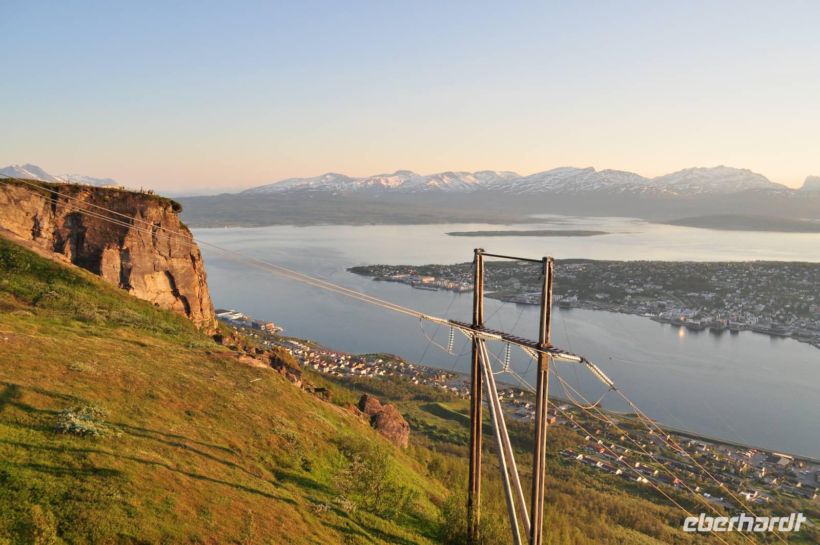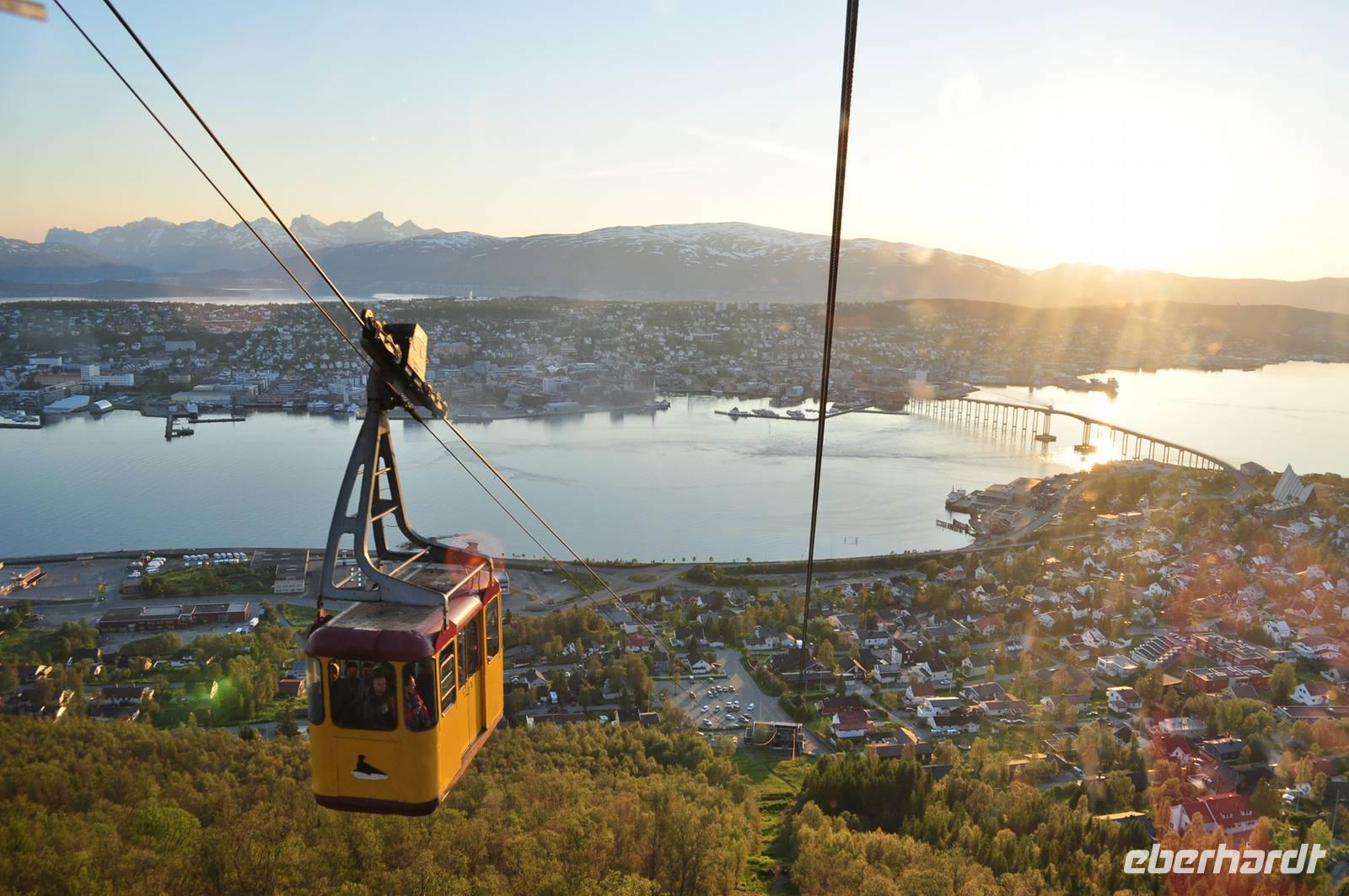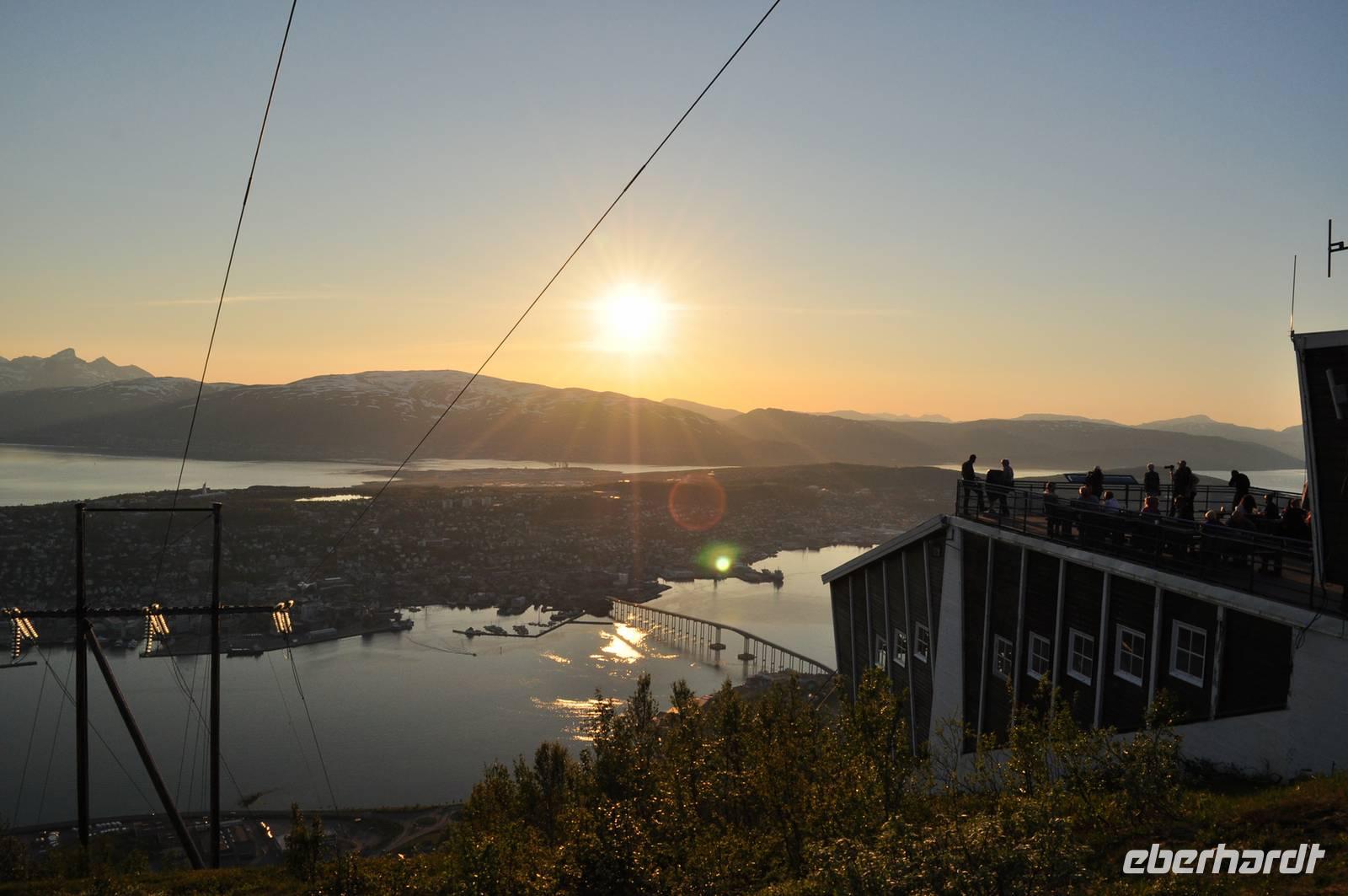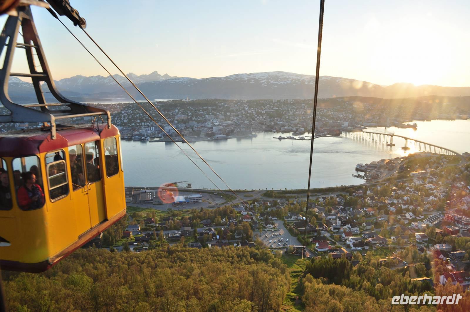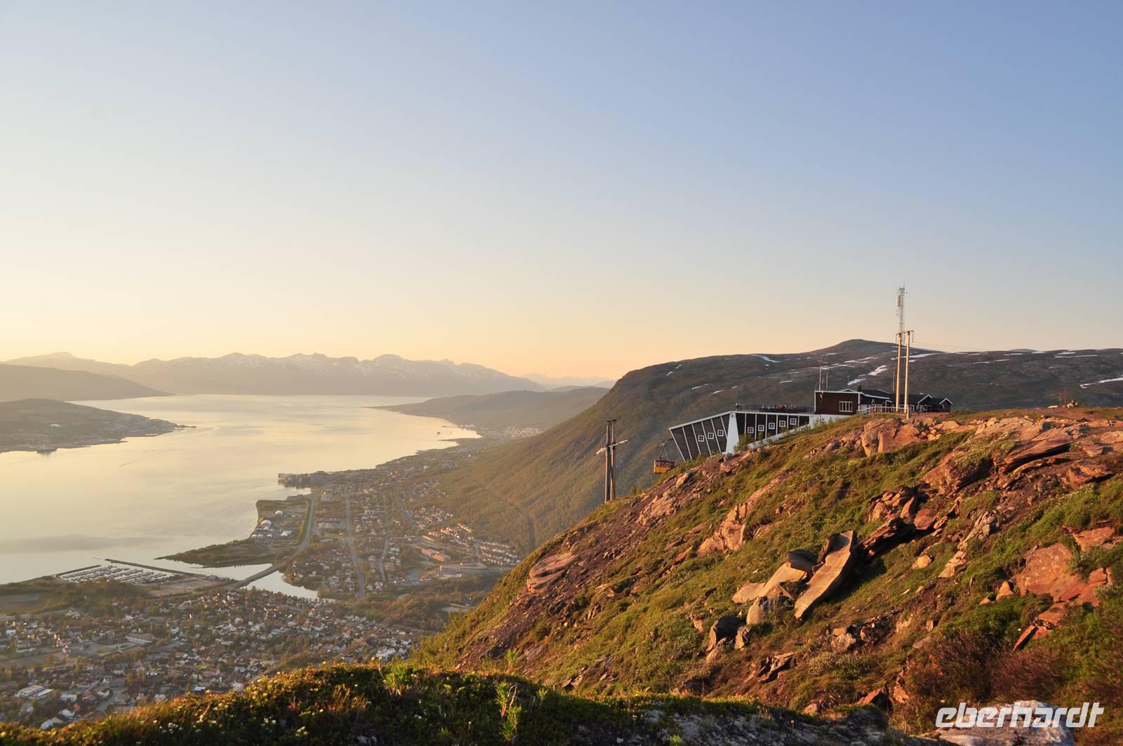 Auch heute gibt es einen Abendspaziergang. Der Linienbus bringt uns zum Festland und zu einer Seilbahnstation. Die Kabelbahn befördert uns hinauf zum Fjellheisen, einem der schönsten Aussichtspunkte von Tromsø.