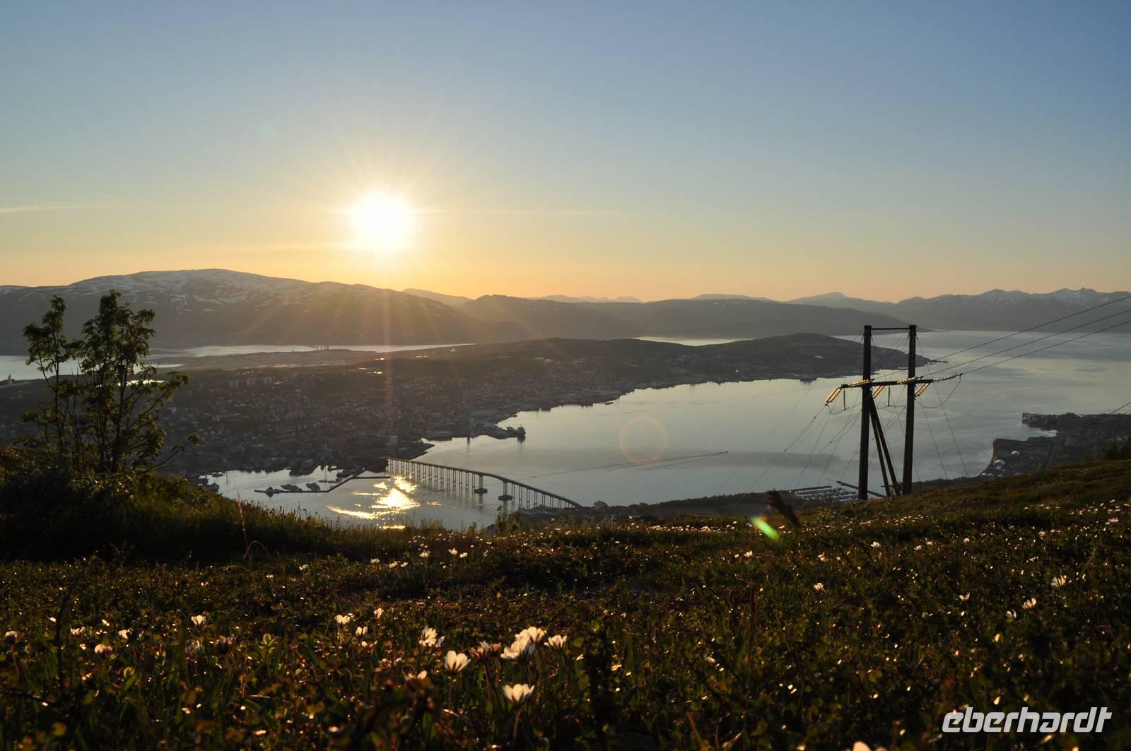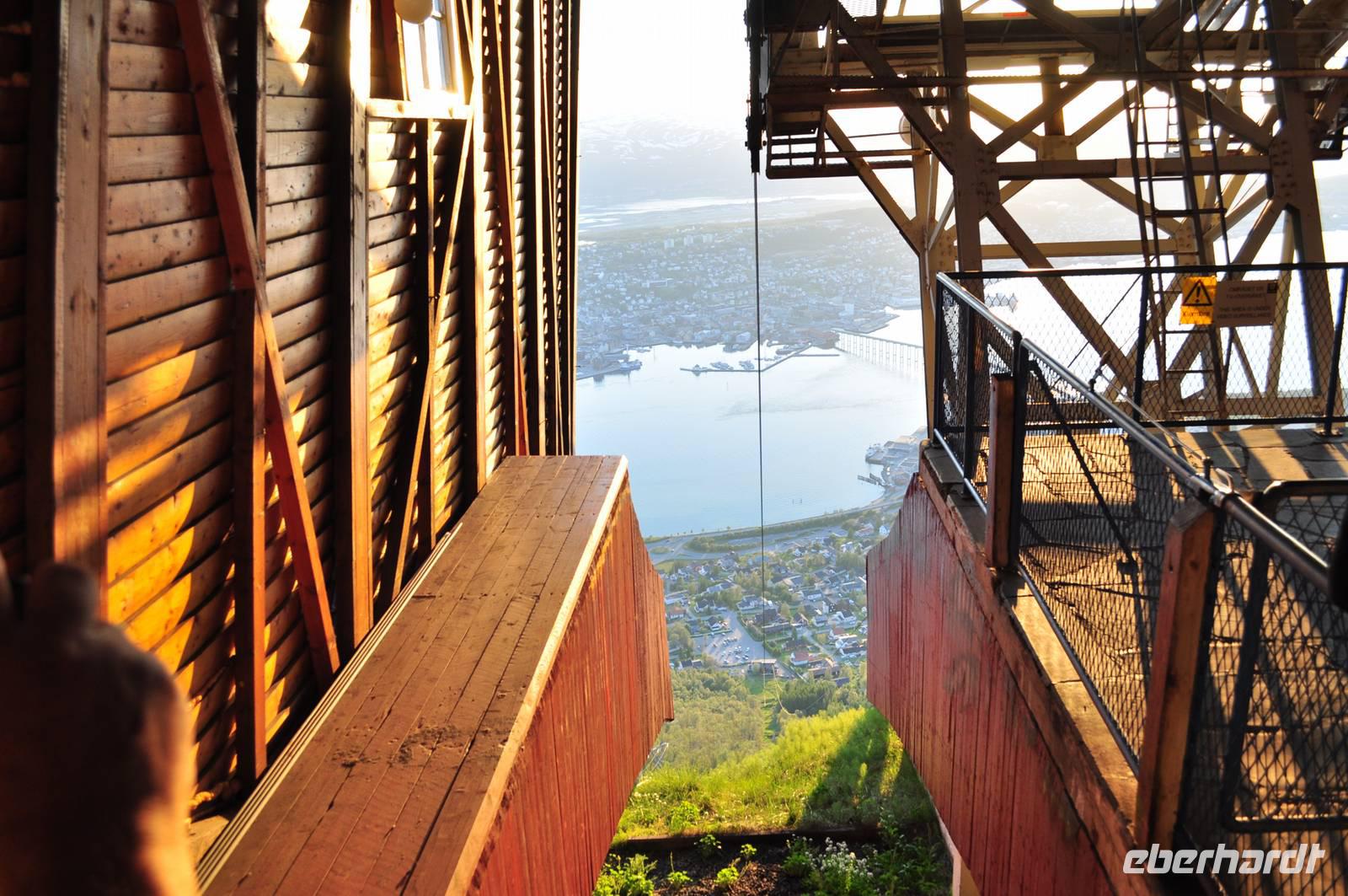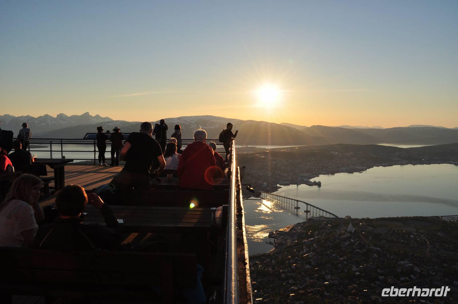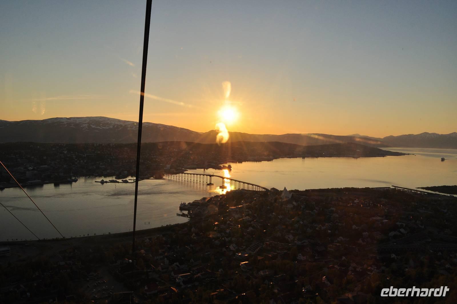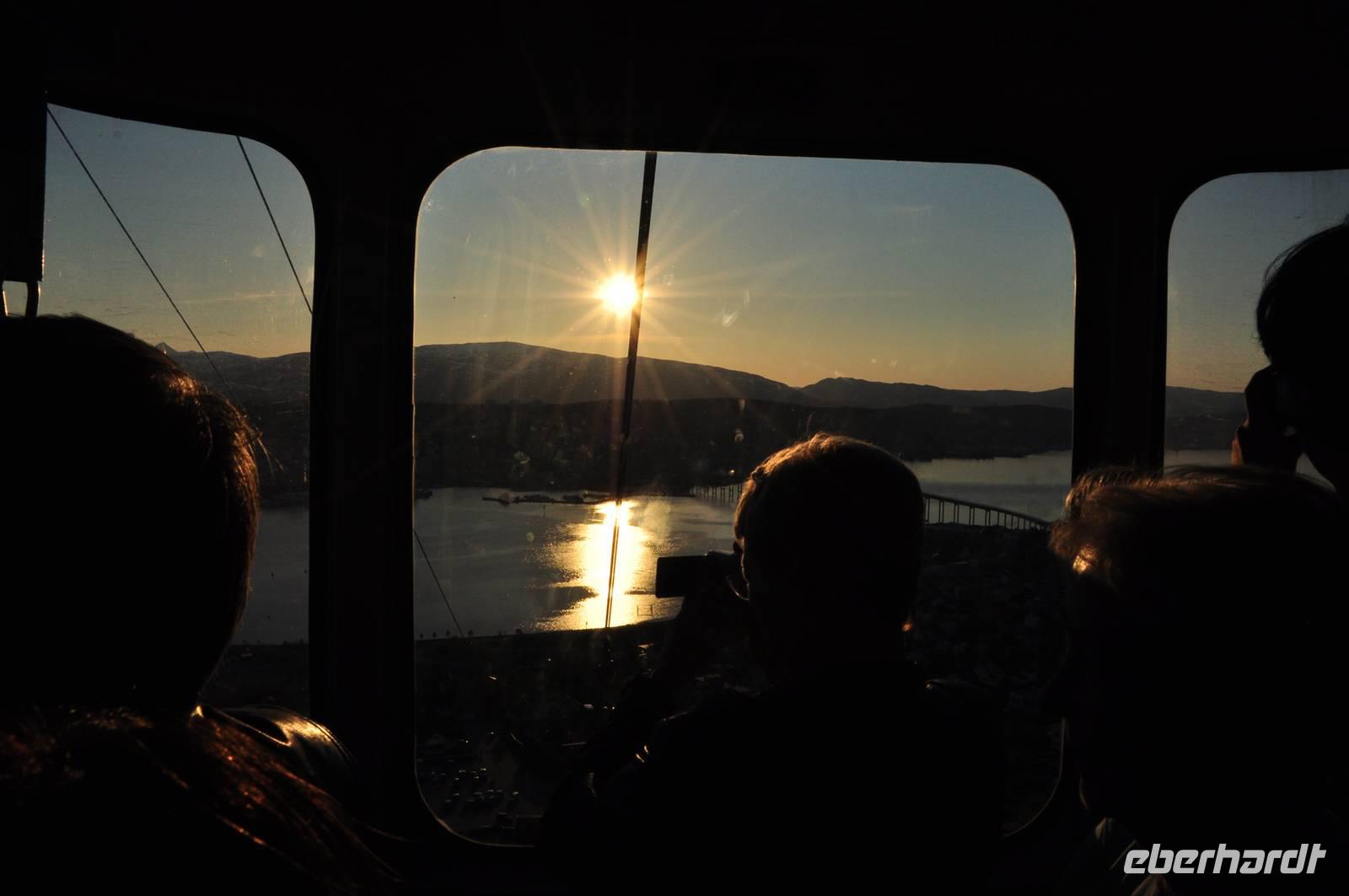 Auch heute gibt es einen Abendspaziergang. Der Linienbus bringt uns zum Festland und zu einer Seilbahnstation. Die Kabelbahn befördert uns hinauf zum Fjellheisen, einem der schönsten Aussichtspunkte von Tromsø.