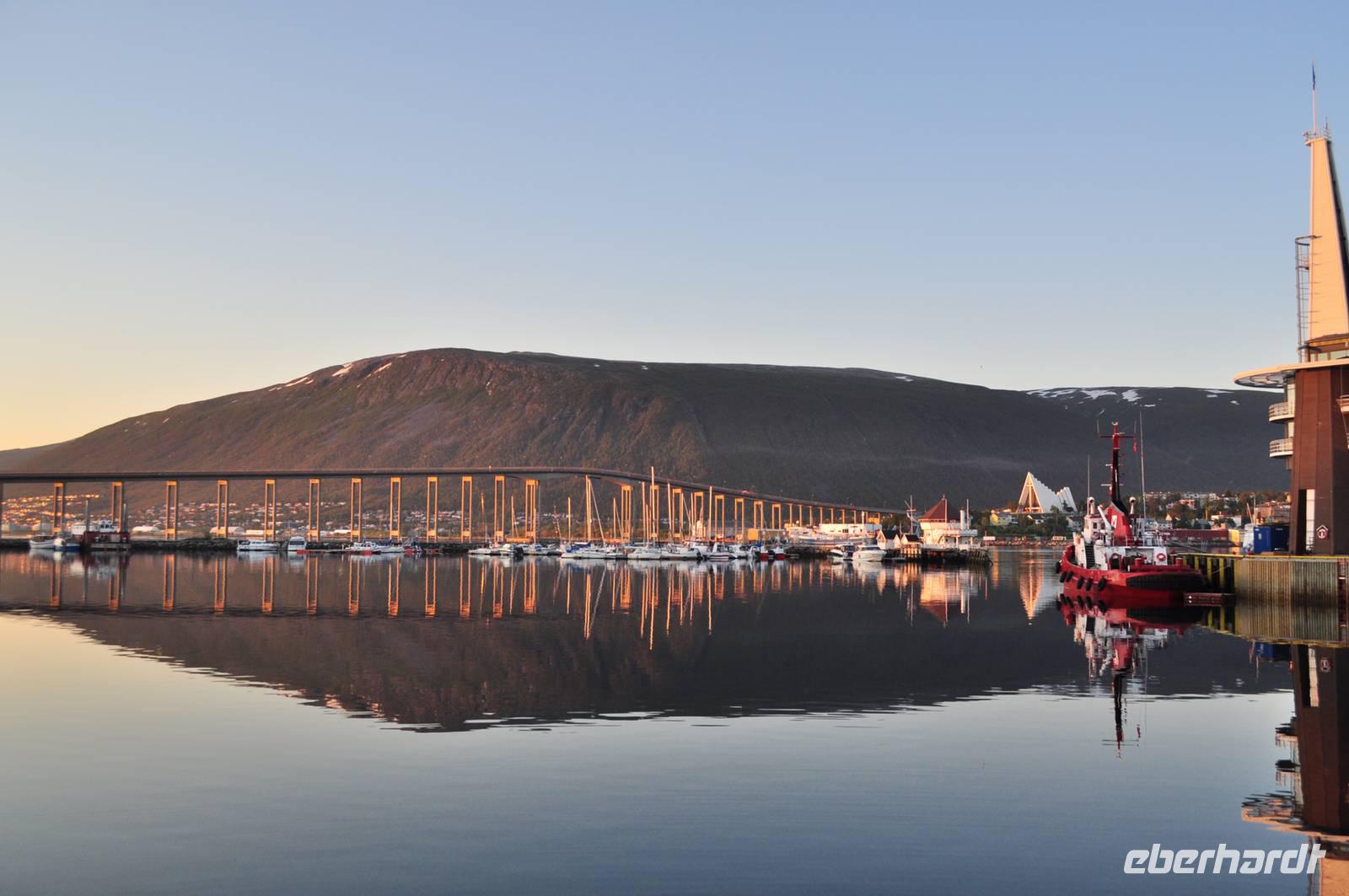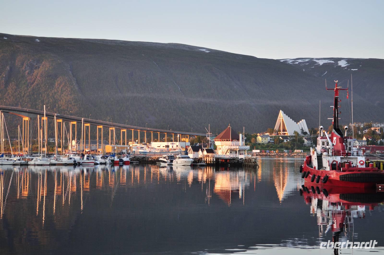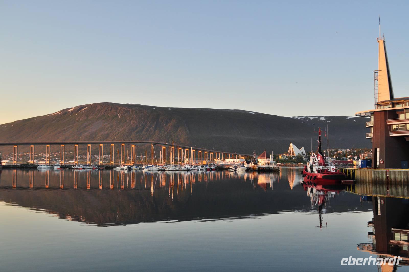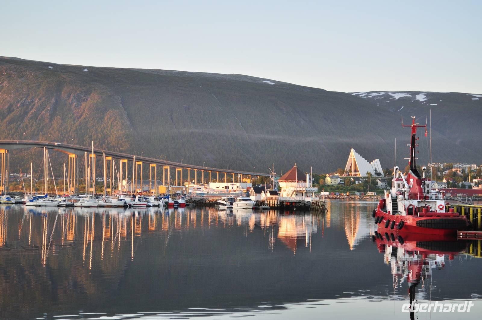 Am Abend erreichen wir die wunderbare Polarstadt Tromsø. Wir überqueren die Tromsø Bru und erreichen die Altstadt auf ihrer Insel mit der großartigen Holzbebauung. Man fühlt sich den großen Polarforschern Nansen, Amundsen und wie sie alle heißen ein wenig näher.