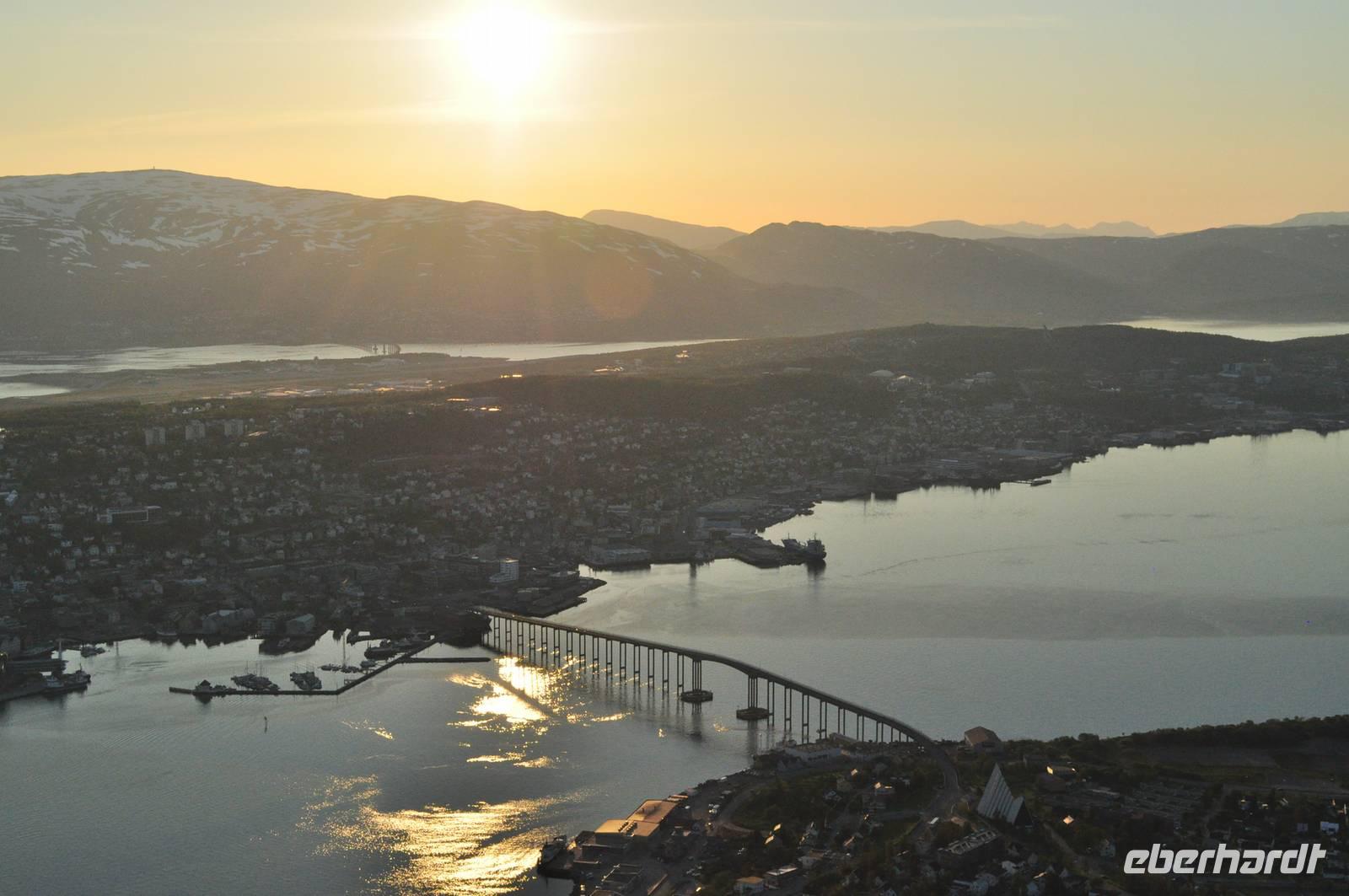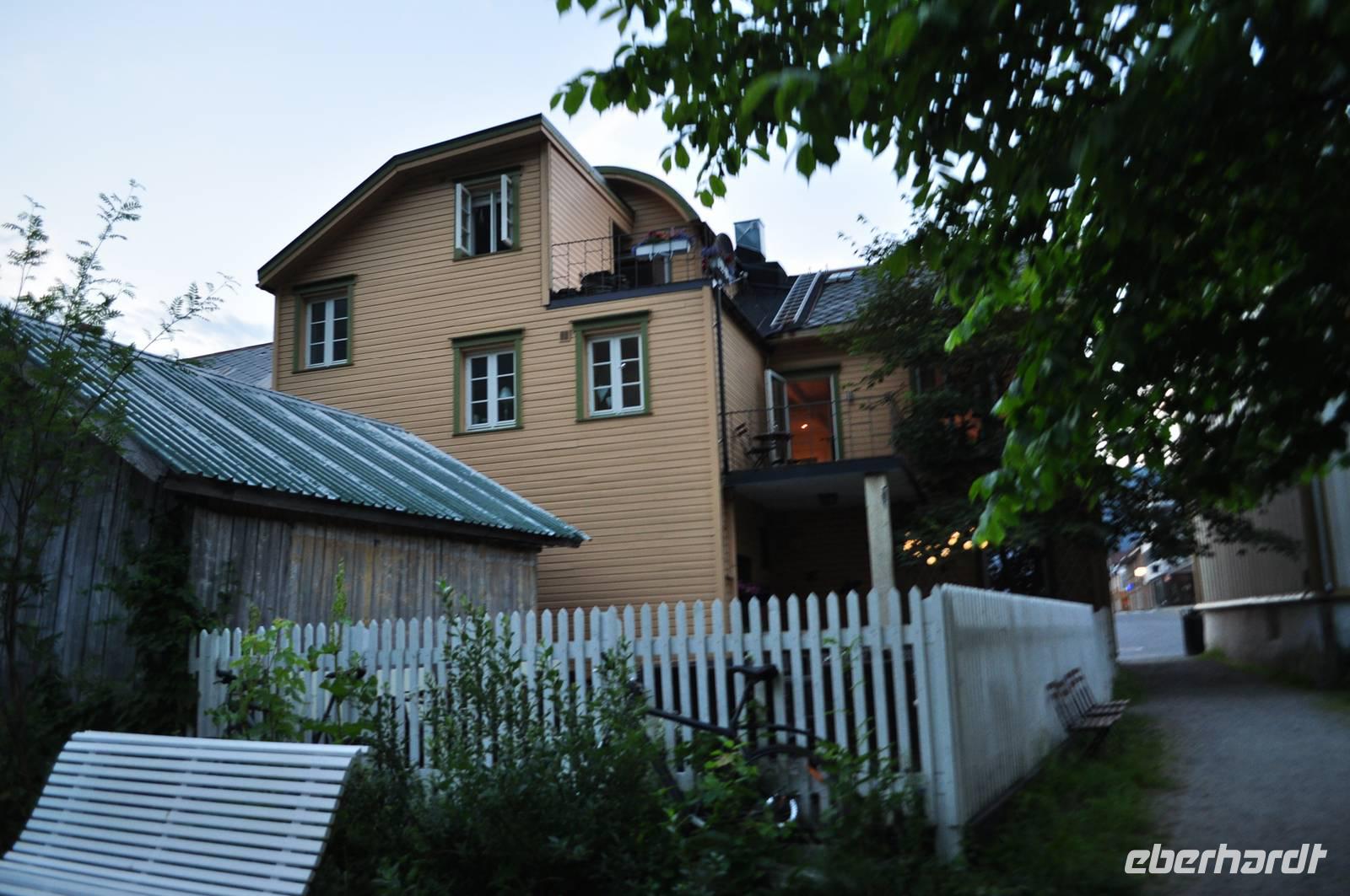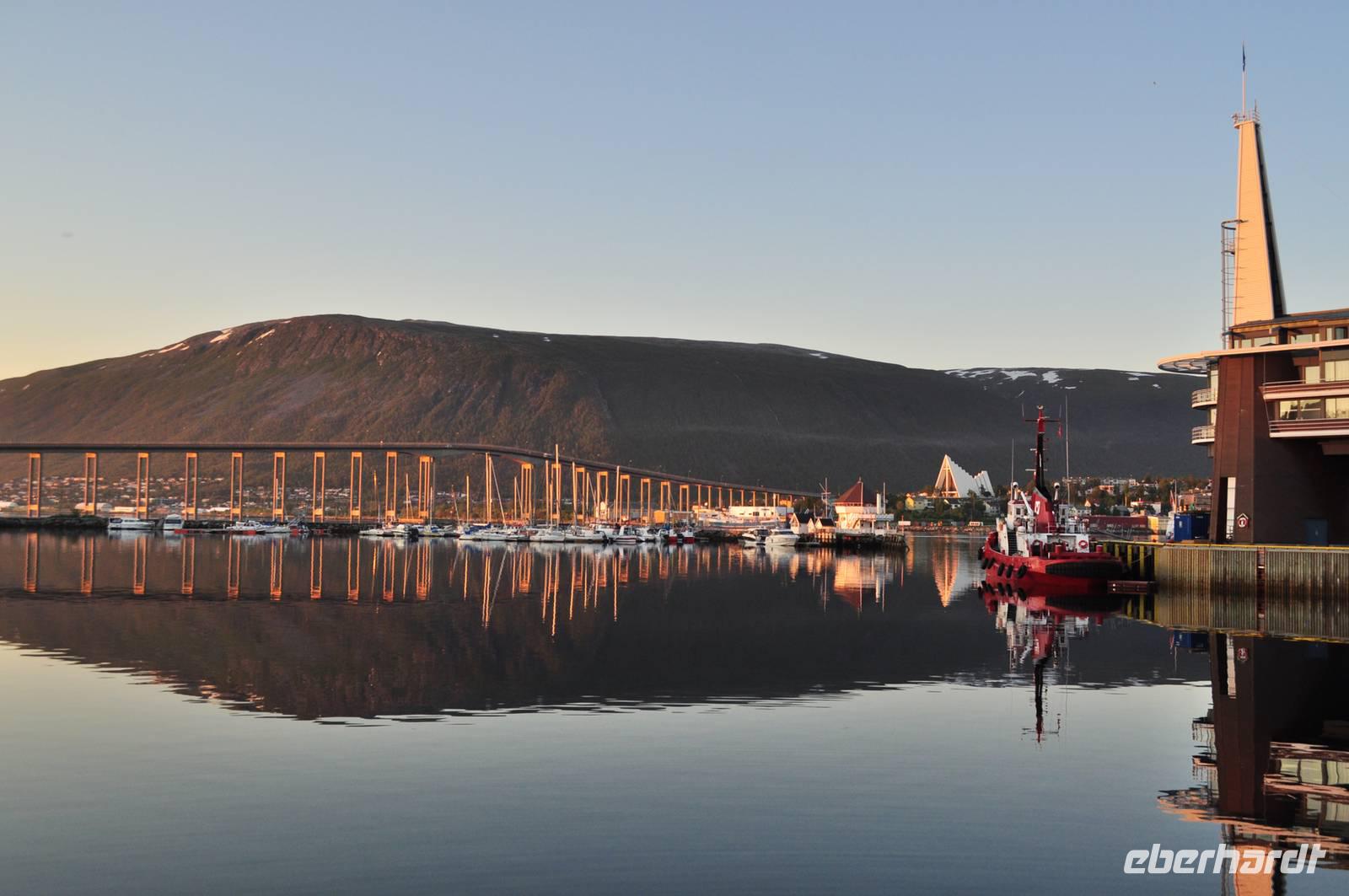 Am Abend erreichen wir die wunderbare Polarstadt Tromsø. Wir überqueren die Tromsø Bru und erreichen die Altstadt auf ihrer Insel mit der großartigen Holzbebauung. Man fühlt sich den großen Polarforschern Nansen, Amundsen und wie sie alle heißen ein wenig näher.