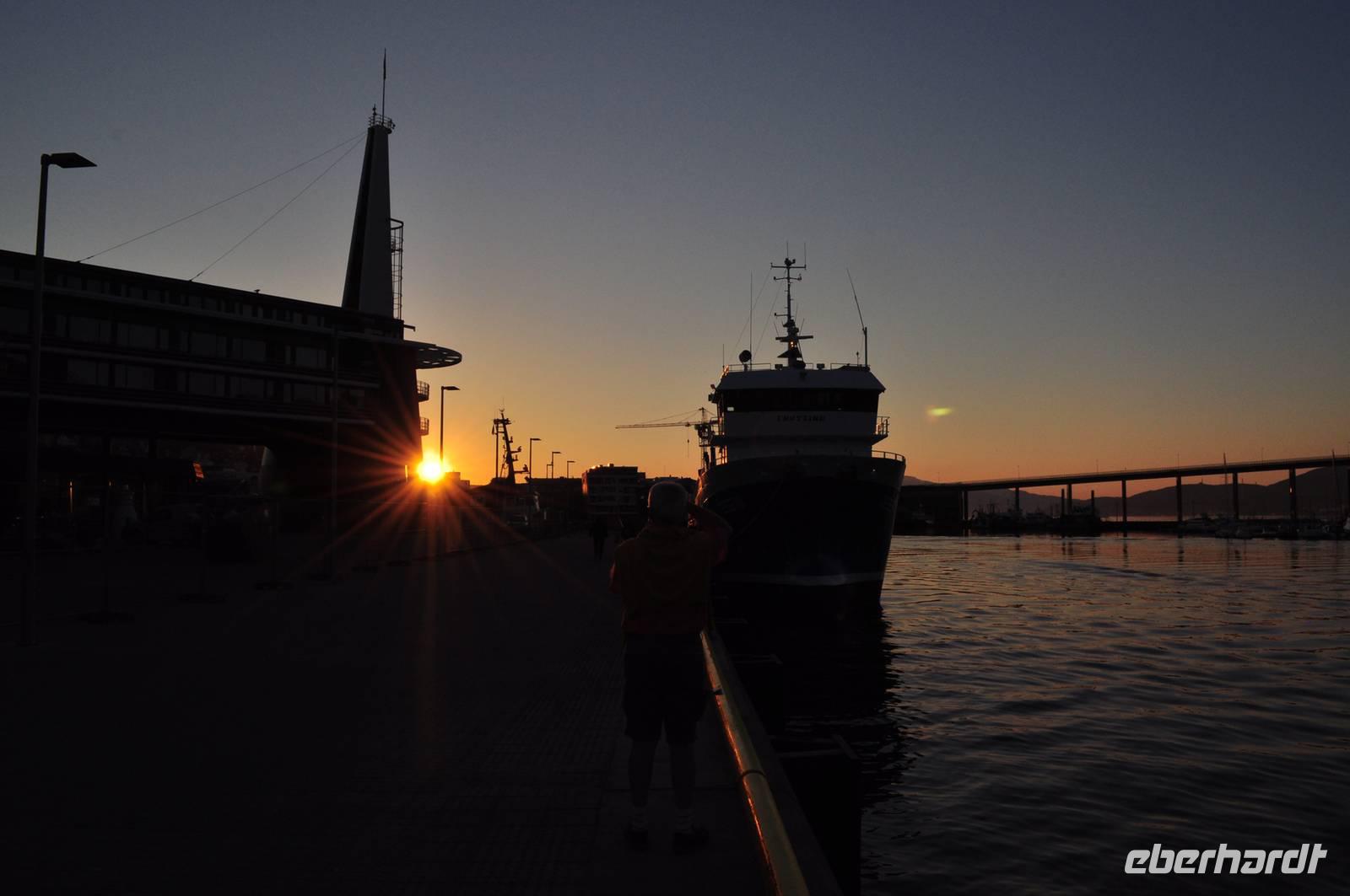 Für die Fluggäste beginnt die letzte Tagesetappe. Zunächst machen wir einen kleinen Abstecher zum Hafen. Hier liegen gerade die MS Midnatsol im Hafen, der Hurtigruten im Hafen.