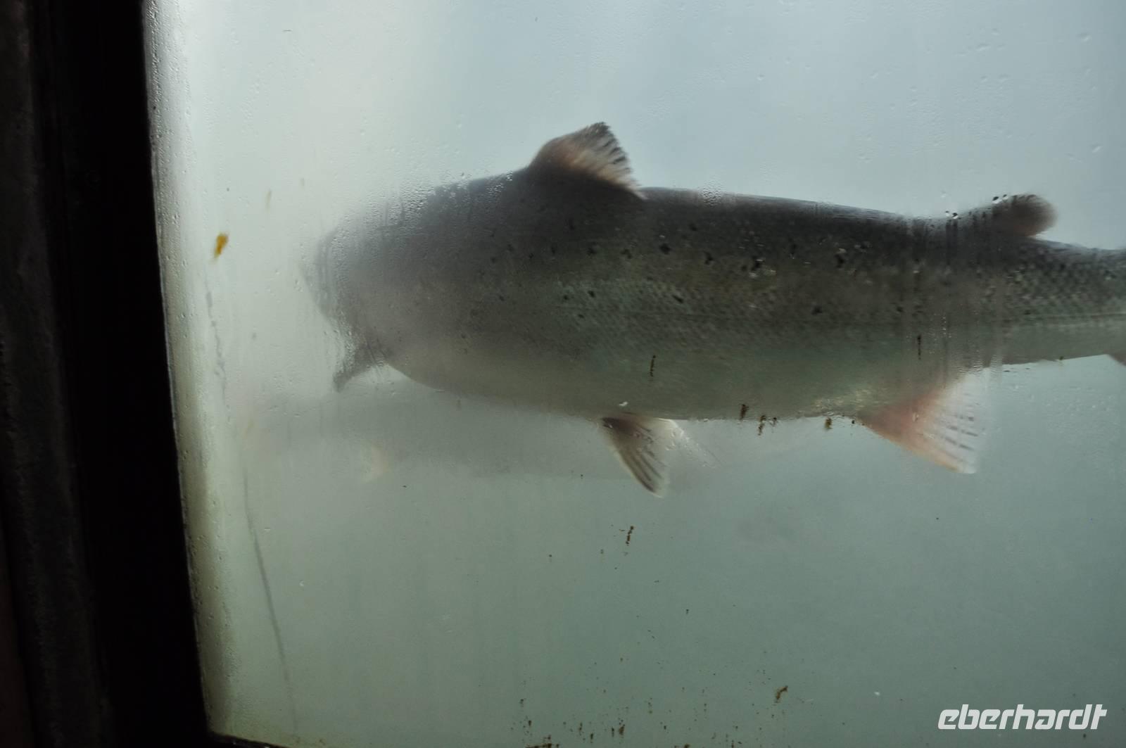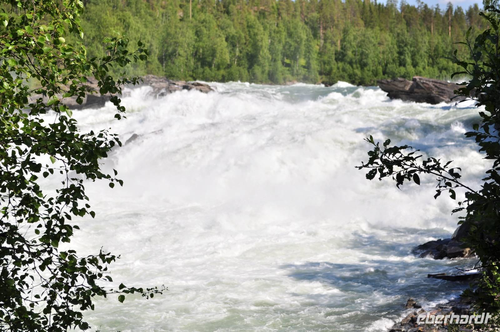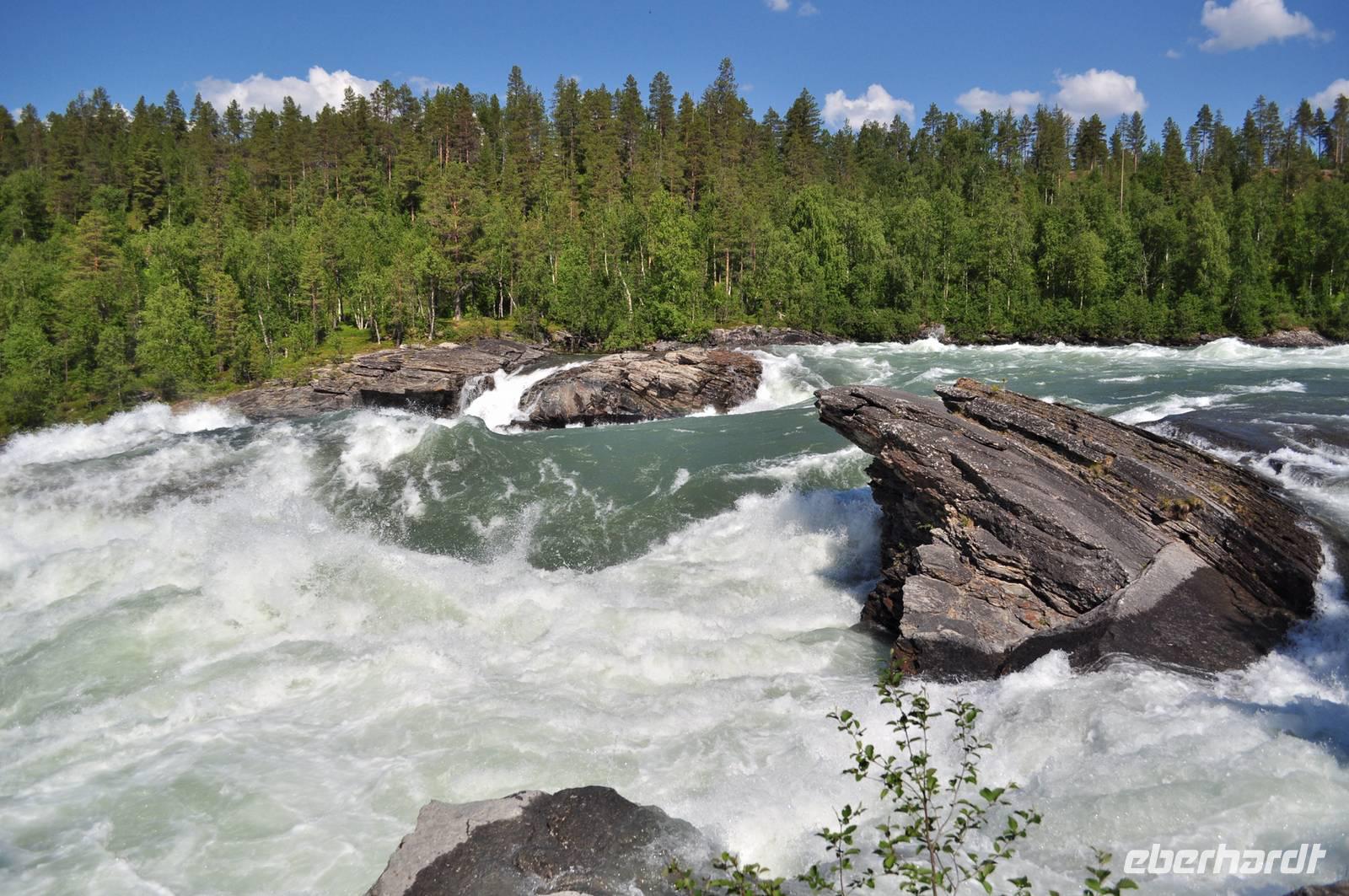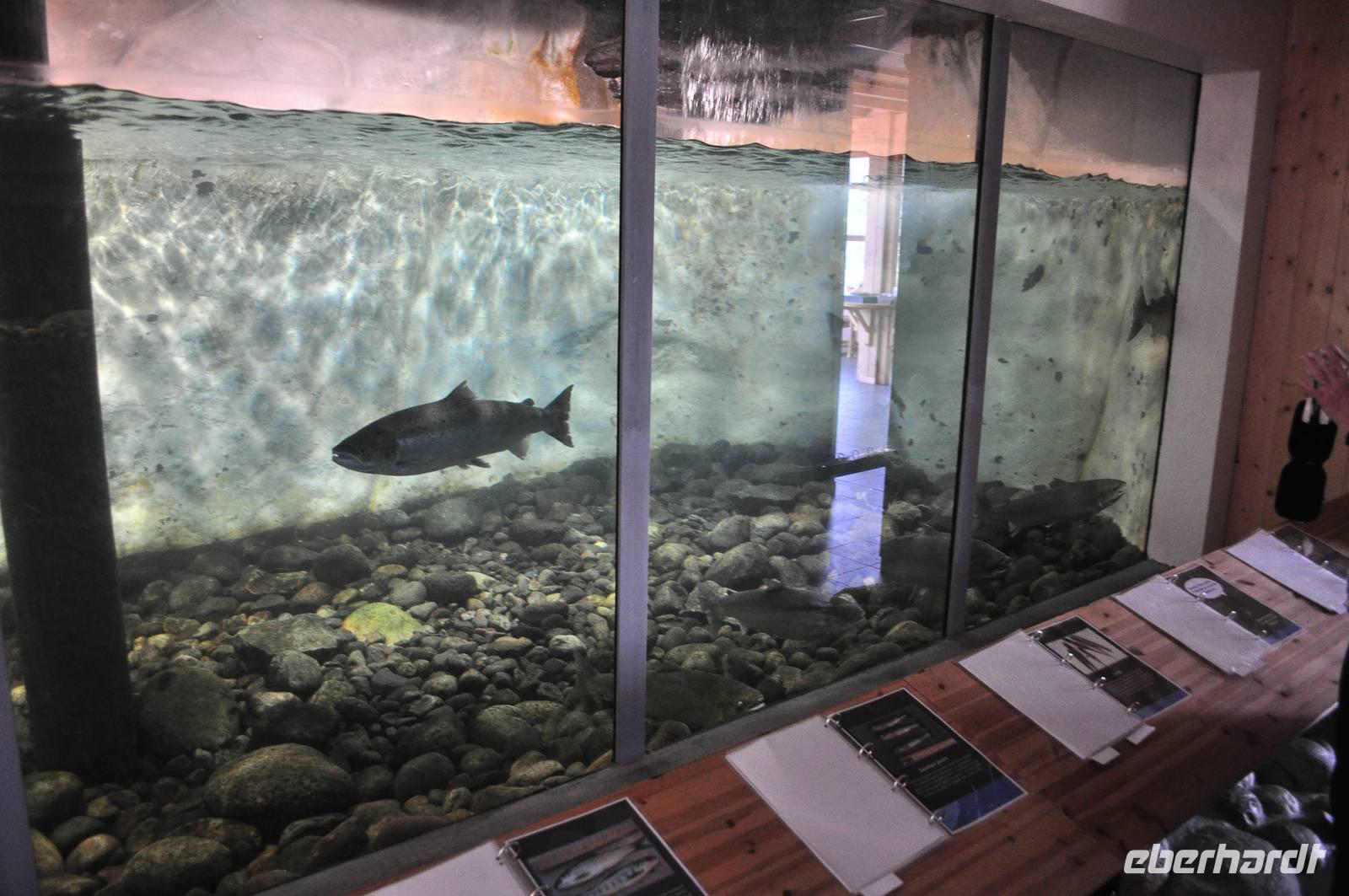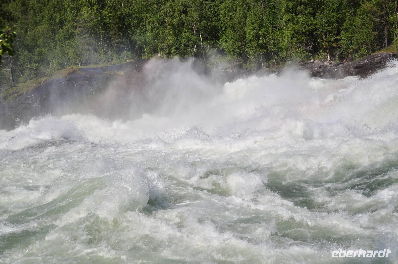 Nun geht es wirklich weiter nach Süden, zunächst über die E8 dann wieder auf die E6. Wir erreichen den Målselvfossen eine beeindruckende tosende Stromschnelle. Auf Wunsch wird Lachssuppe serviert, selbstverständlich zubereitet aus hauseigenem Lachs. Außerdem bekommen wir in einem kleinen Aquarium echte lebende Lachse zu Gesicht.