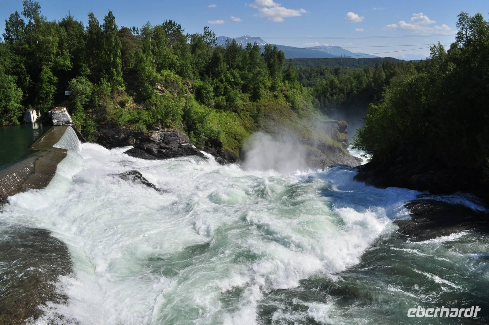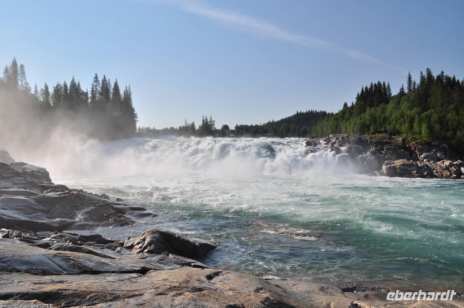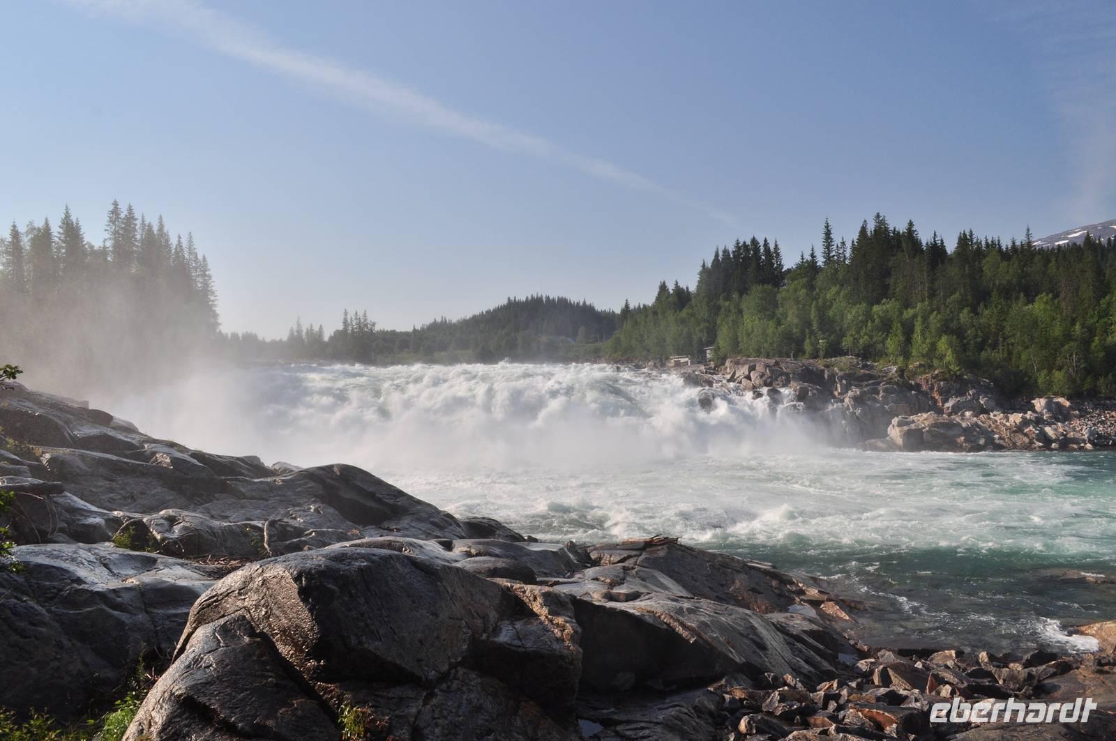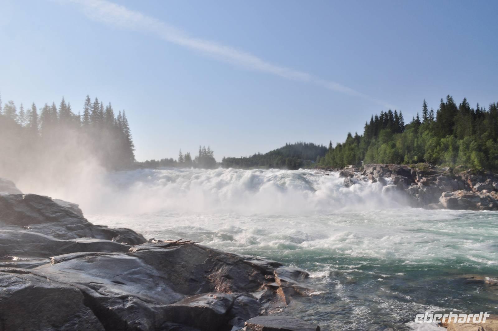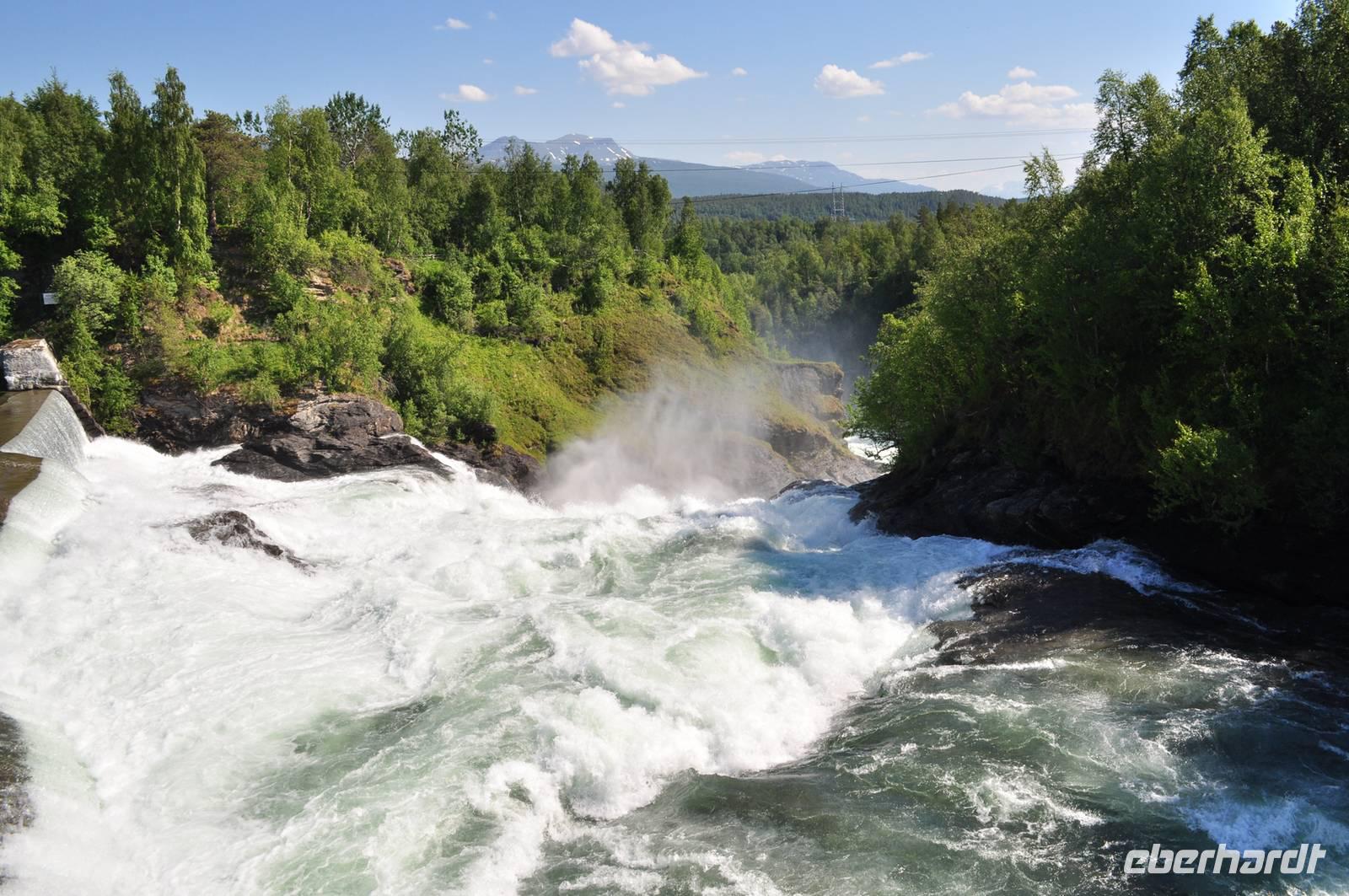 Auf der E6 geht es weiter nach Süden. Vorbei an spektakulären Wasserfällen, z. B. dem Laksforsen, weite und wunderschöne Waldgebiete und viele Fjorde. Stellenweise ist das Meer spiegelglatt, so dass sich die umliegende Bergwelt darin spiegelt. War da nicht ein Troll? Oder dort drüben vielleicht?