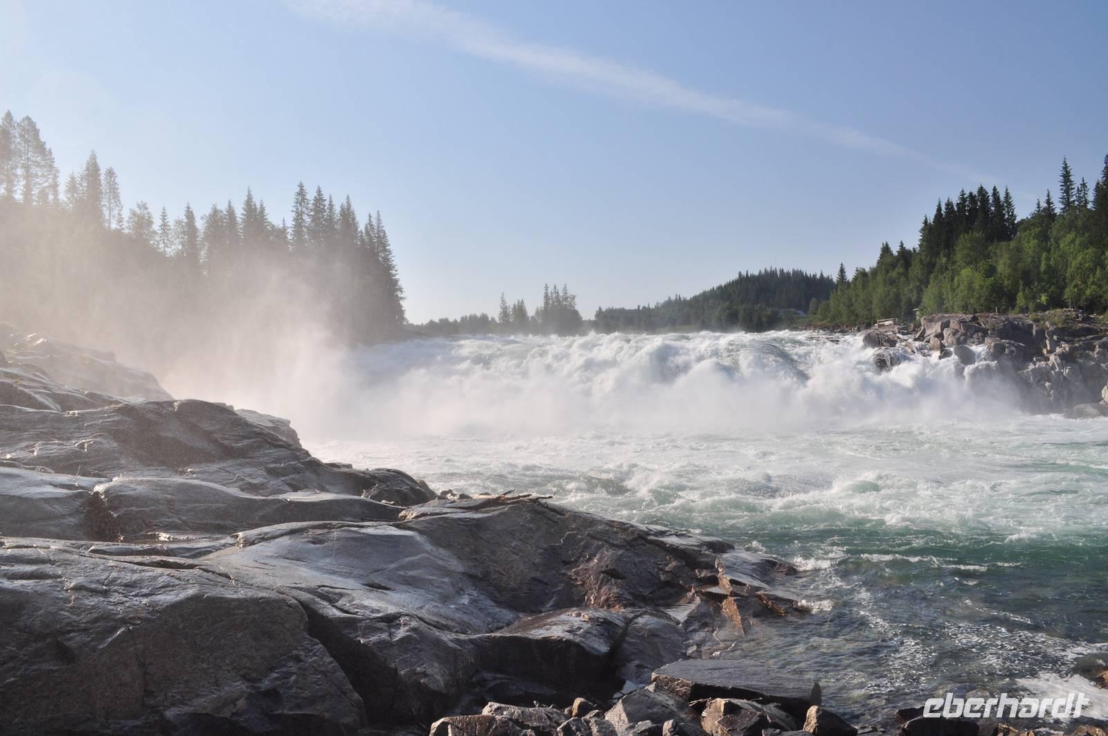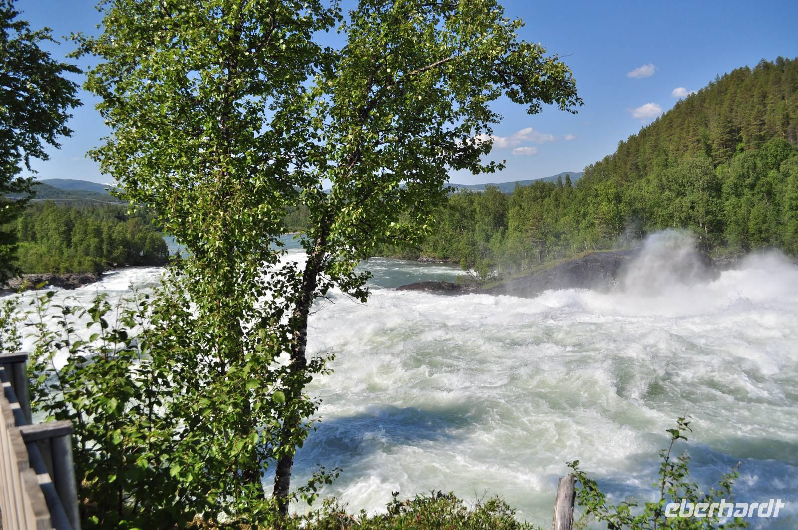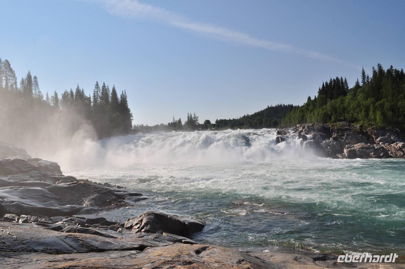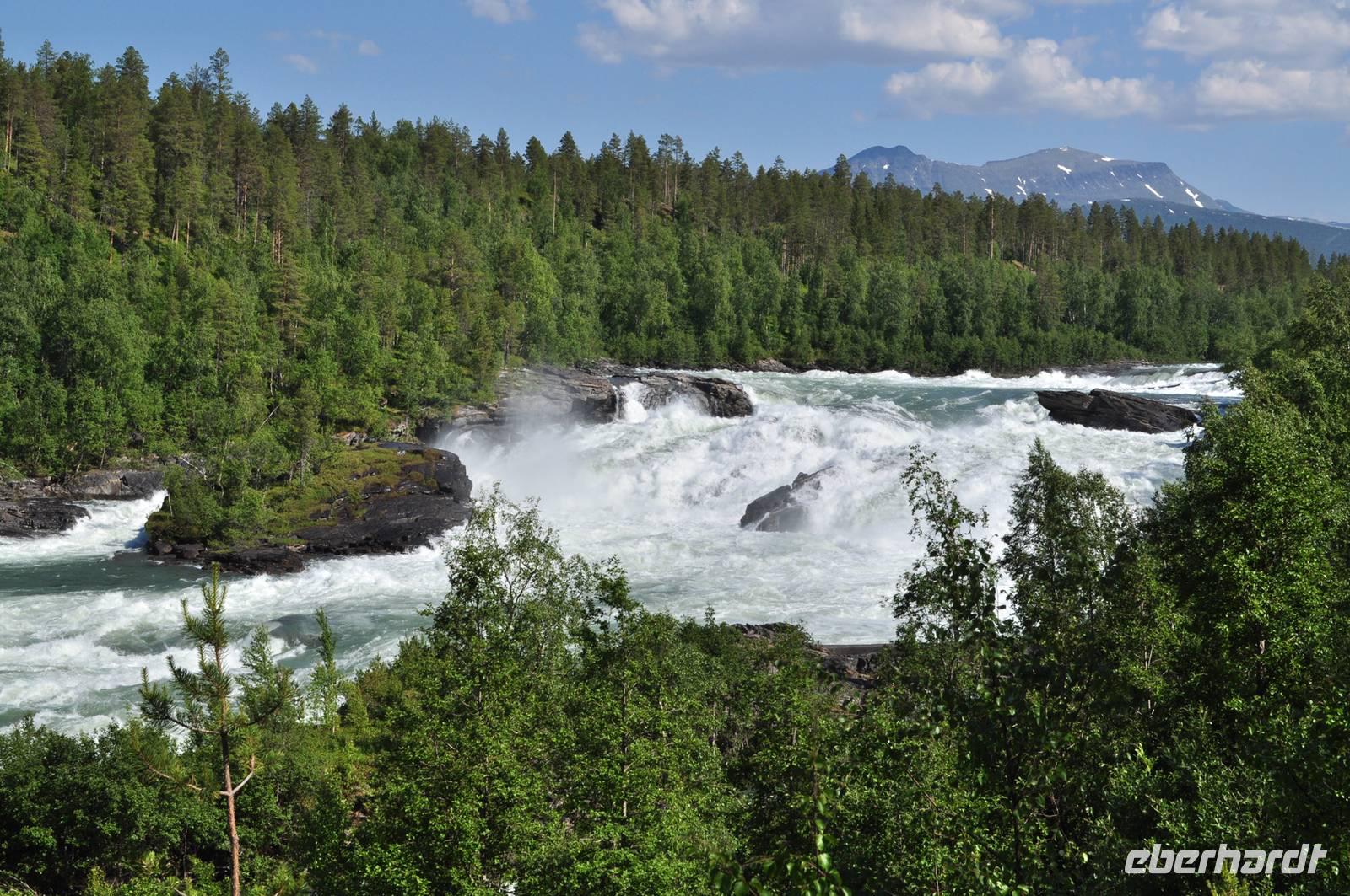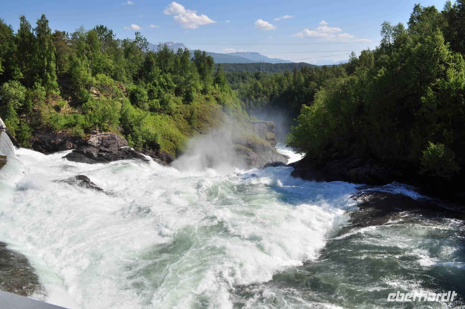 Auf der E6 geht es weiter nach Süden. Vorbei an spektakulären Wasserfällen, z. B. dem Laksforsen, weite und wunderschöne Waldgebiete und viele Fjorde. Stellenweise ist das Meer spiegelglatt, so dass sich die umliegende Bergwelt darin spiegelt. War da nicht ein Troll? Oder dort drüben vielleicht?