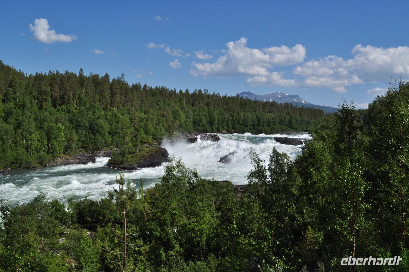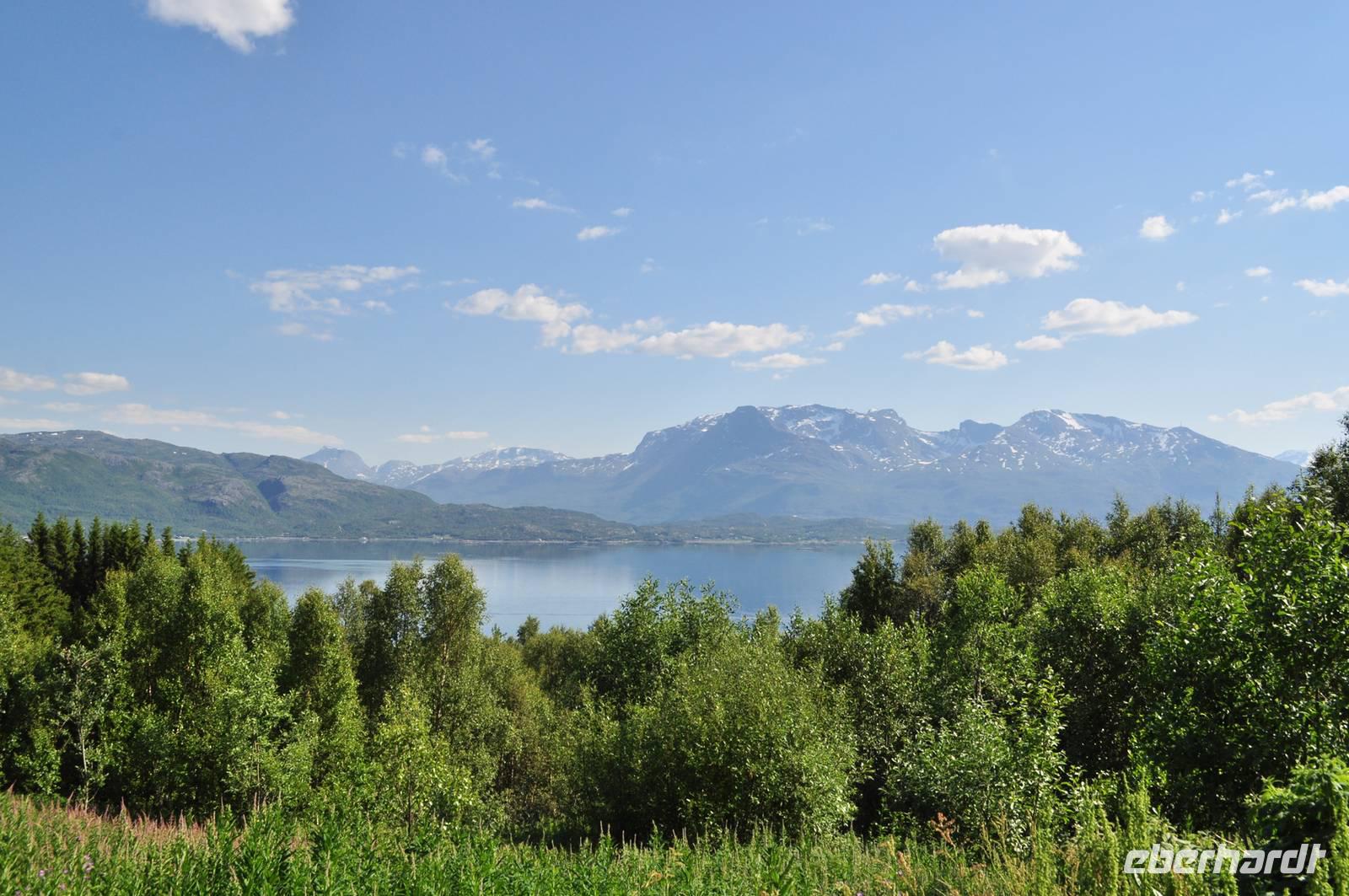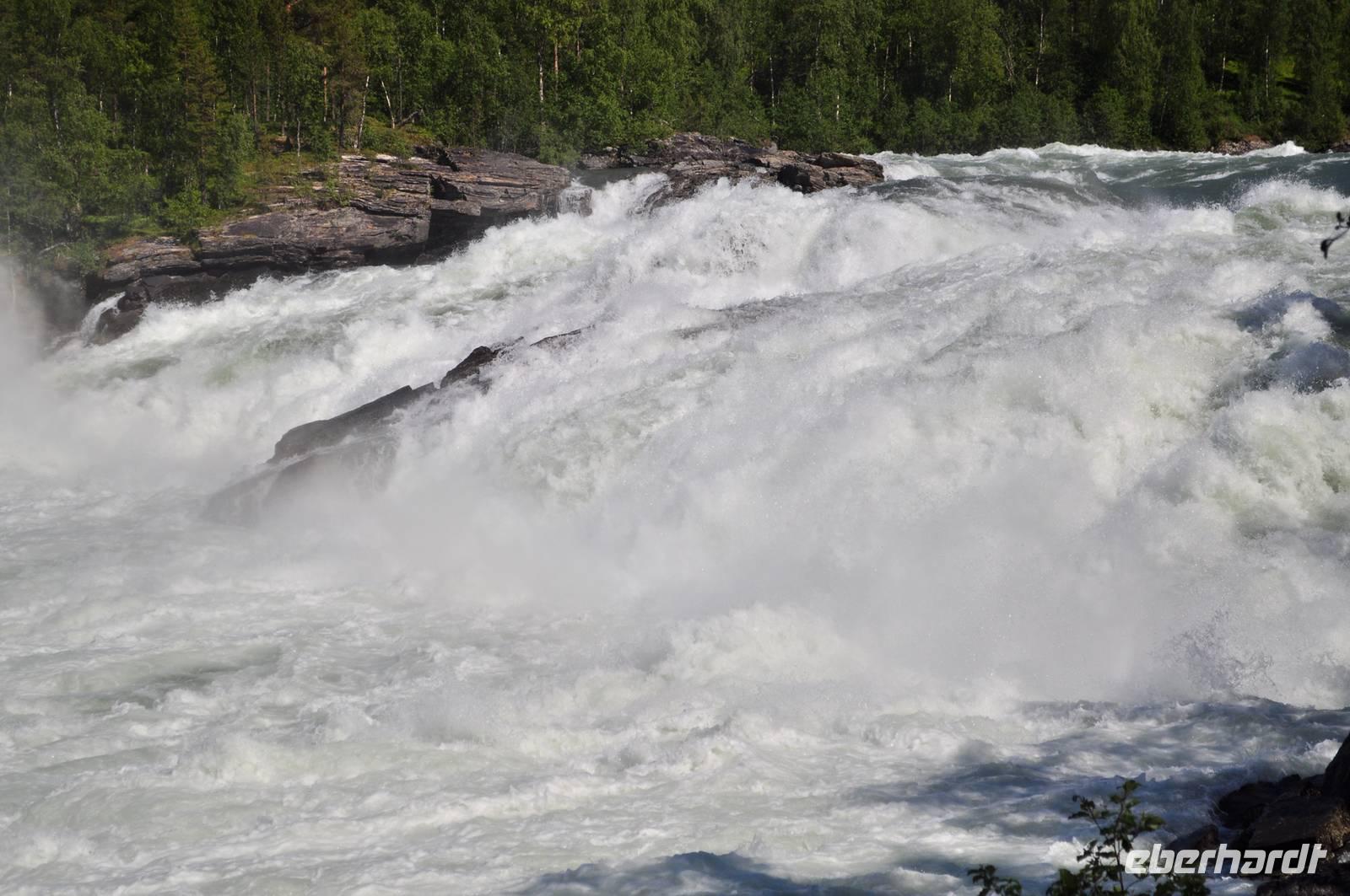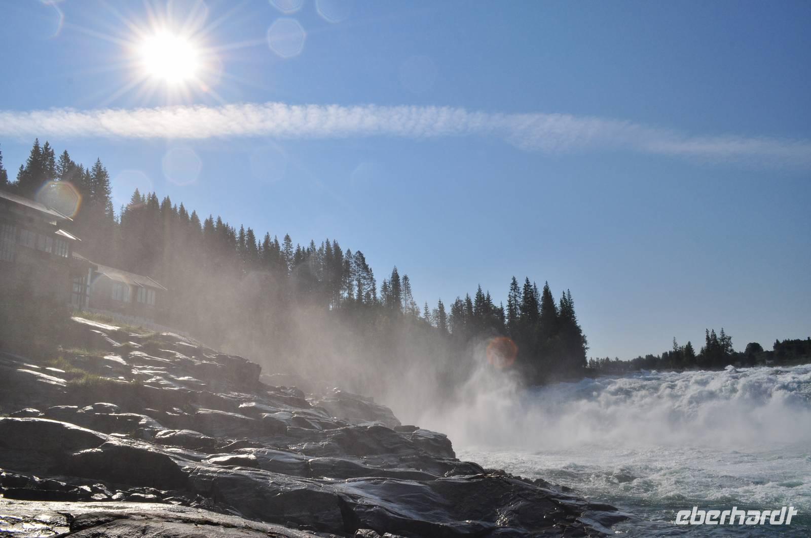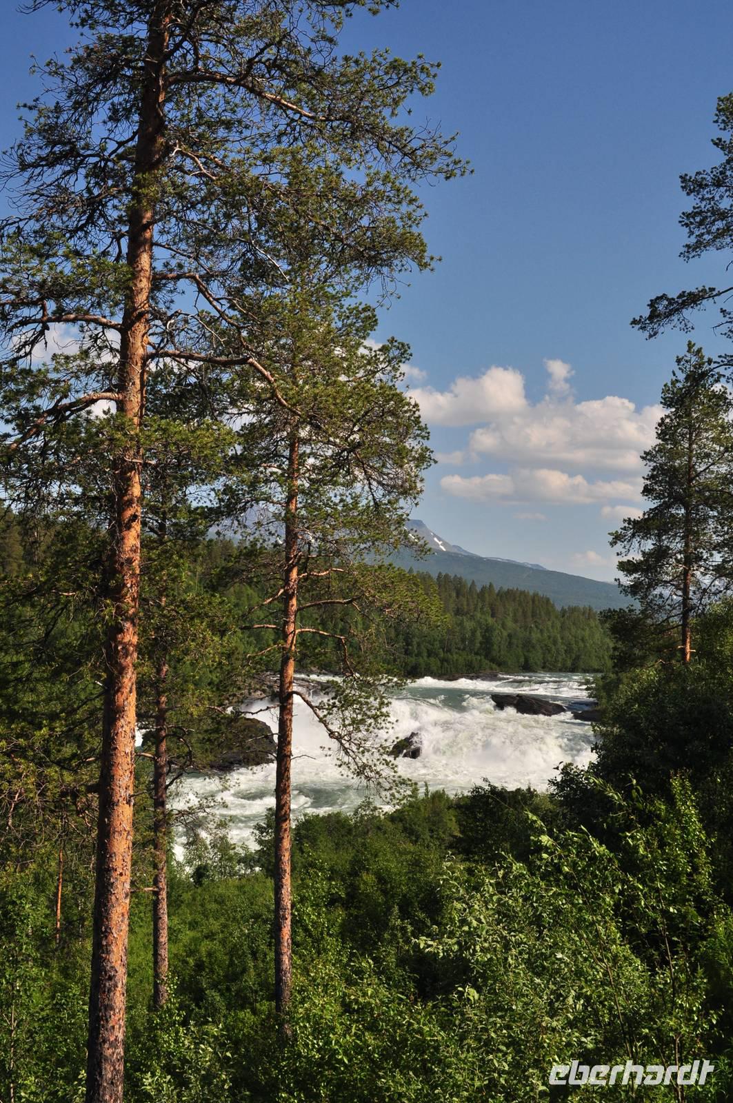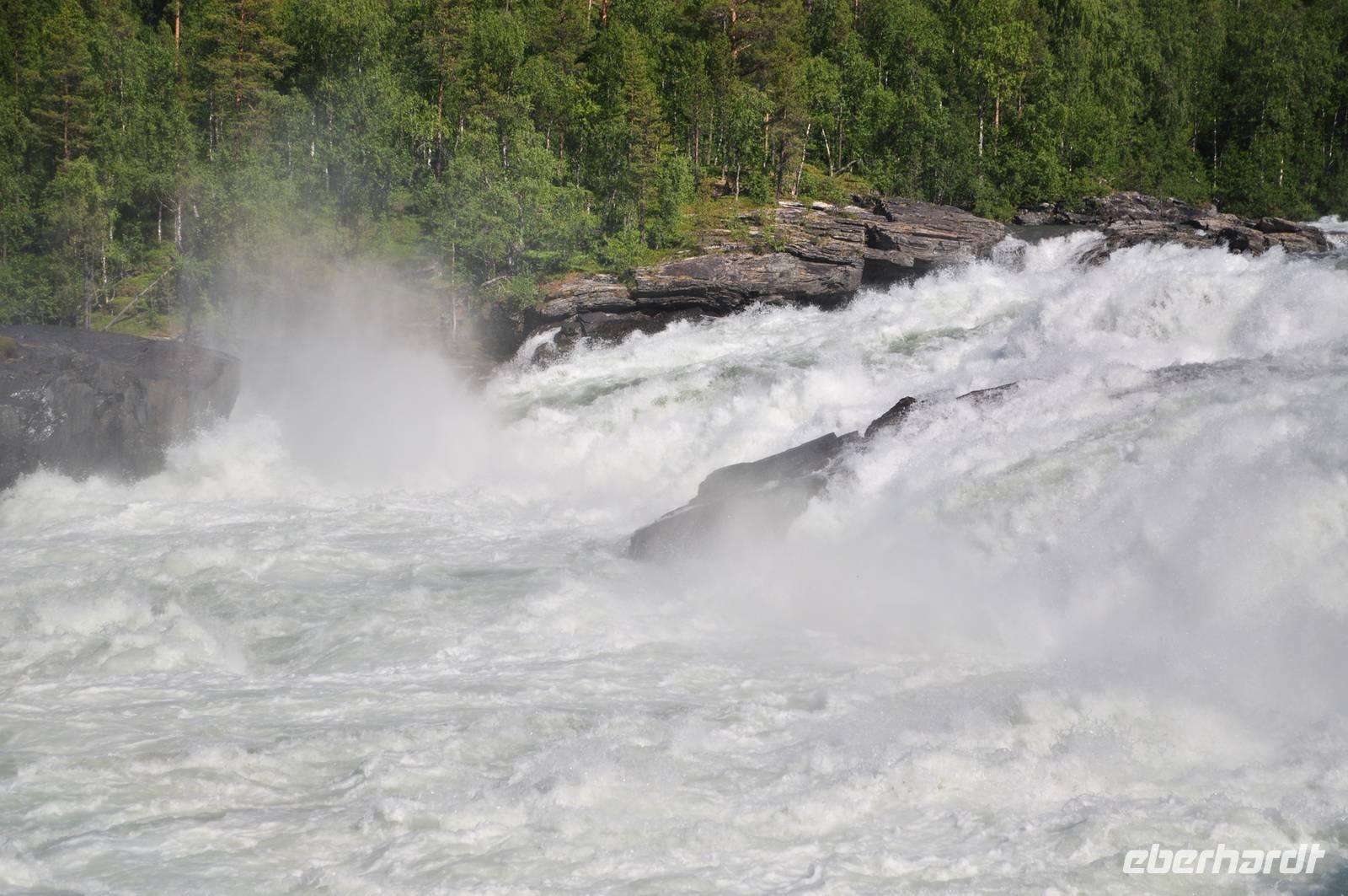 Auf der E6 geht es weiter nach Süden. Vorbei an spektakulären Wasserfällen, z. B. dem Laksforsen, weite und wunderschöne Waldgebiete und viele Fjorde. Stellenweise ist das Meer spiegelglatt, so dass sich die umliegende Bergwelt darin spiegelt. War da nicht ein Troll? Oder dort drüben vielleicht?