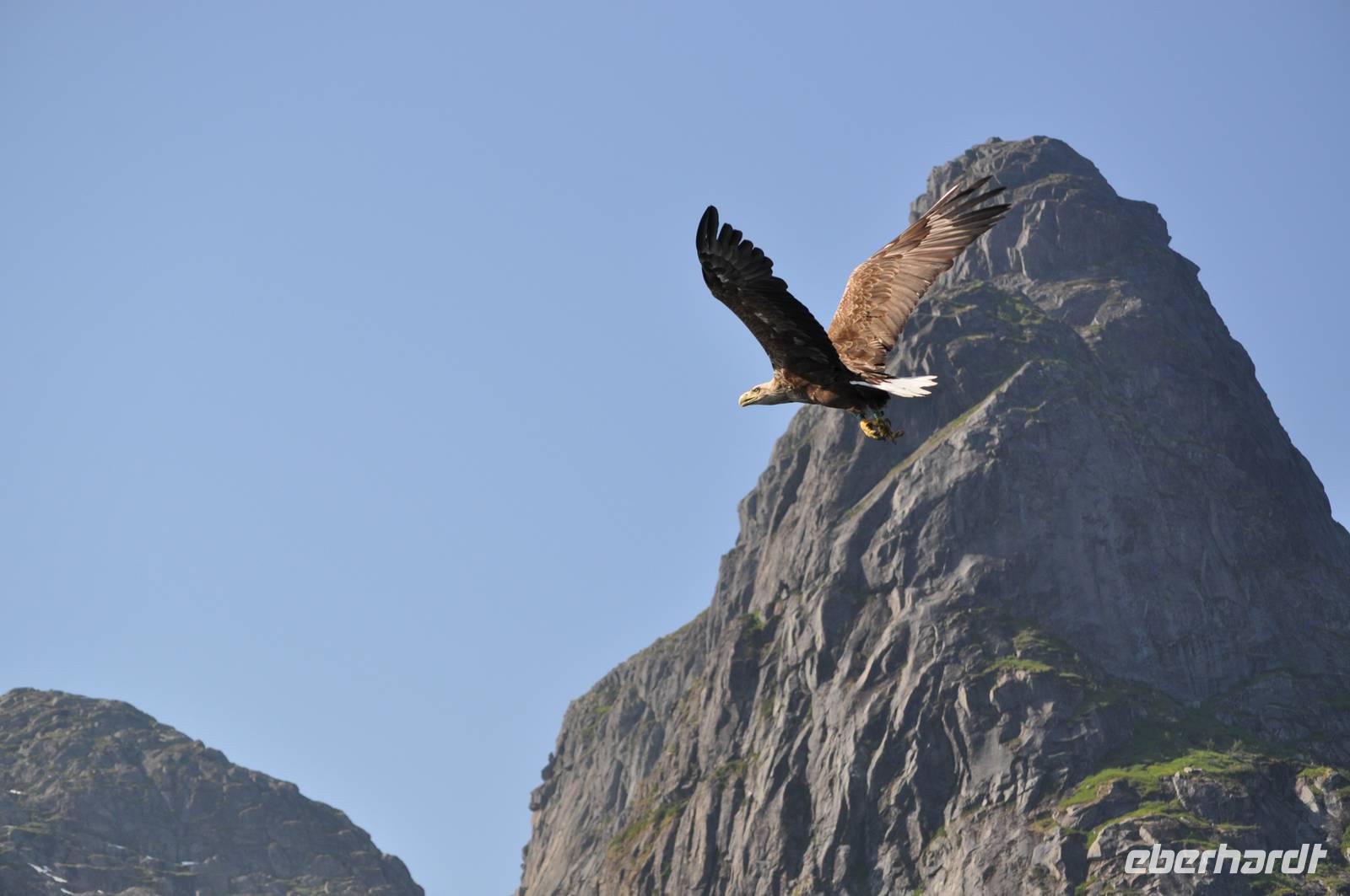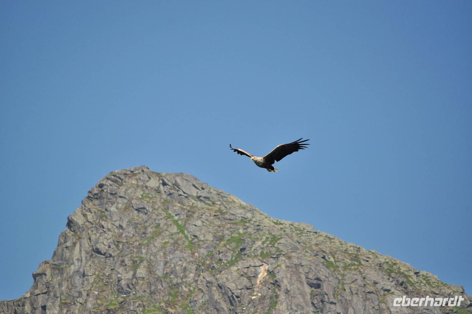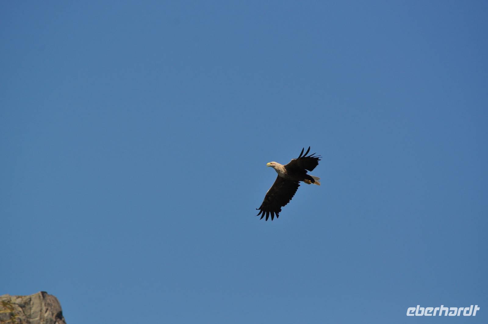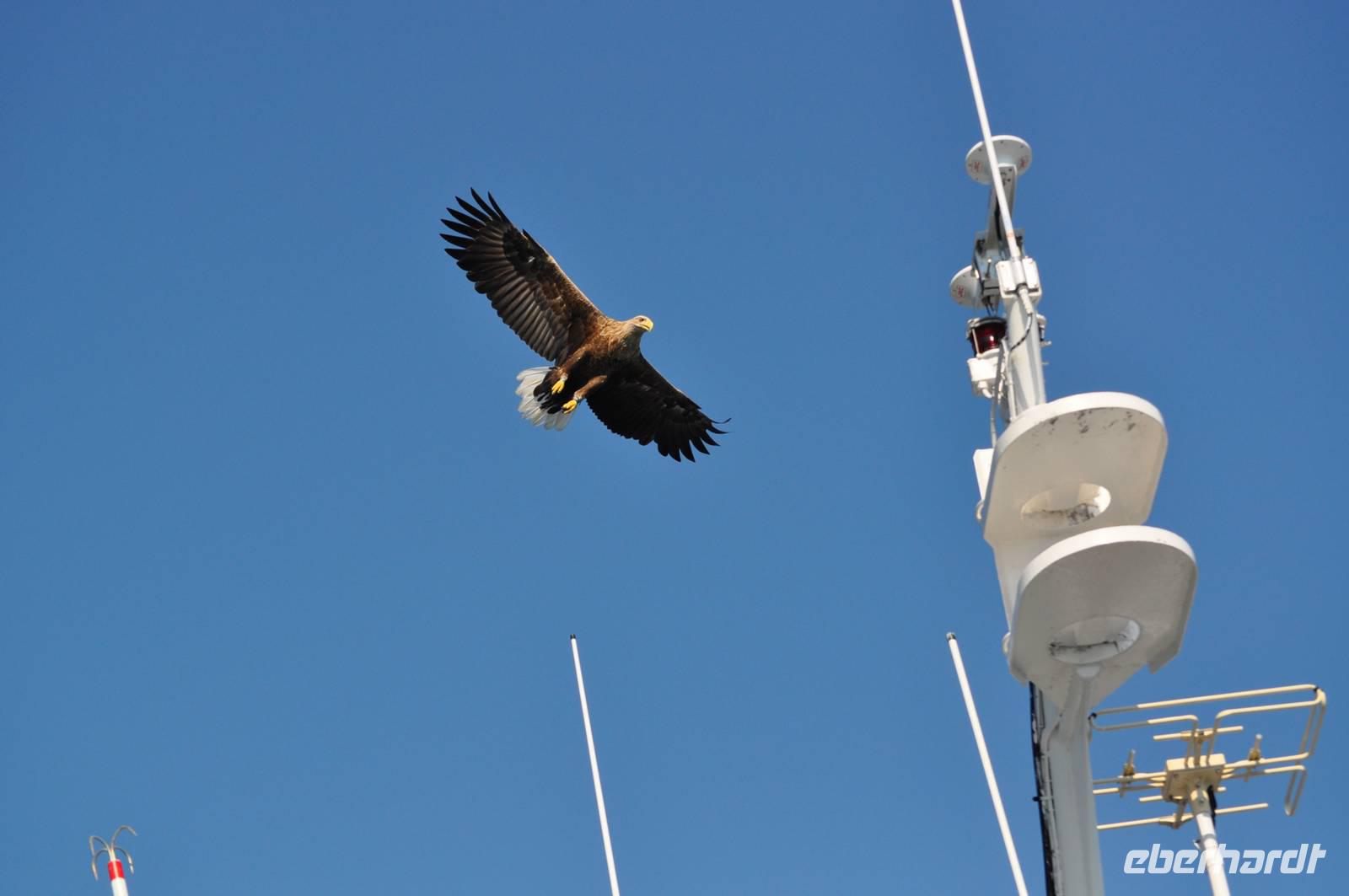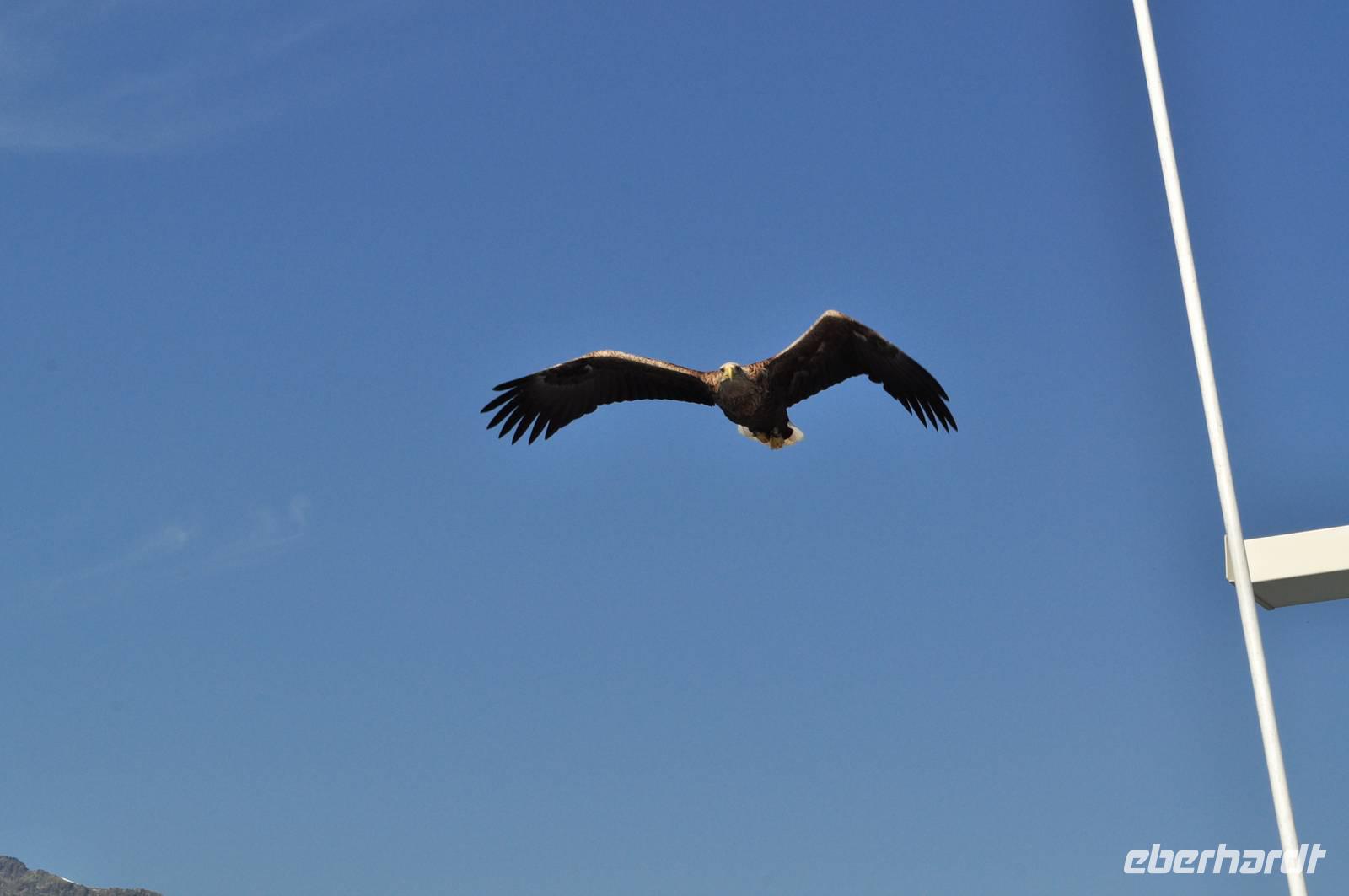 Es geht durch den Raftsund in Richtung Svolvær. Doch zuvor treffen wir auf eine Reihe von Seeadlern. Das stolze und prachtvolle Tier bildet das Deutsche Wappentier. Wir dürfen es in freier Wildbahn im Flug beobachten. Angelockt von Fisch staunen wir über spektakuläre Flugmanöver. Fast beiläufig fahren wir in den berühmten Trollfjord hinein, immer begleitet von Seeadlern.