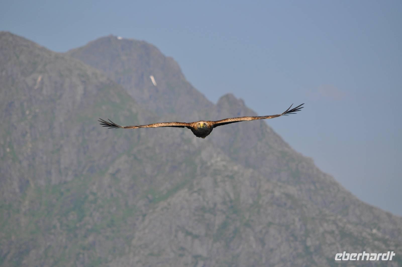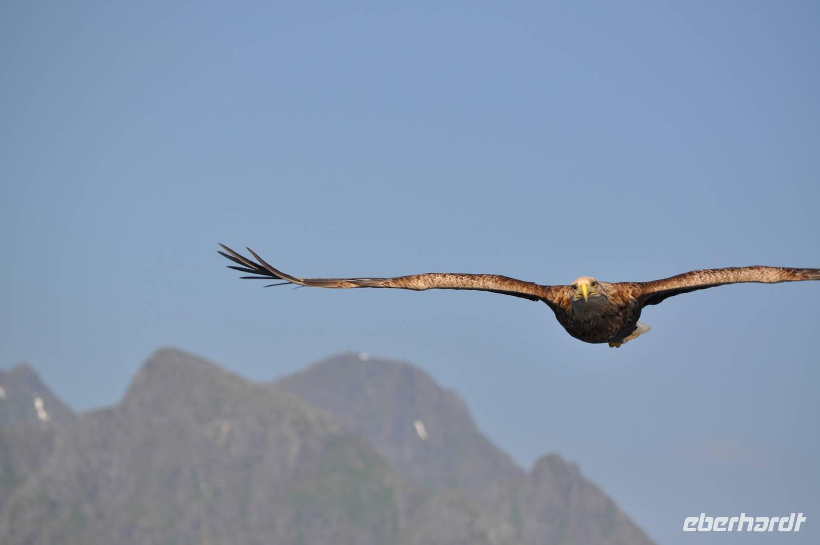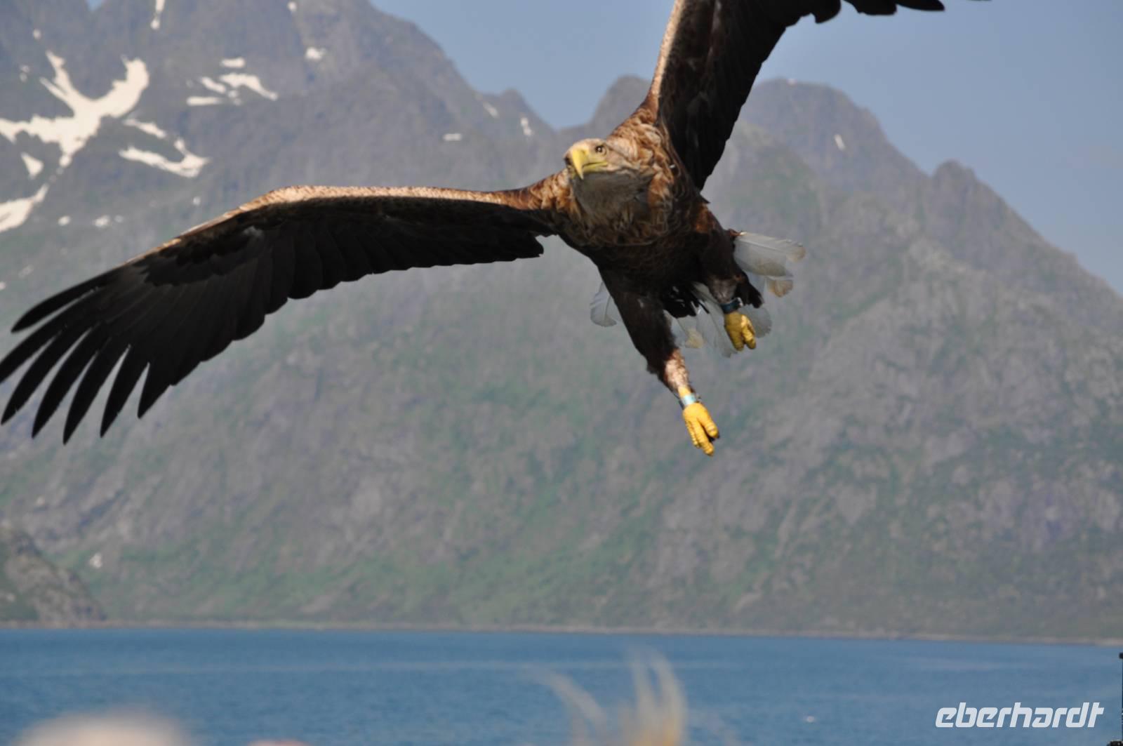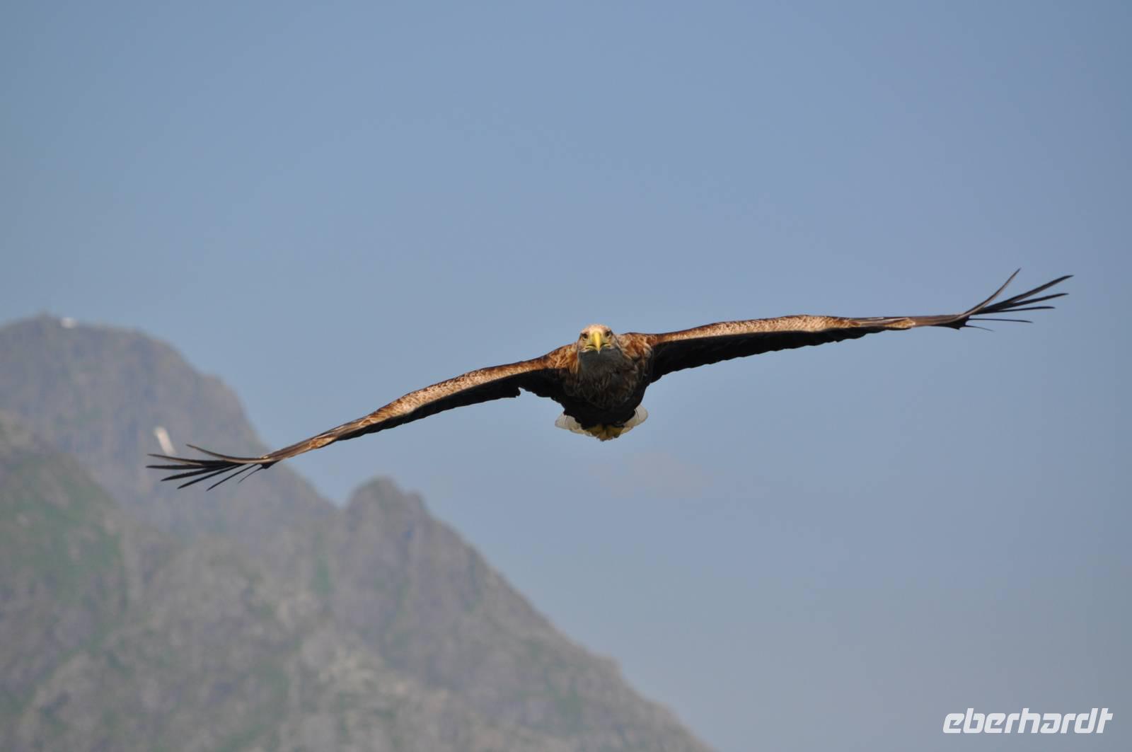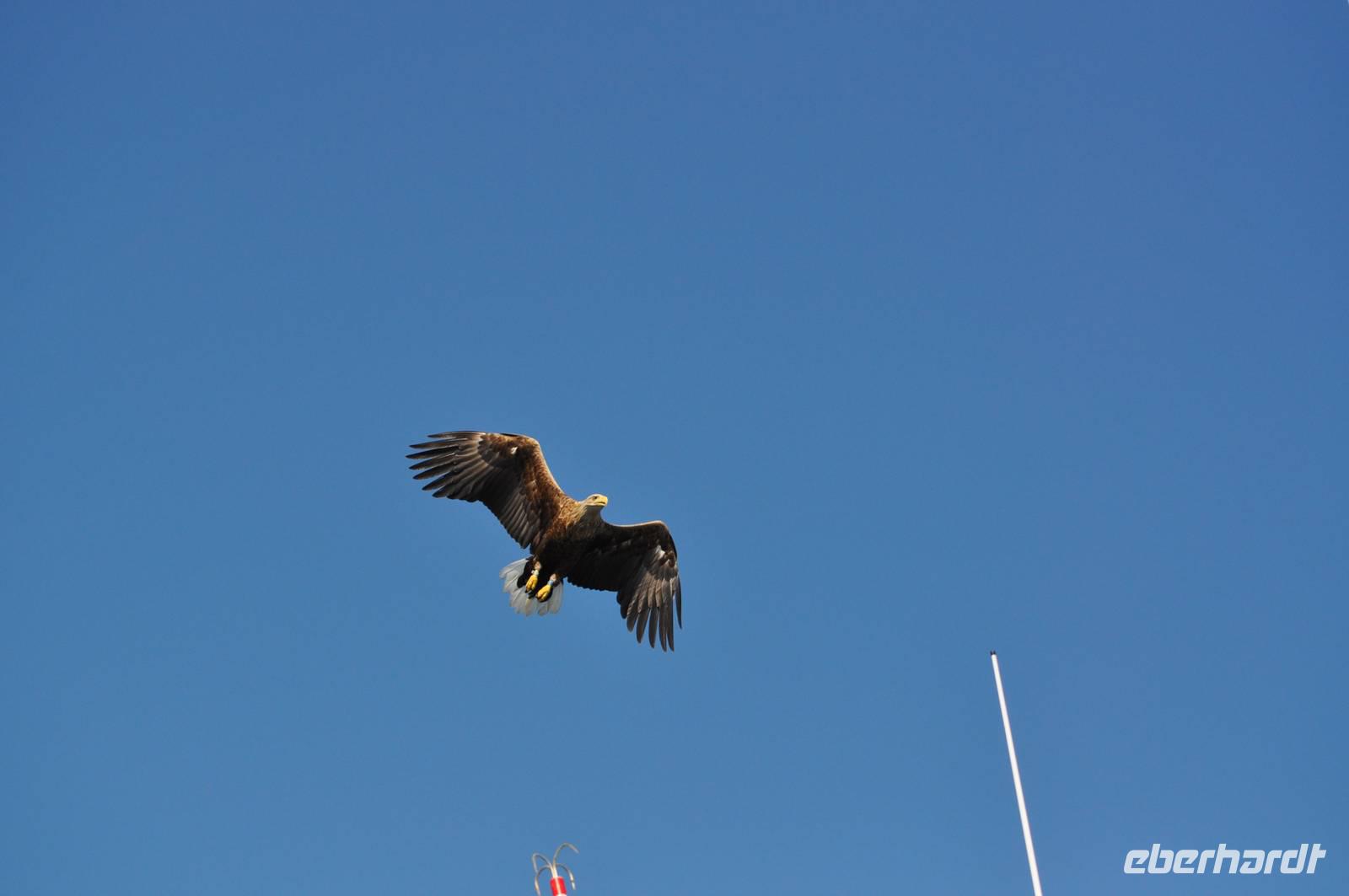 Es geht durch den Raftsund in Richtung Svolvær. Doch zuvor treffen wir auf eine Reihe von Seeadlern. Das stolze und prachtvolle Tier bildet das Deutsche Wappentier. Wir dürfen es in freier Wildbahn im Flug beobachten. Angelockt von Fisch staunen wir über spektakuläre Flugmanöver. Fast beiläufig fahren wir in den berühmten Trollfjord hinein, immer begleitet von Seeadlern.