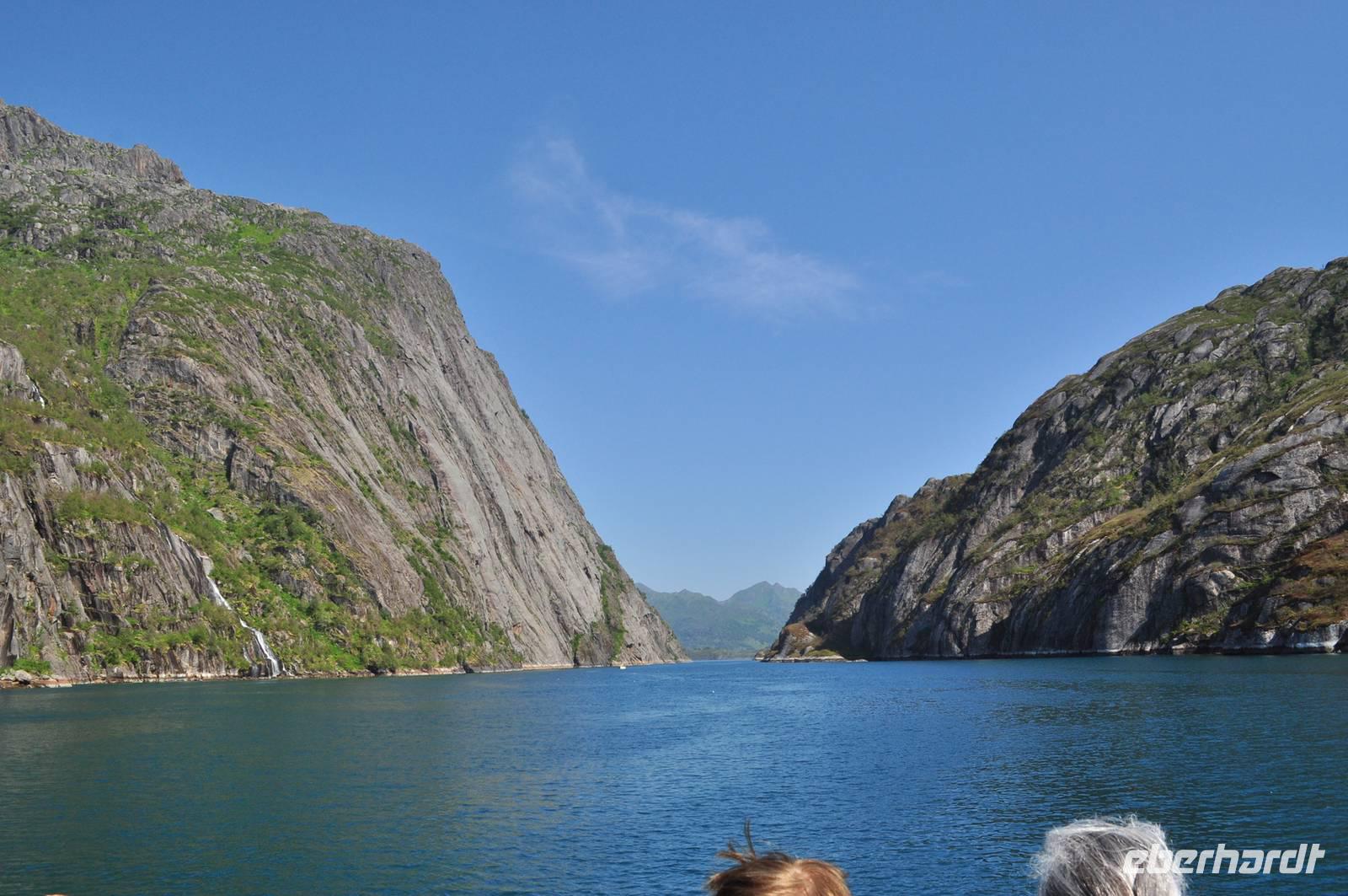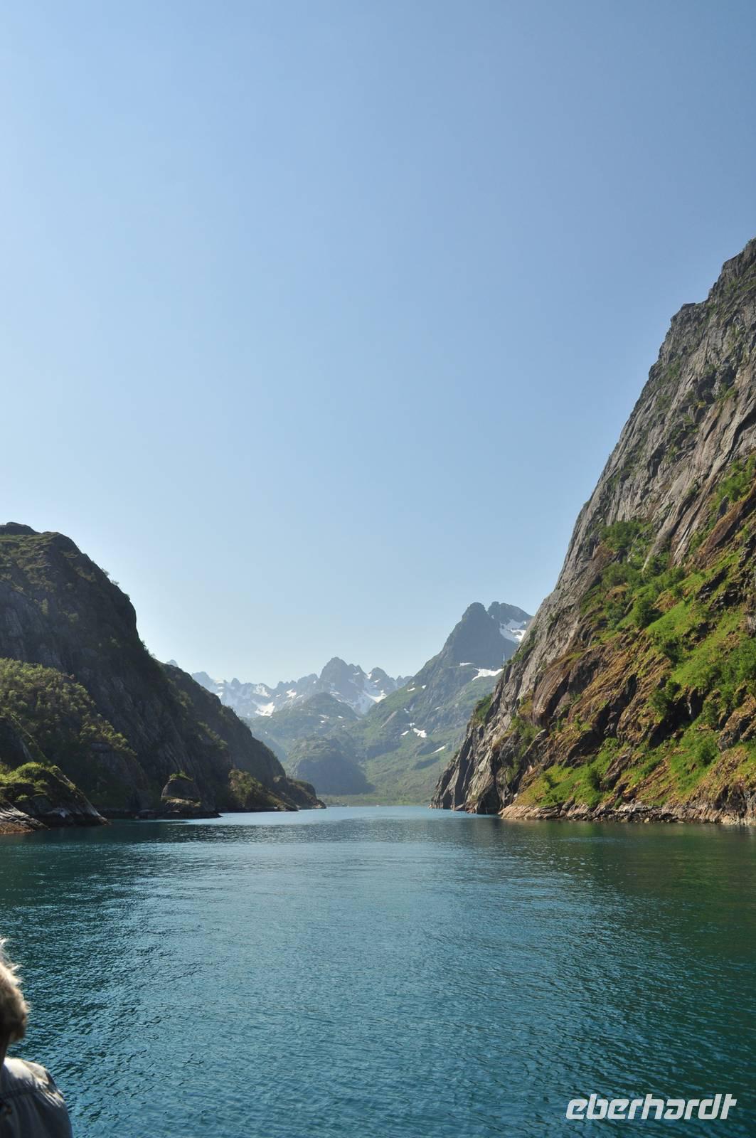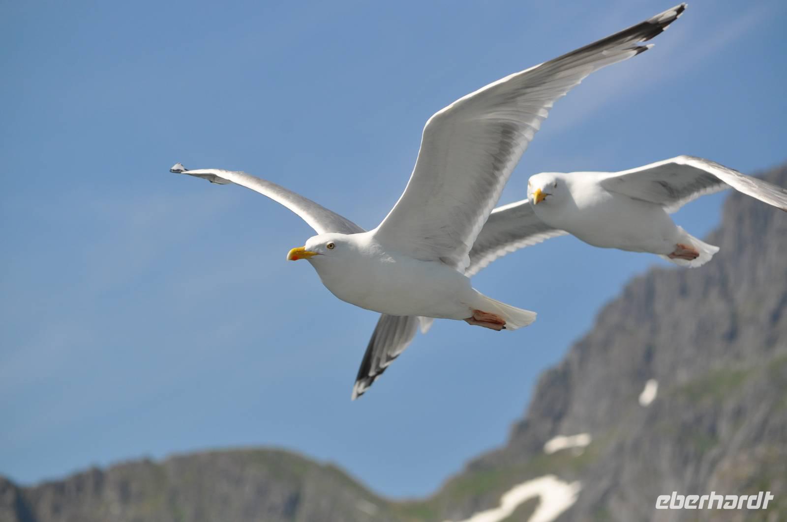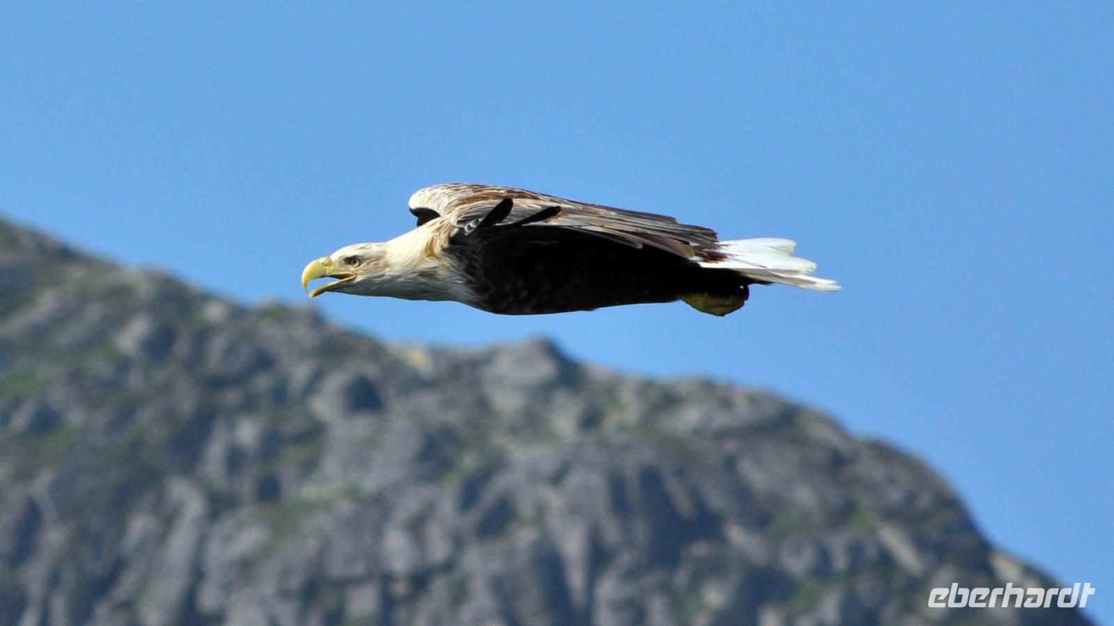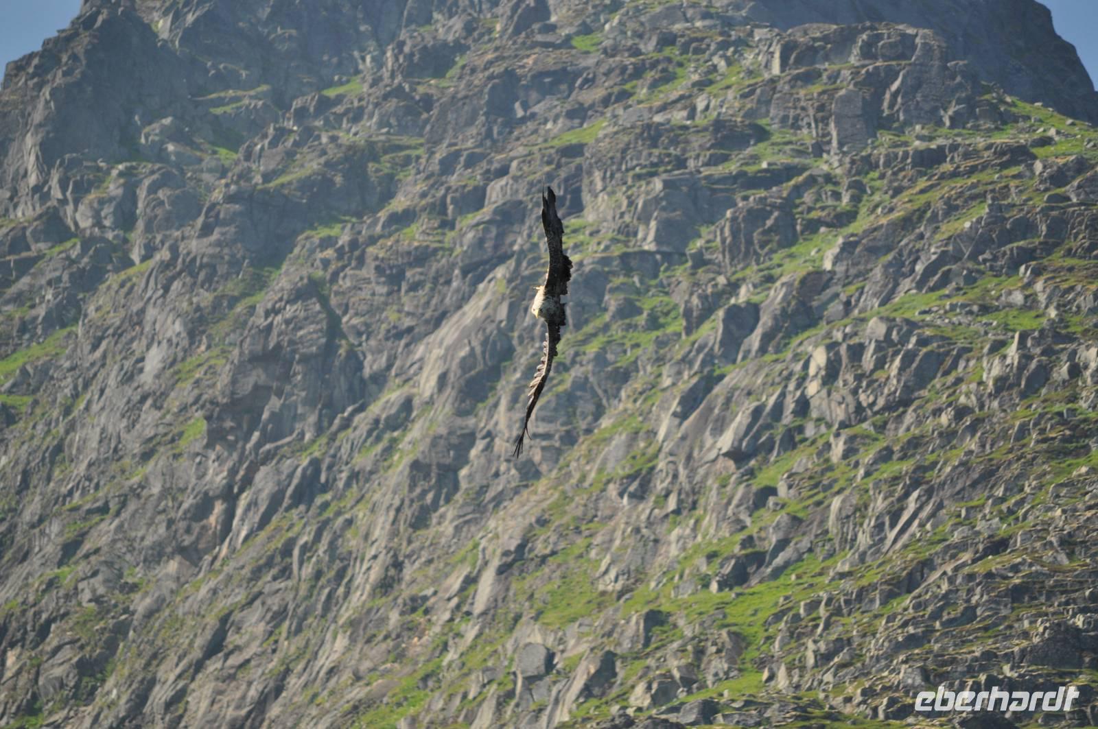 Es geht durch den Raftsund in Richtung Svolvær. Doch zuvor treffen wir auf eine Reihe von Seeadlern. Das stolze und prachtvolle Tier bildet das Deutsche Wappentier. Wir dürfen es in freier Wildbahn im Flug beobachten. Angelockt von Fisch staunen wir über spektakuläre Flugmanöver. Fast beiläufig fahren wir in den berühmten Trollfjord hinein, immer begleitet von Seeadlern.