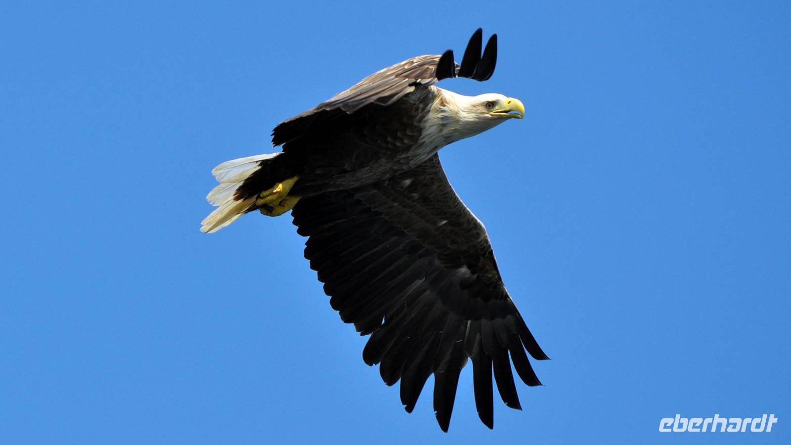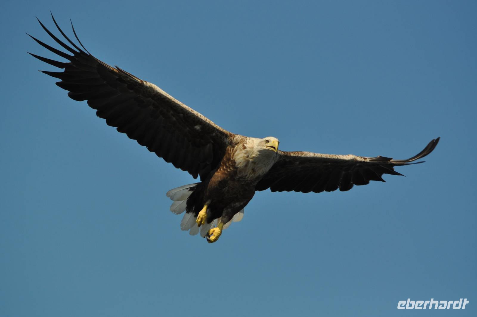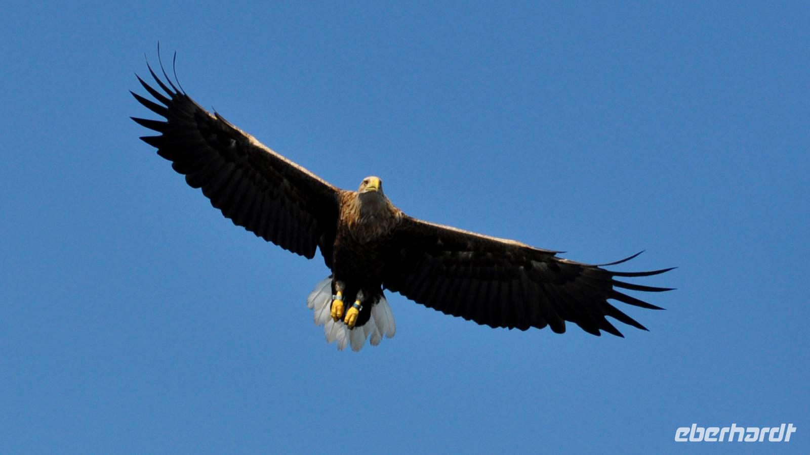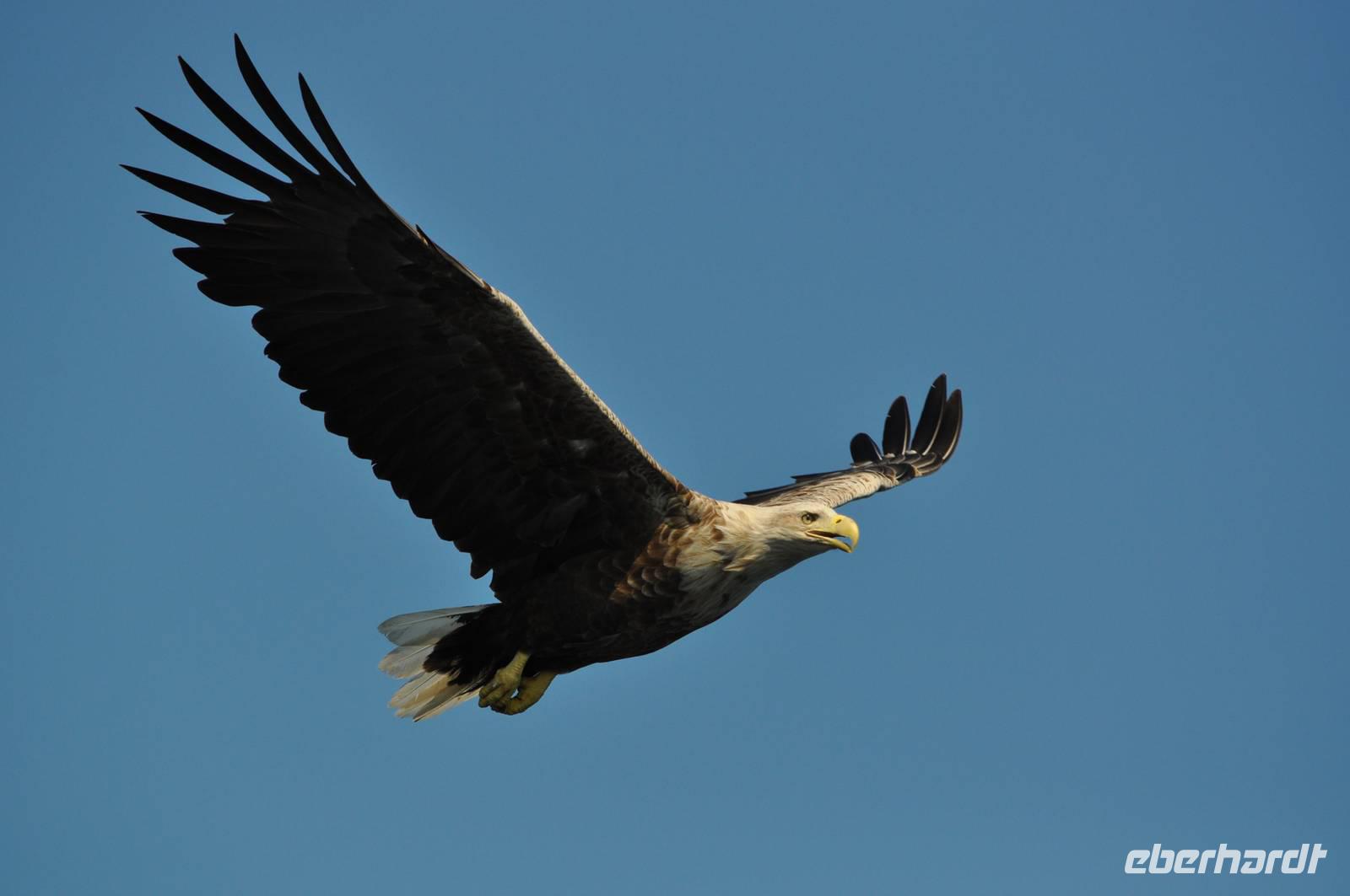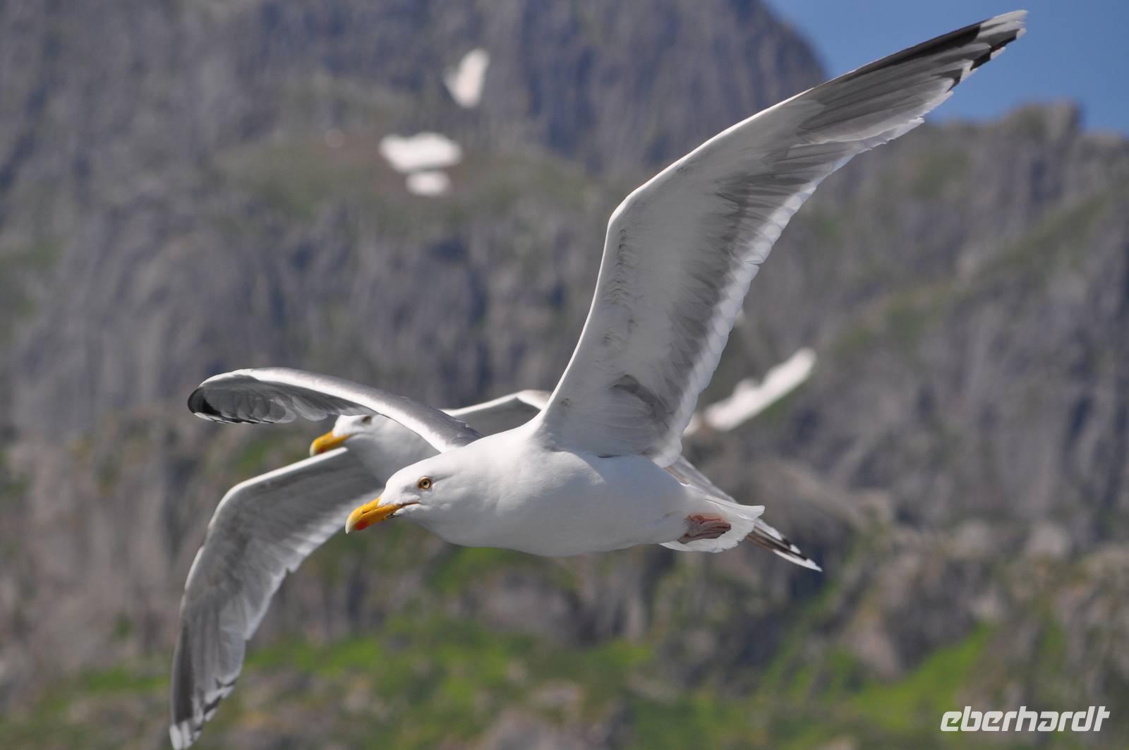 Es geht durch den Raftsund in Richtung Svolvær. Doch zuvor treffen wir auf eine Reihe von Seeadlern. Das stolze und prachtvolle Tier bildet das Deutsche Wappentier. Wir dürfen es in freier Wildbahn im Flug beobachten. Angelockt von Fisch staunen wir über spektakuläre Flugmanöver. Fast beiläufig fahren wir in den berühmten Trollfjord hinein, immer begleitet von Seeadlern.
