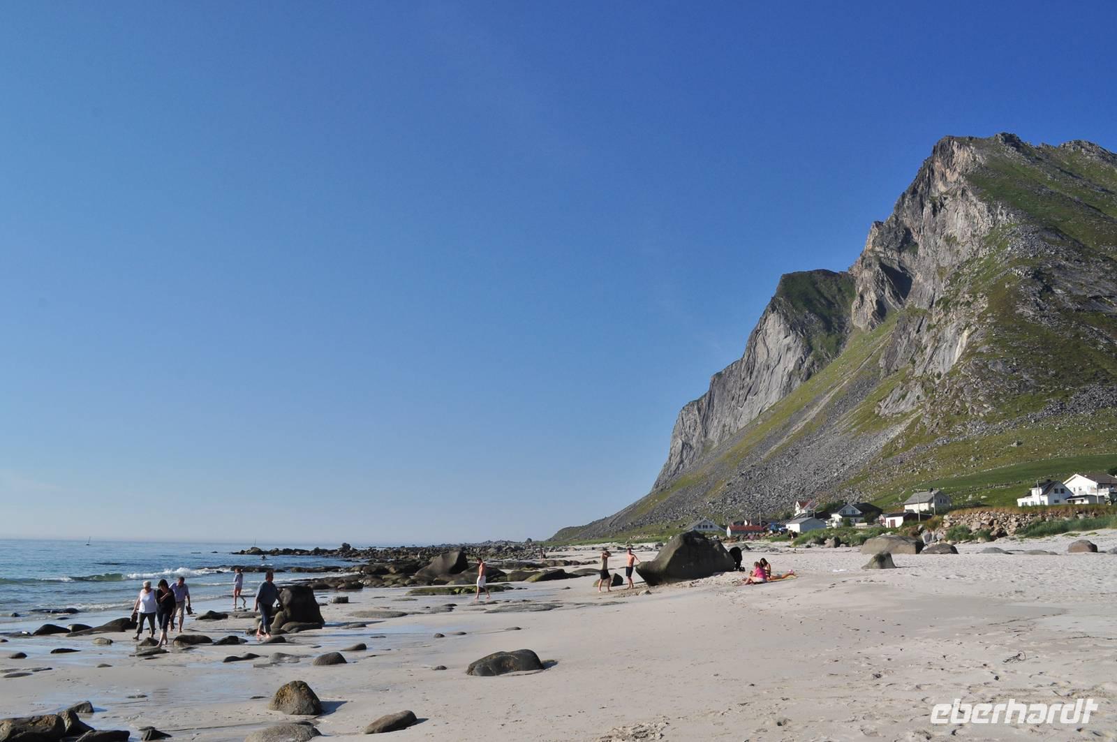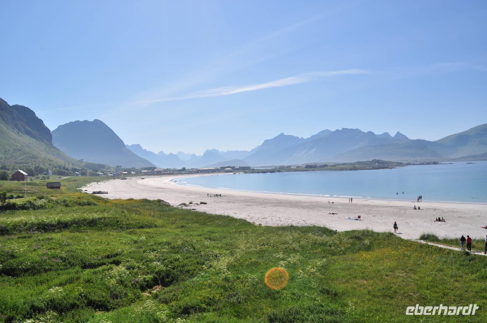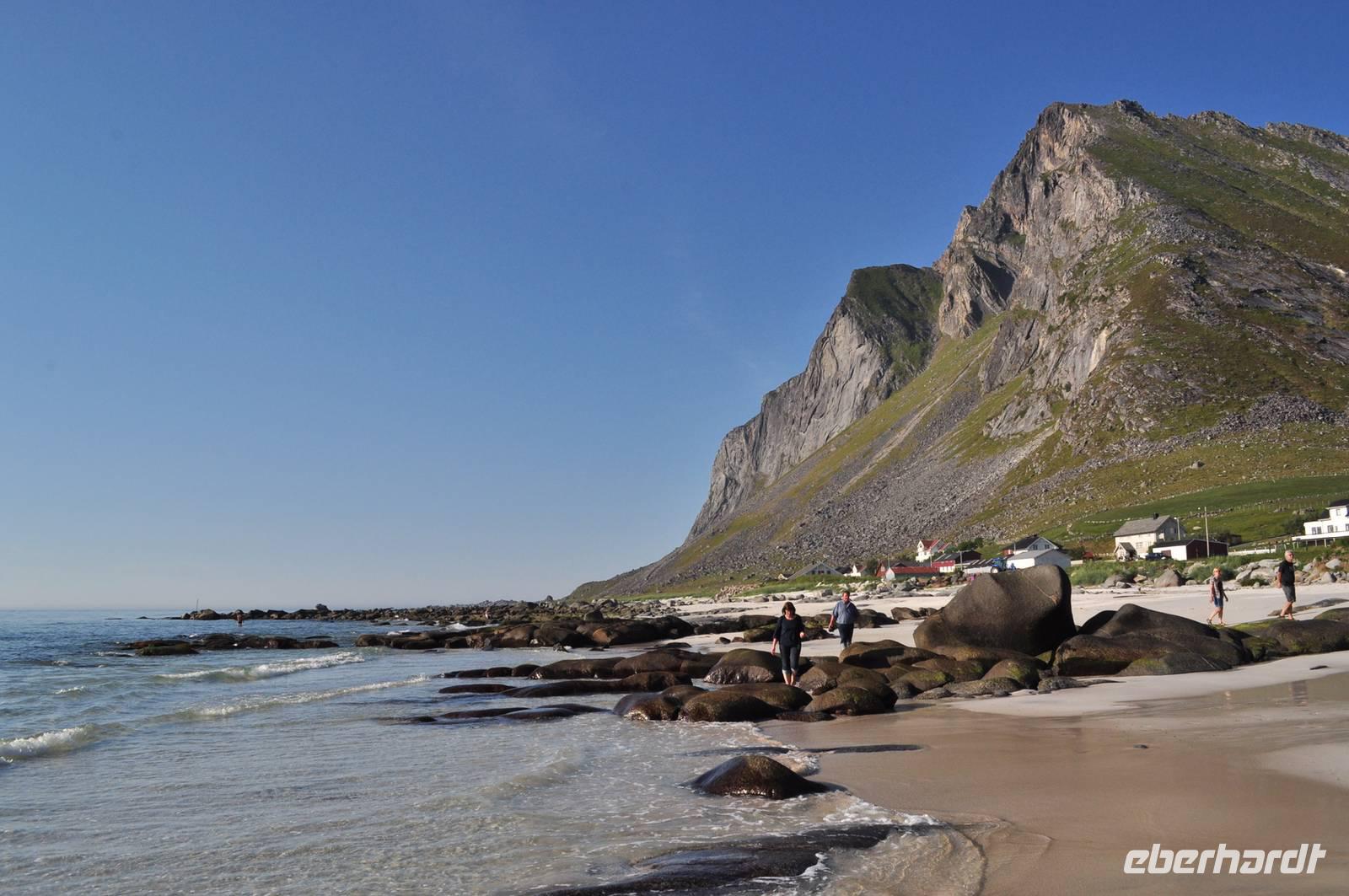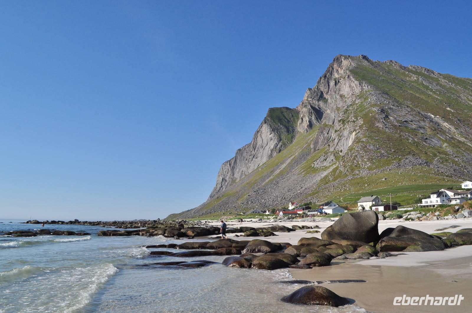 Über eine Reihe einspuriger schmaler Brücken erreichen wir die malerischen Fischerorte Å, Moskenes, Reine und Vikten. Am weißen Sandstrand gibt es sogar die Möglichkeit, das Meer bei karibischen Temperaturen jenseits der 30 Grad Marke zu genießen, es ist so heiß wie seit über
