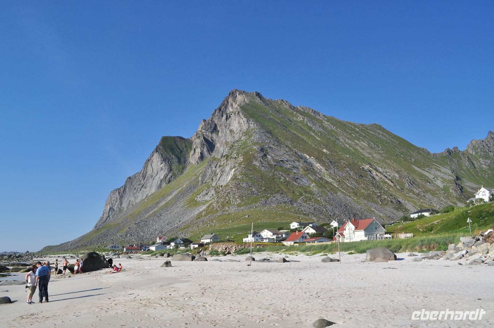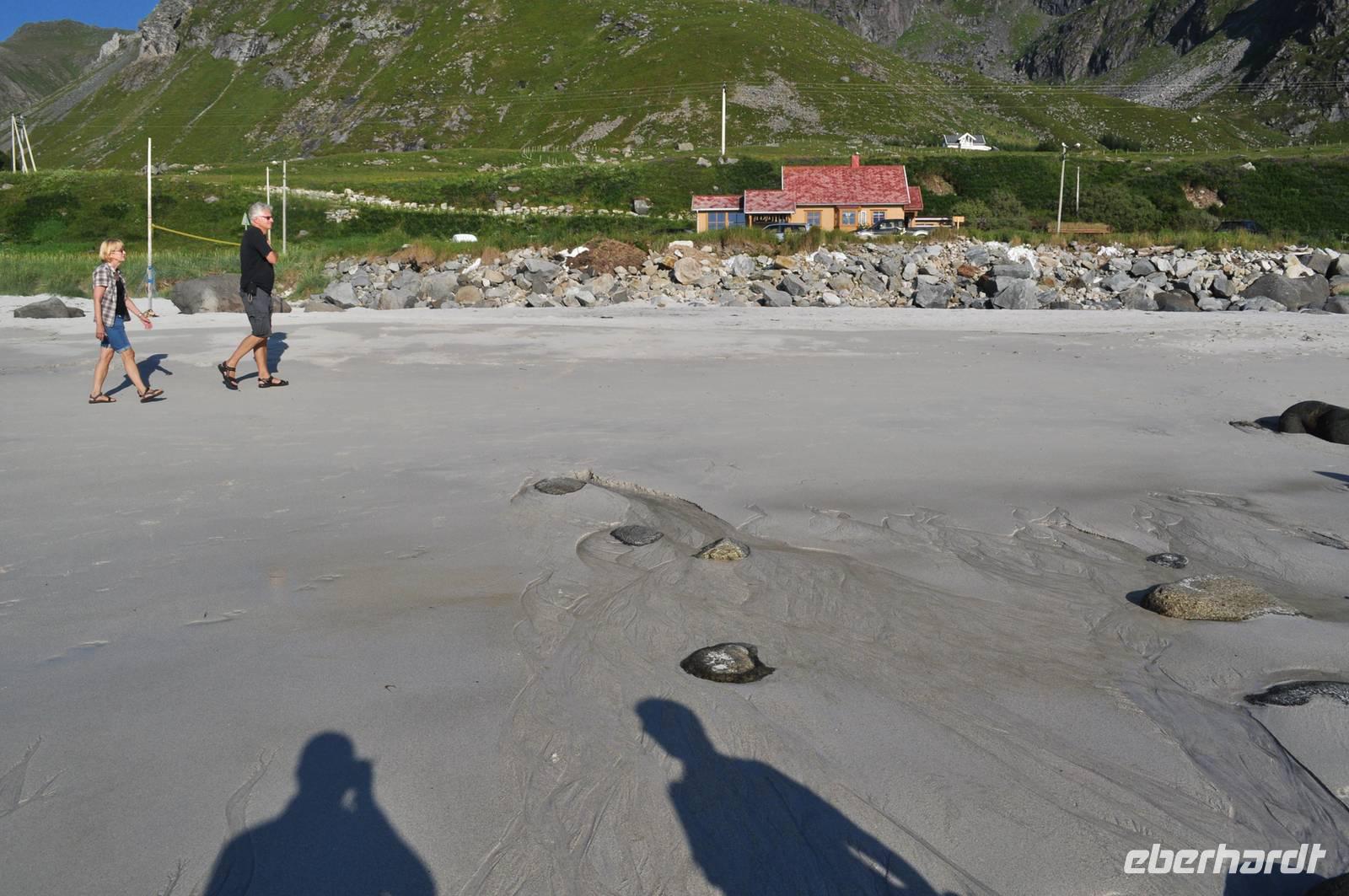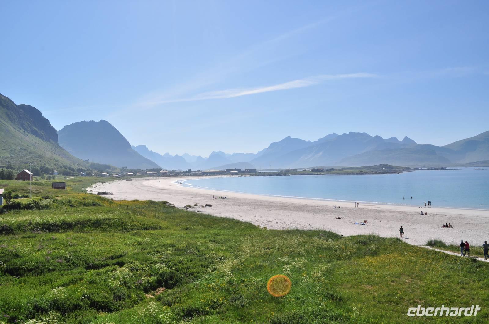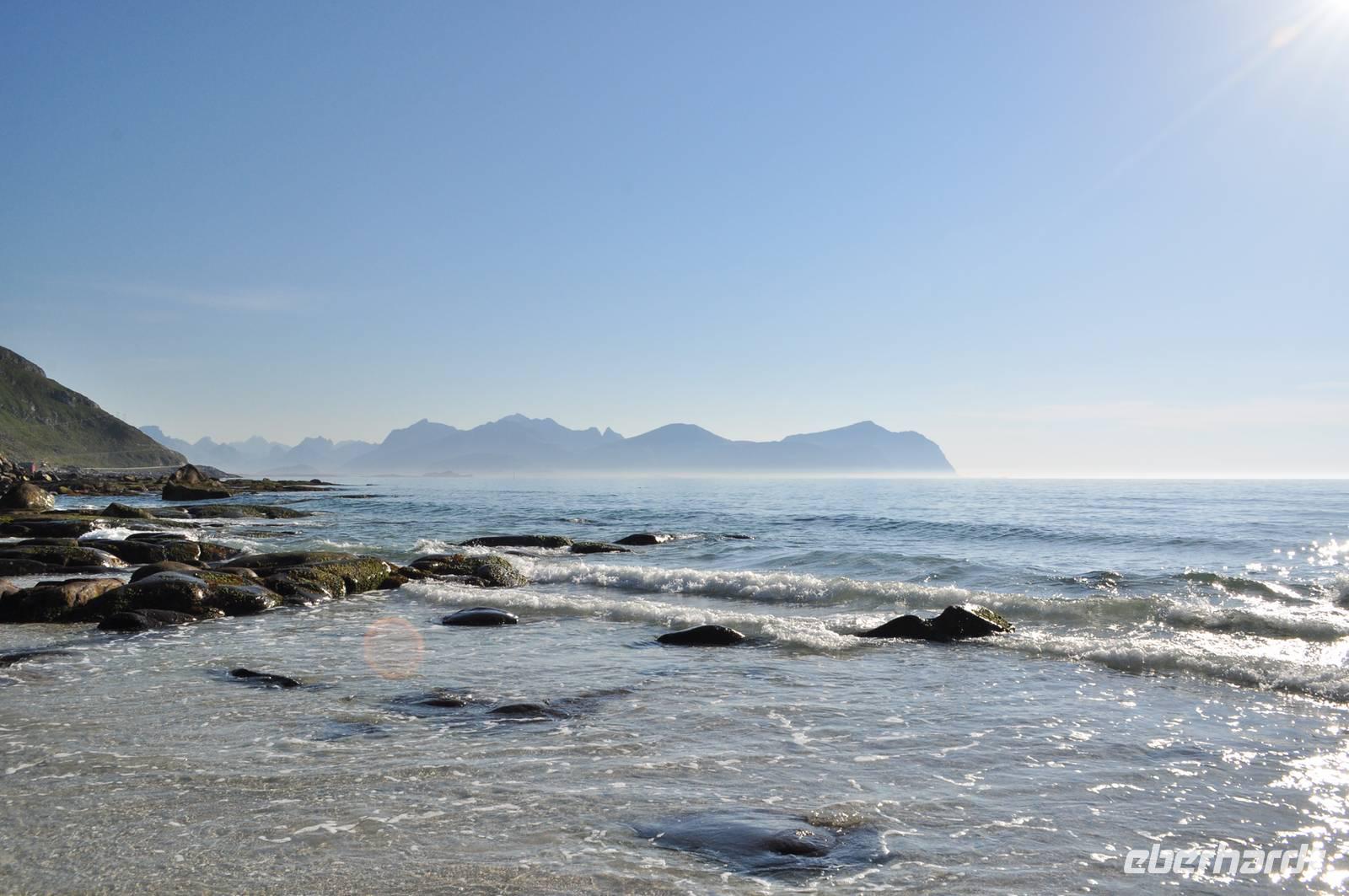 Über eine Reihe einspuriger schmaler Brücken erreichen wir die malerischen Fischerorte Å, Moskenes, Reine und Vikten. Am weißen Sandstrand gibt es sogar die Möglichkeit, das Meer bei karibischen Temperaturen jenseits der 30 Grad Marke zu genießen, es ist so heiß wie seit über