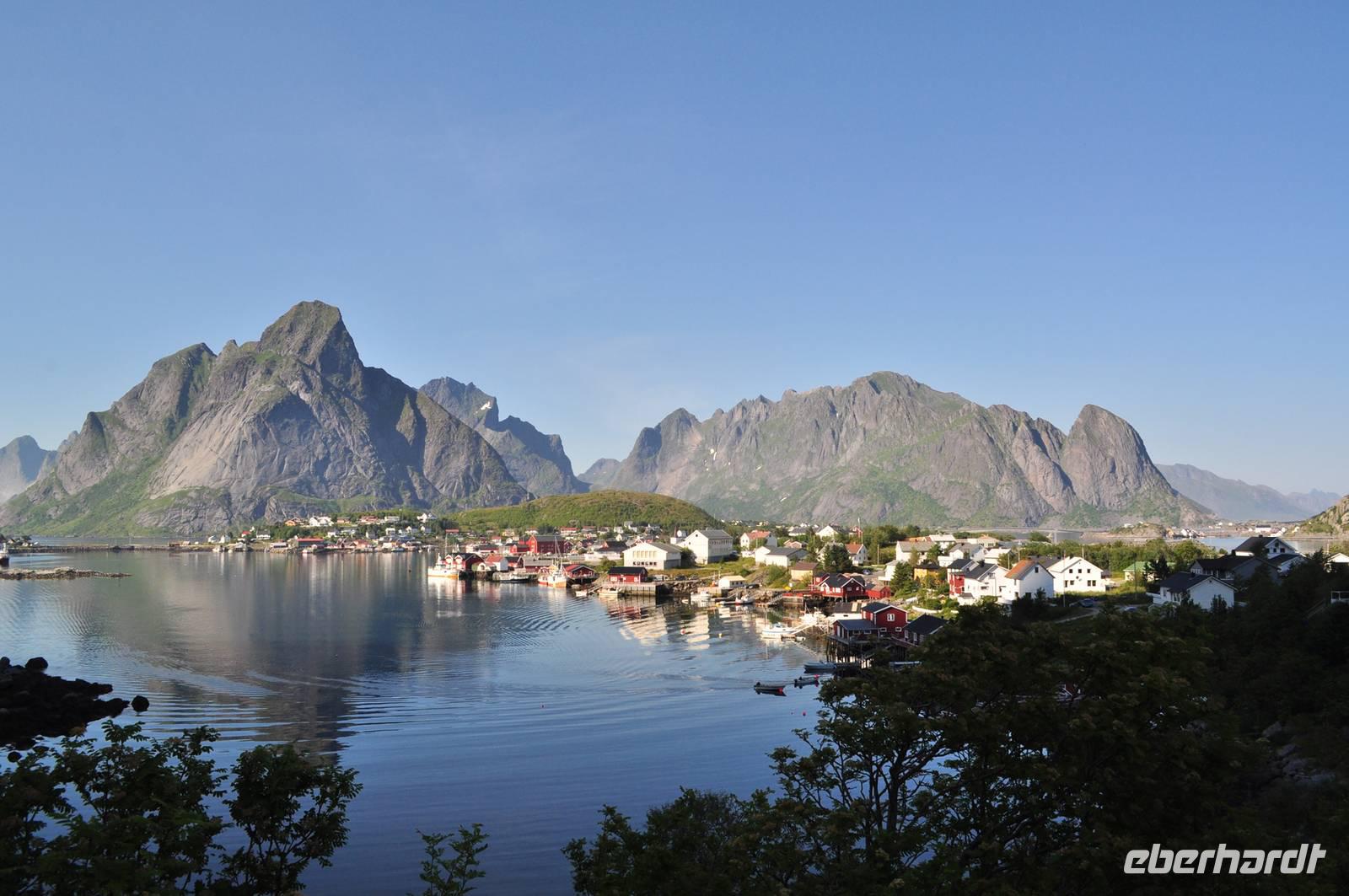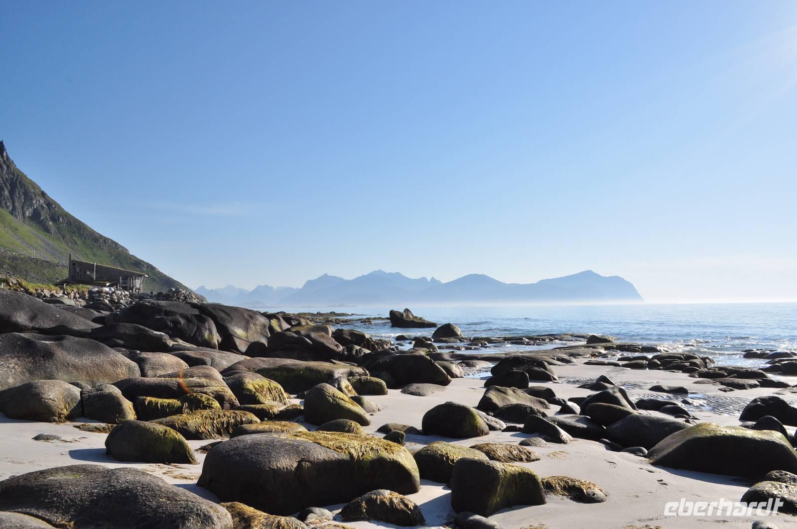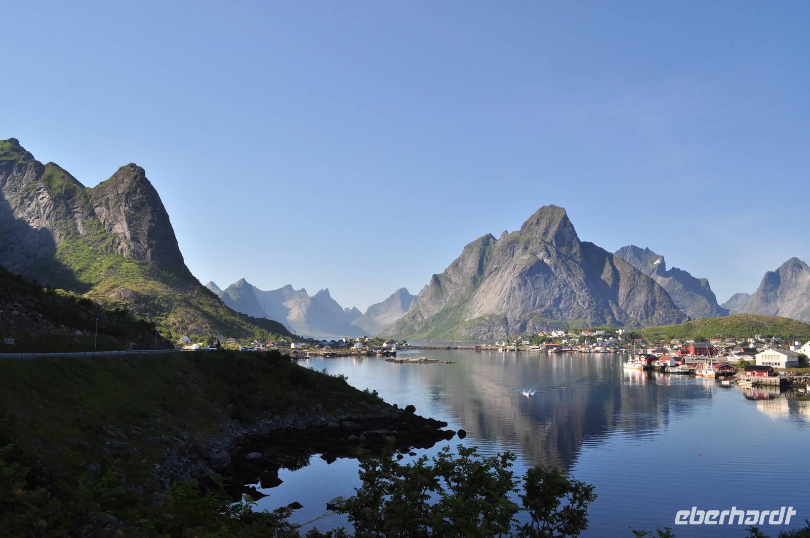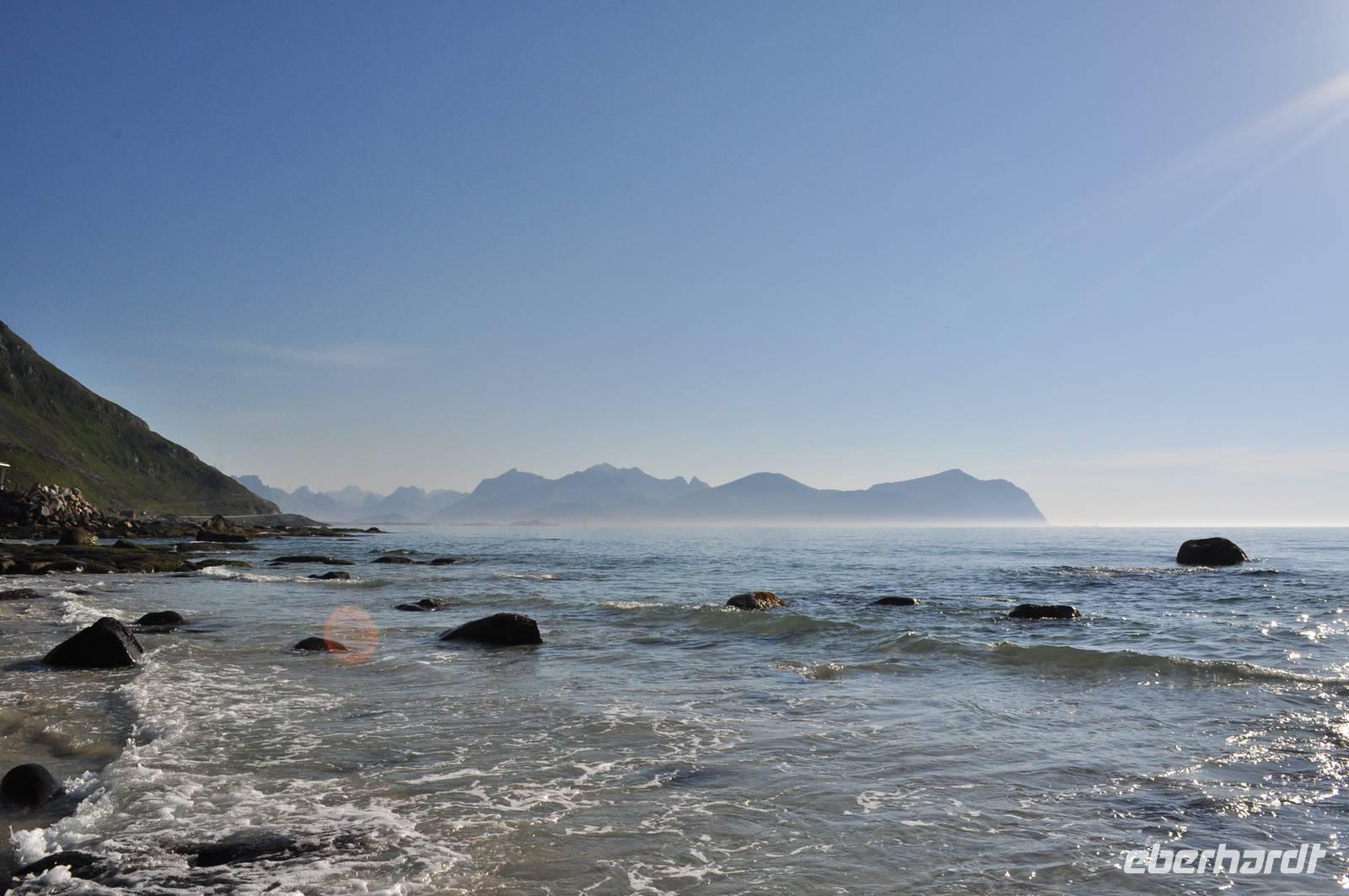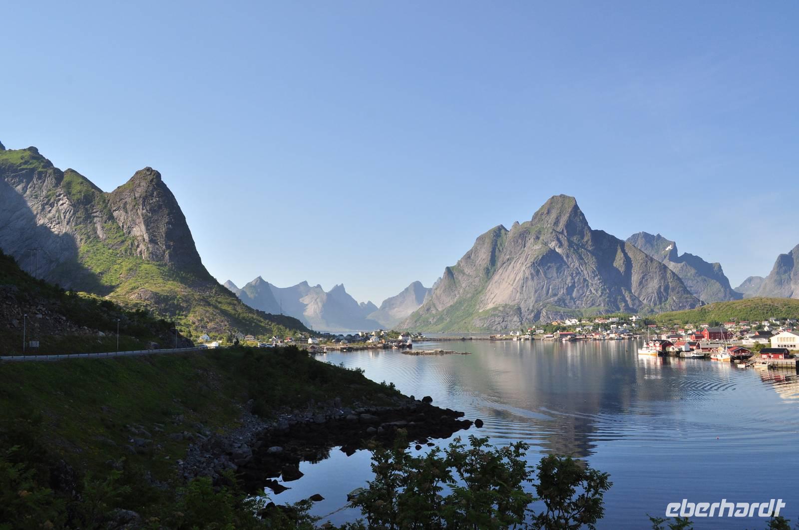 Über eine Reihe einspuriger schmaler Brücken erreichen wir die malerischen Fischerorte Å, Moskenes, Reine und Vikten. Am weißen Sandstrand gibt es sogar die Möglichkeit, das Meer bei karibischen Temperaturen jenseits der 30 Grad Marke zu genießen, es ist so heiß wie seit über
