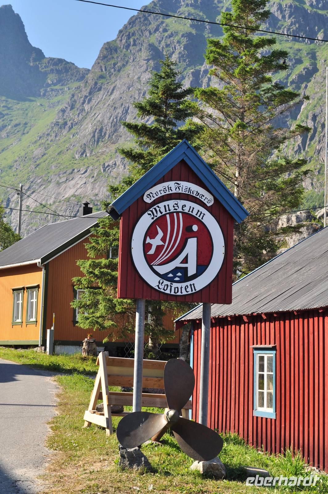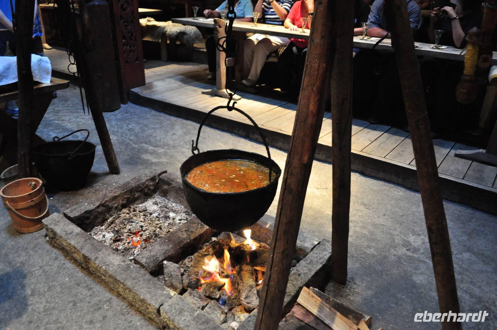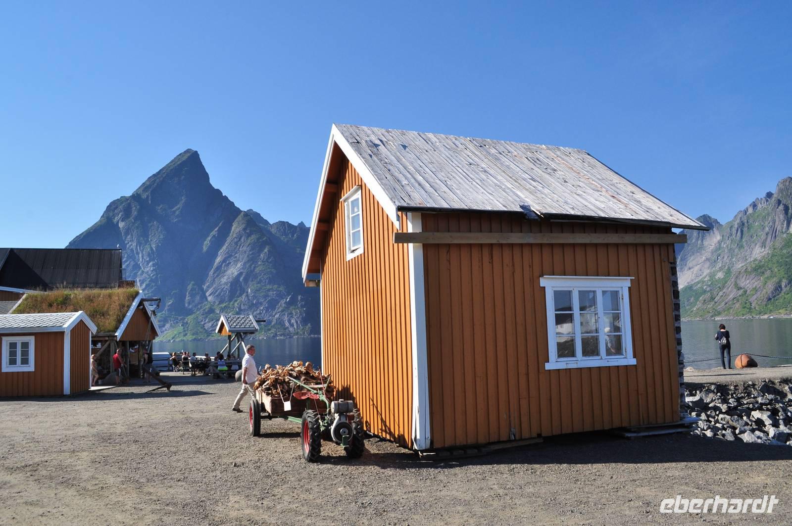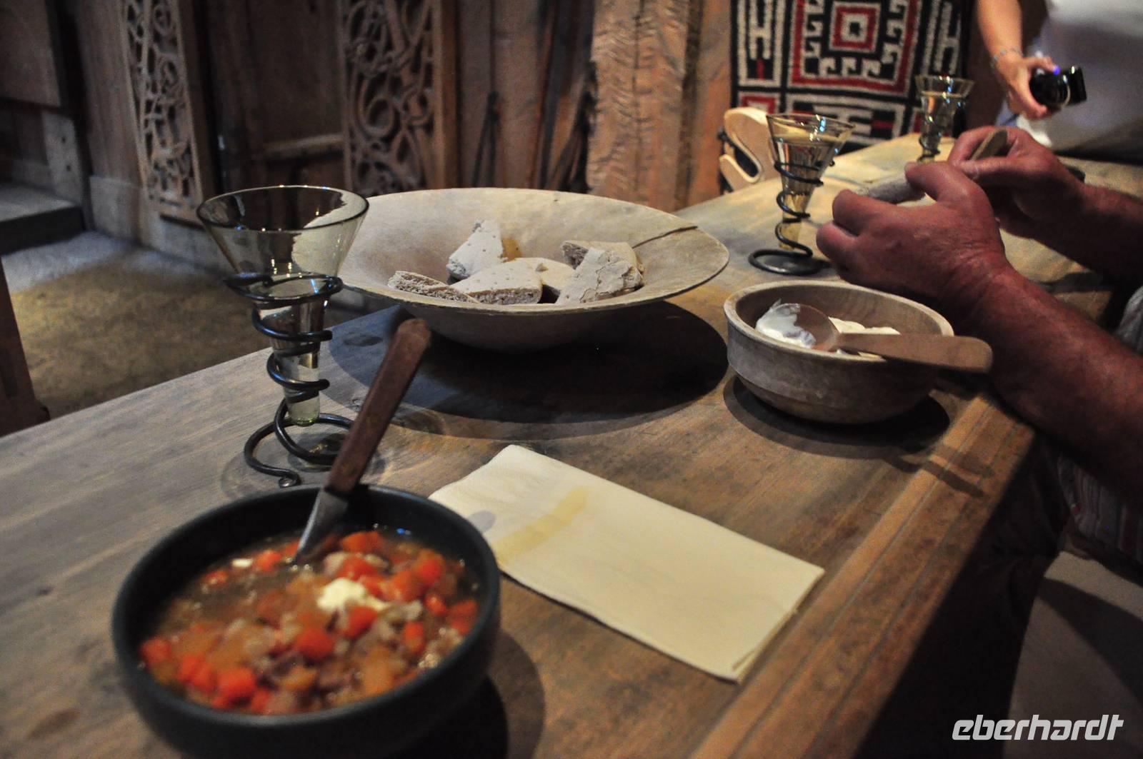 Aber damit nicht genug, nun beginnt die Führung. Ein Herr, er muss die Zeiten irgendwie überdauert haben, trägt traditionelle Wikingerkleidung, ist aber sehr friedlich und freundlich zu uns. Er lädt uns in sein Häuptlingshaus ein, in dem einige Frauen für uns eine deftige Suppe auf offenem Feuer zubereitet haben. Mit selbstgebackenem Wikingerbrot genießen wir diese Mahlzeit. Beim Essen erklärt er uns, wie das Leben hier vor rund 1.000 Jahren ablief.Gefesselt von den Eindrücken fahren wir weiter zum Endpunkt der E10 und der Lofoten. Der Name ist auch das Ende im norwegischen Wörterbuch: Å. Damit das nicht verwechselt wird, wird gelegentlich i Lofoten ergänzt, also Å i Lofoten.