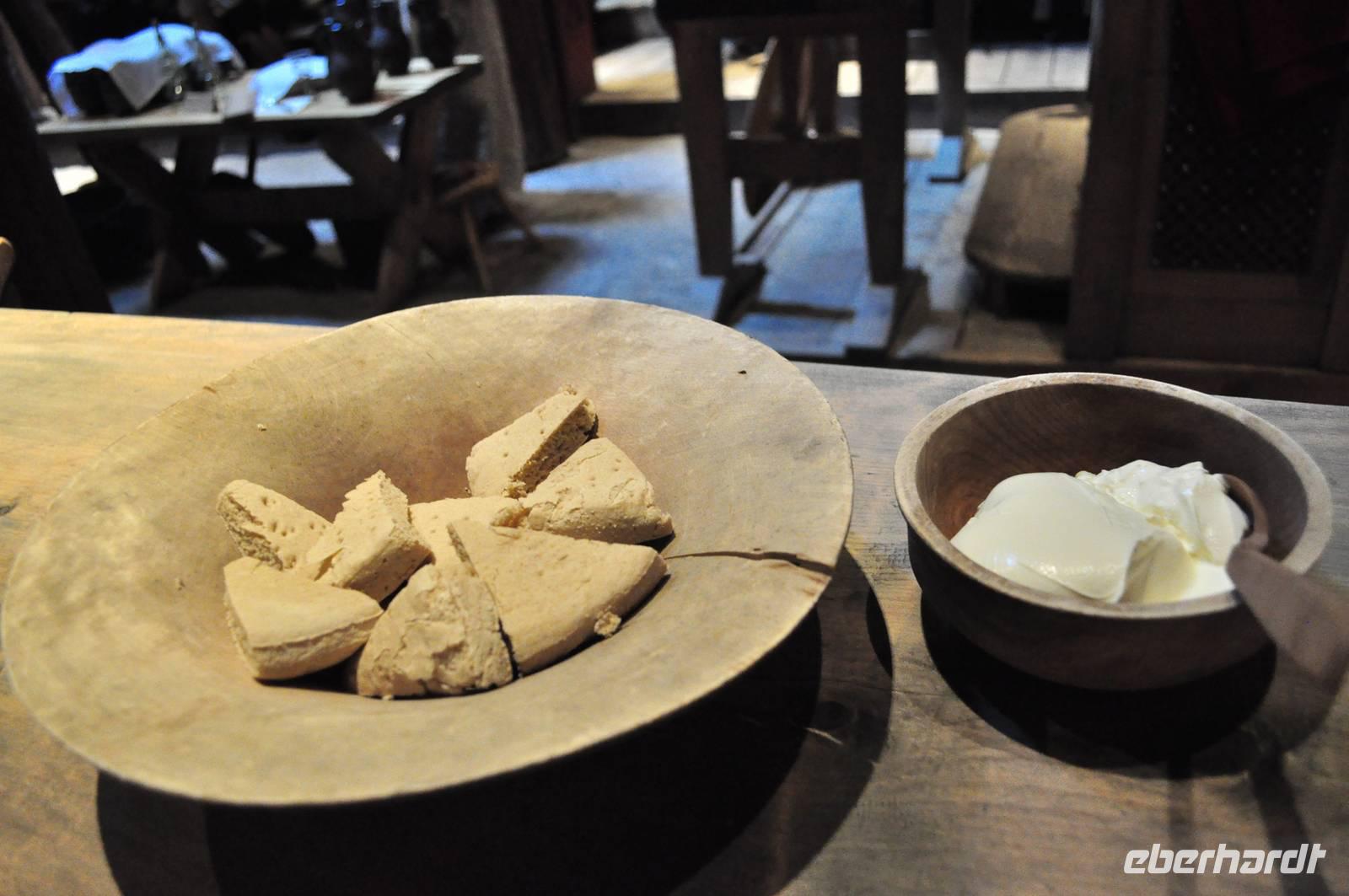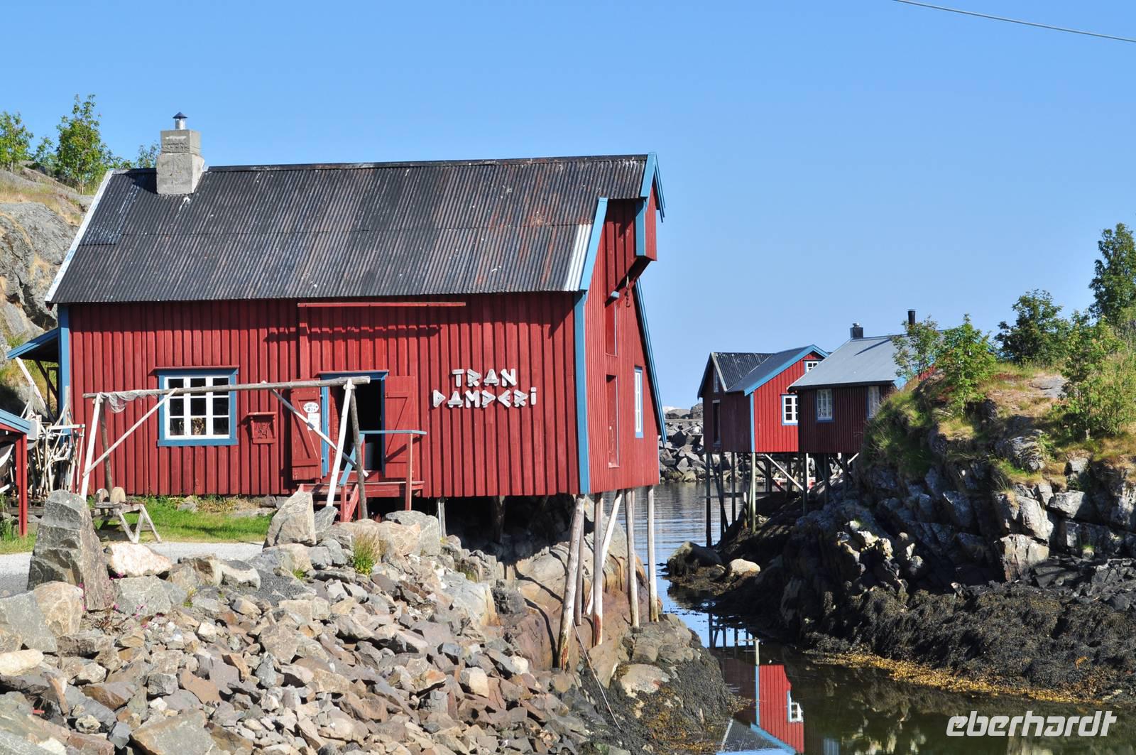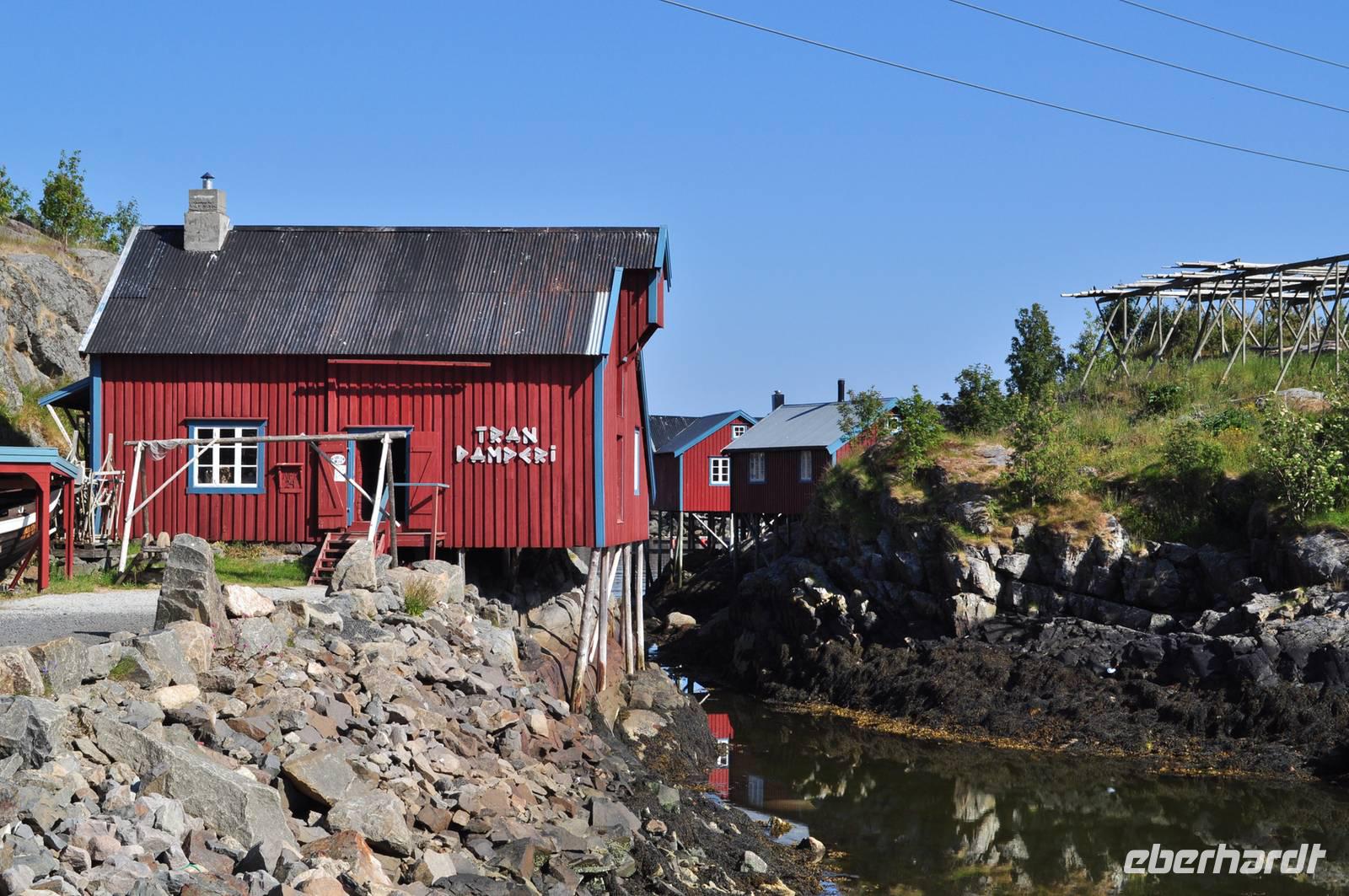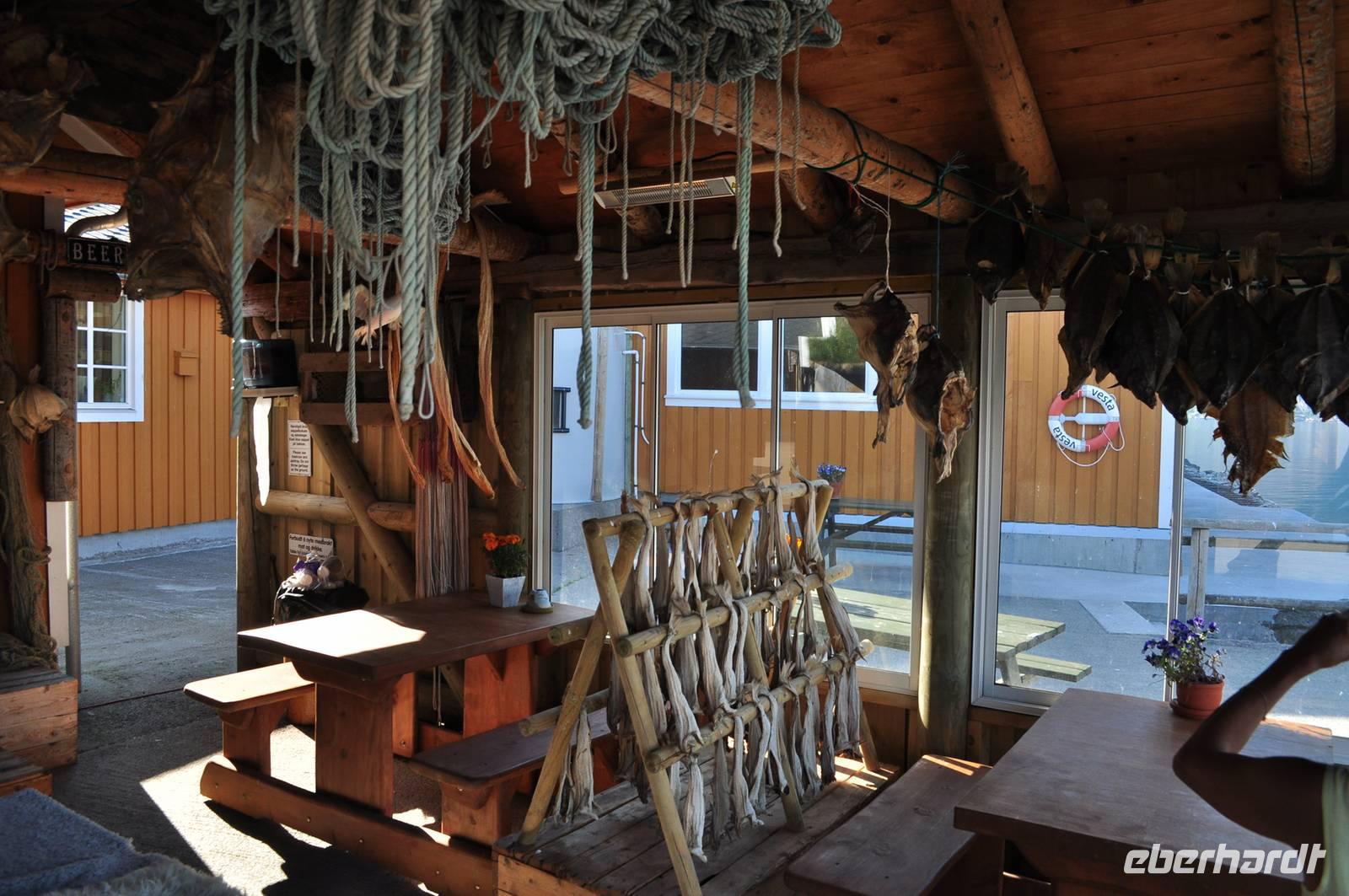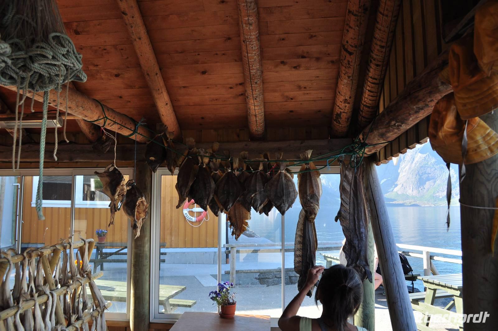 Aber damit nicht genug, nun beginnt die Führung. Ein Herr, er muss die Zeiten irgendwie überdauert haben, trägt traditionelle Wikingerkleidung, ist aber sehr friedlich und freundlich zu uns. Er lädt uns in sein Häuptlingshaus ein, in dem einige Frauen für uns eine deftige Suppe auf offenem Feuer zubereitet haben. Mit selbstgebackenem Wikingerbrot genießen wir diese Mahlzeit. Beim Essen erklärt er uns, wie das Leben hier vor rund 1.000 Jahren ablief.Gefesselt von den Eindrücken fahren wir weiter zum Endpunkt der E10 und der Lofoten. Der Name ist auch das Ende im norwegischen Wörterbuch: Å. Damit das nicht verwechselt wird, wird gelegentlich i Lofoten ergänzt, also Å i Lofoten.