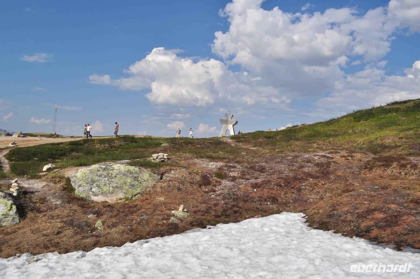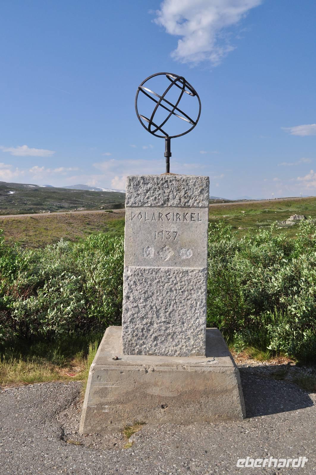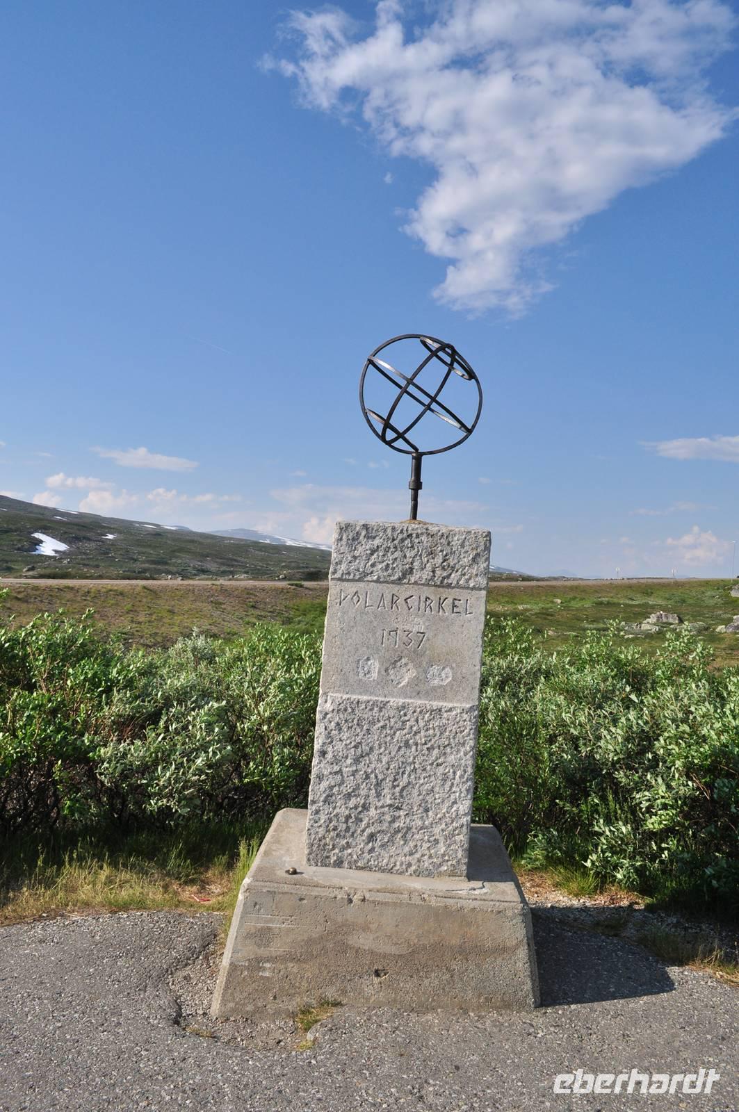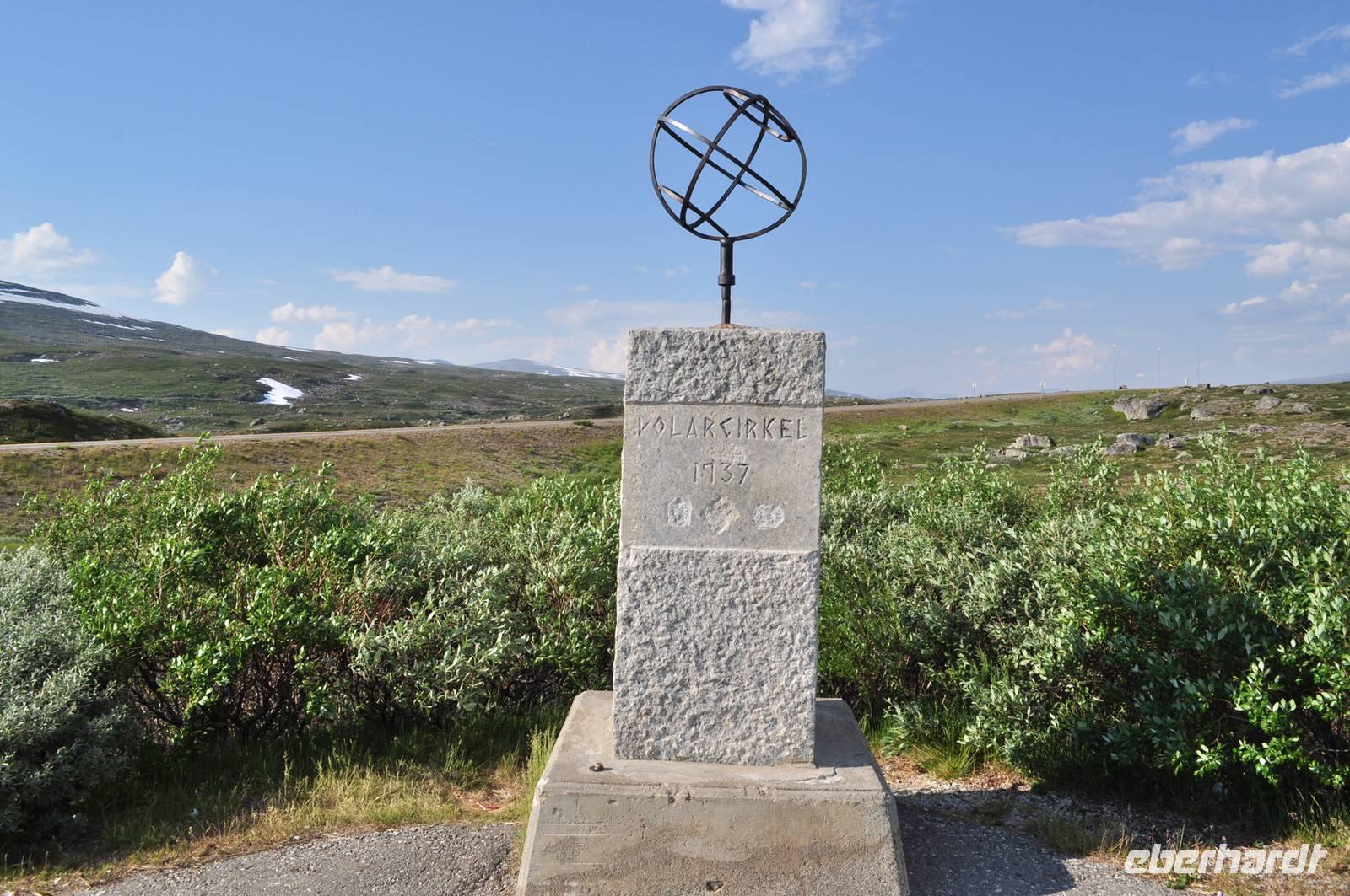 Ich werde von Norwegern offiziell beauftragt mich bei allen Reisegästen offiziell für einen elementaren Fehler der Norweger zu entschuldigen. Hier liege gar nicht der Polarkreis, es handele sich in Wahrheit um den Äquator. Er muss recht haben bei über 30°C Außentemperatur!!! Nur die umliegenden Schneefelder ermöglichen den Glauben an die Grenze zur Arktis.