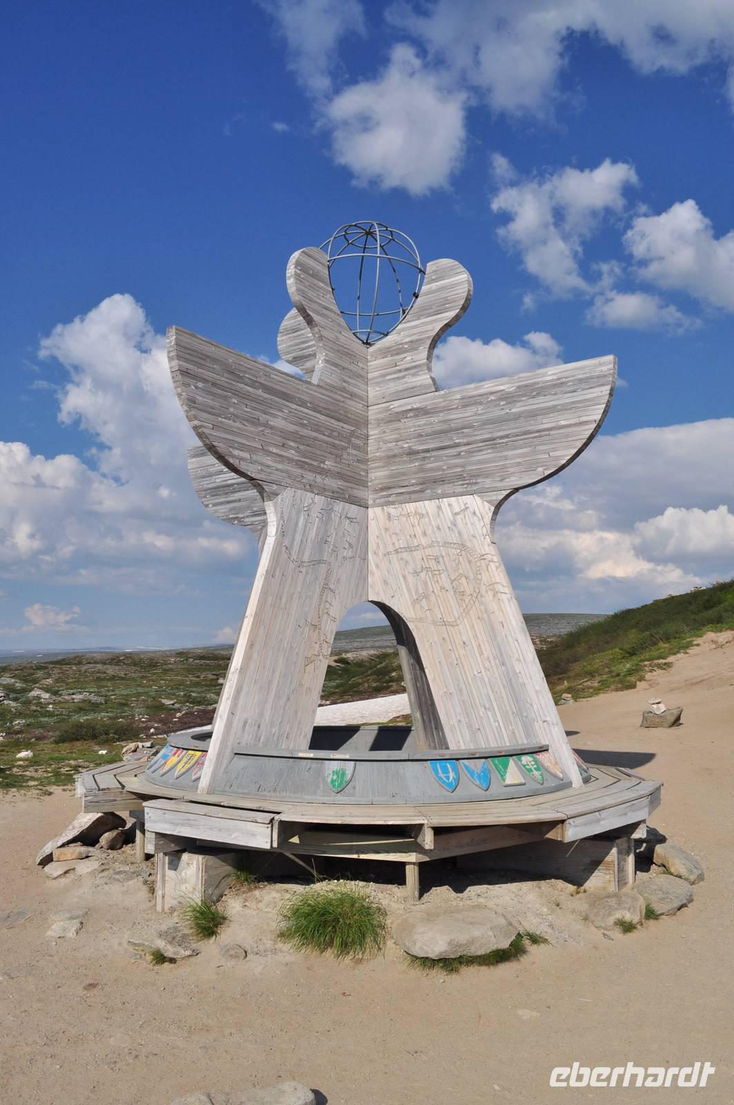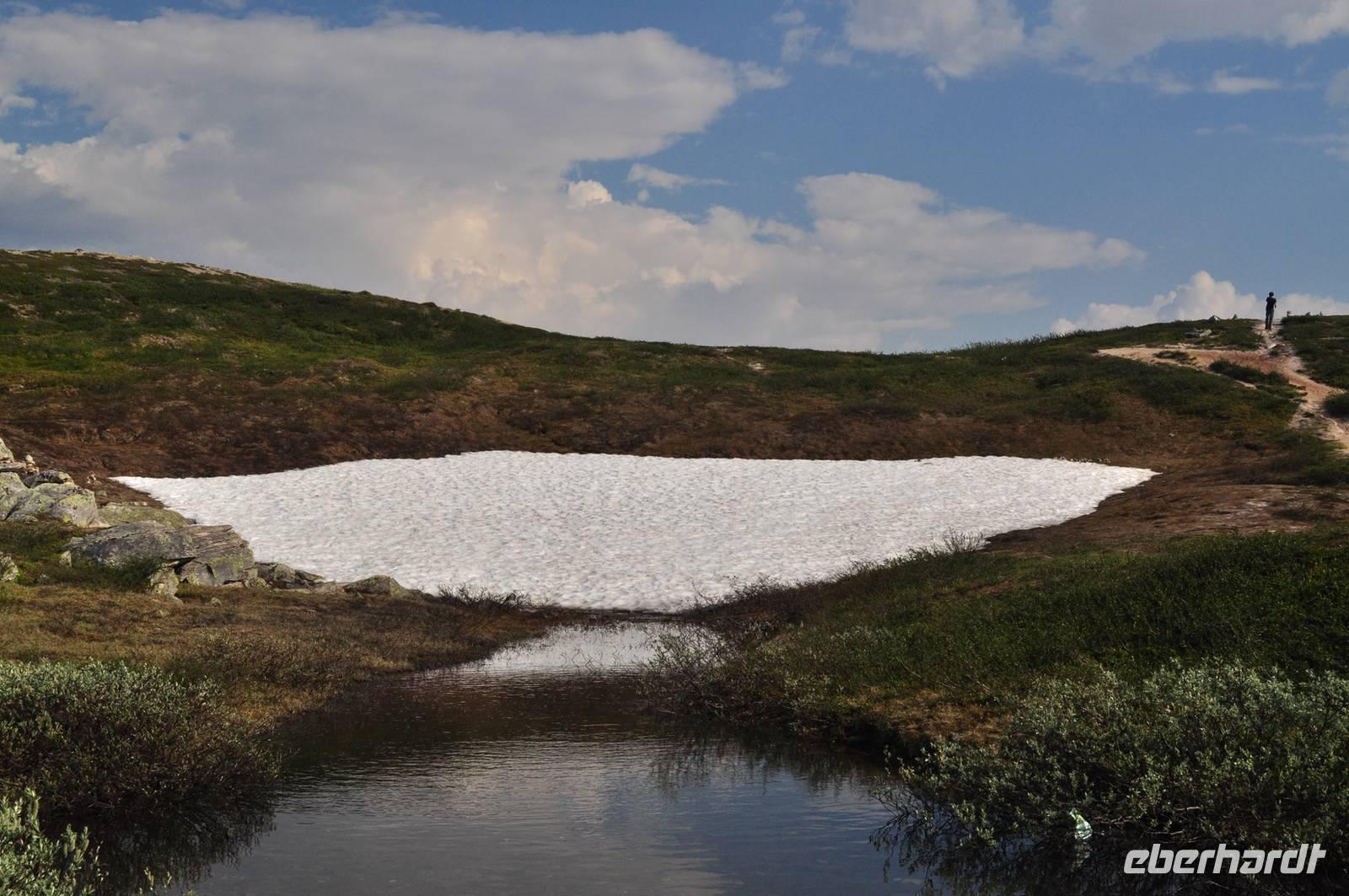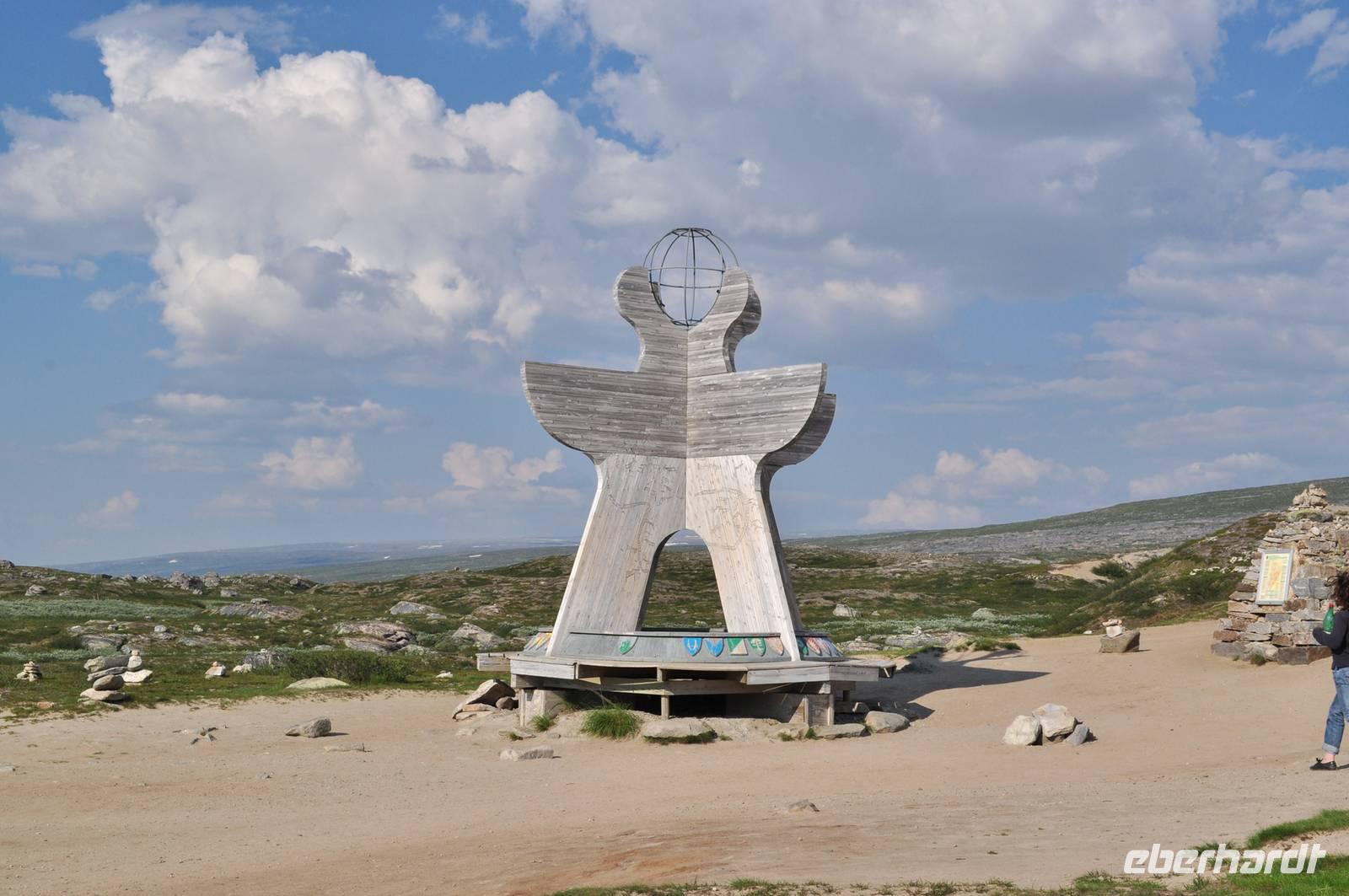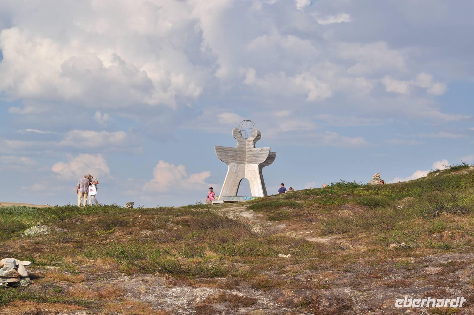 Ich werde von Norwegern offiziell beauftragt mich bei allen Reisegästen offiziell für einen elementaren Fehler der Norweger zu entschuldigen. Hier liege gar nicht der Polarkreis, es handele sich in Wahrheit um den Äquator. Er muss recht haben bei über 30°C Außentemperatur!!! Nur die umliegenden Schneefelder ermöglichen den Glauben an die Grenze zur Arktis.