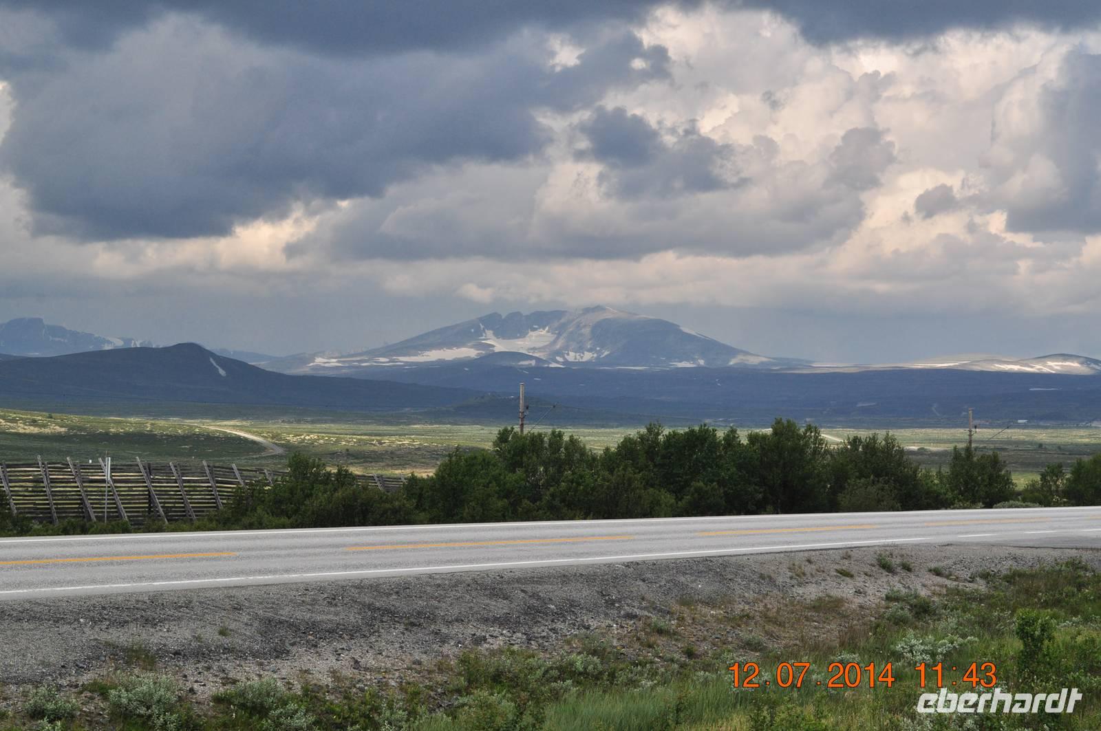 Es folgt ein Fotostopp, in der Ferne liegt die Bergkette der Snøhetta.