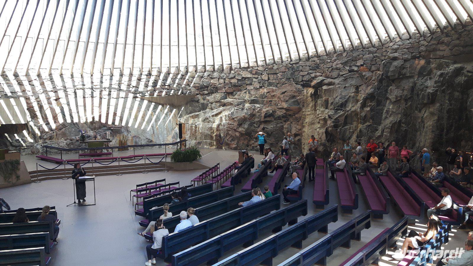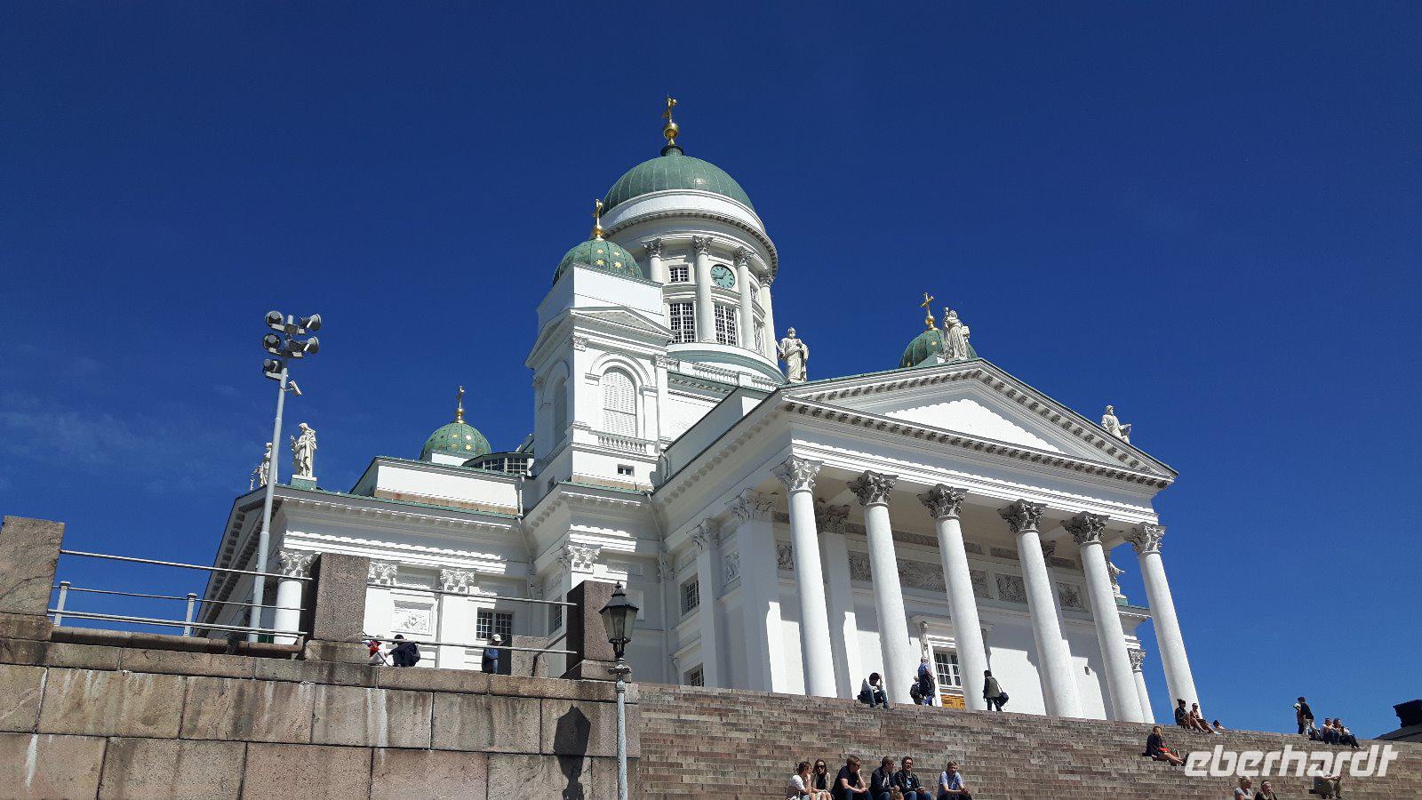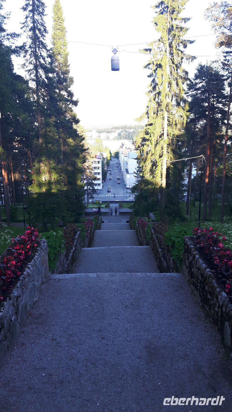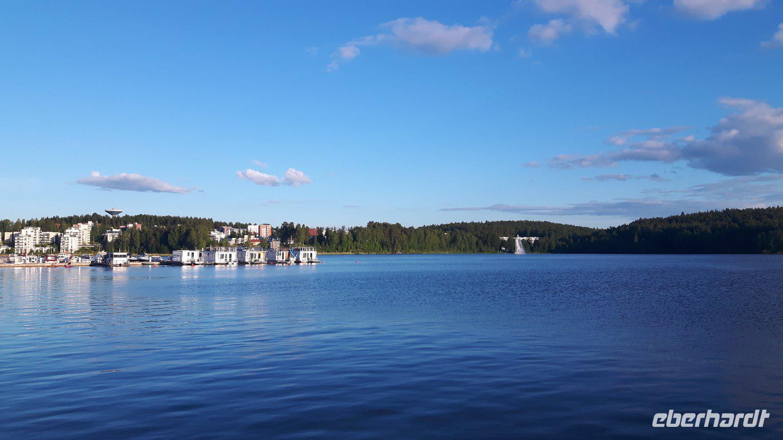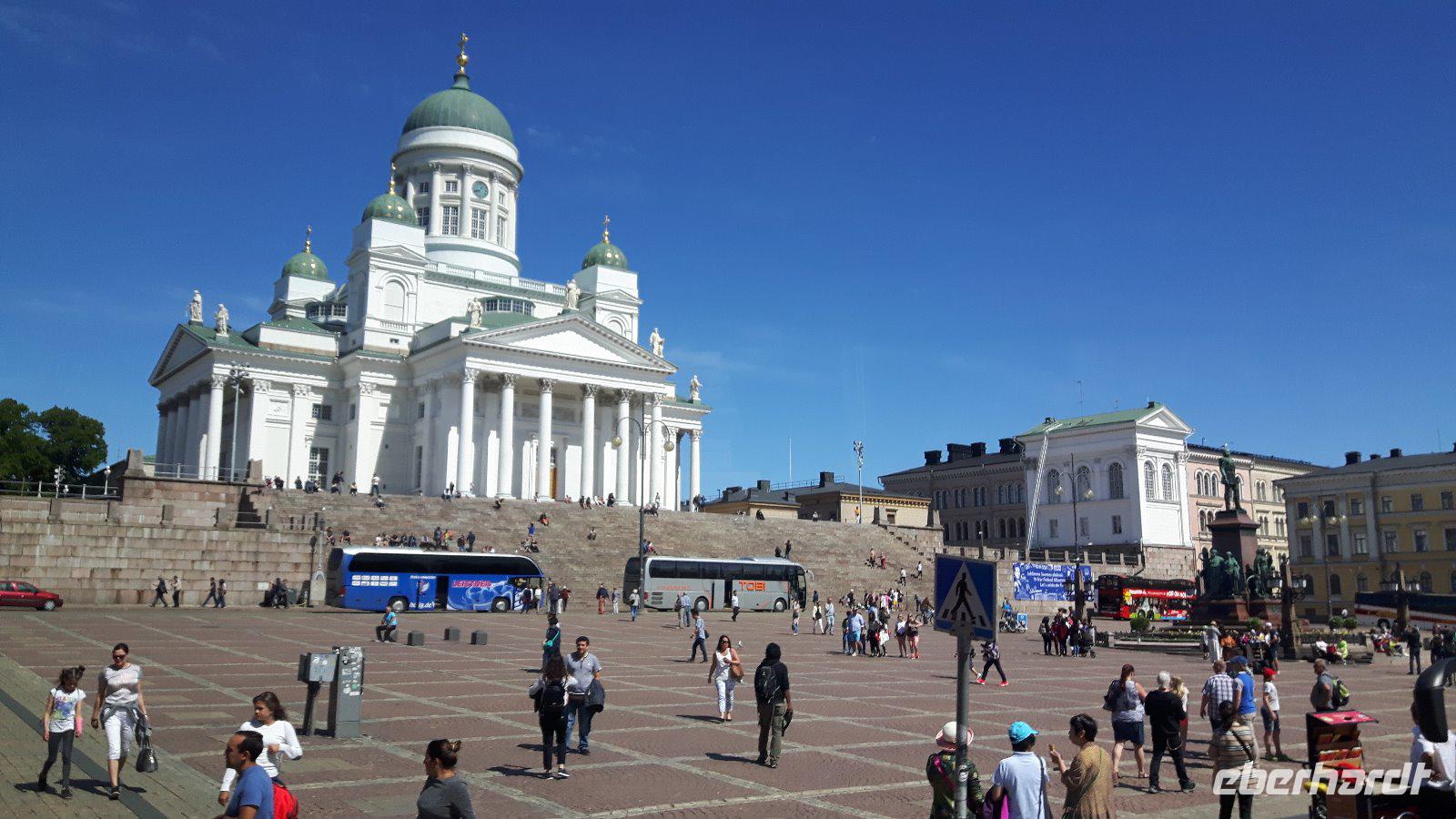 Nach einer ruhigen und erholsamen Nacht auf See genossen wir erst einmal ein reichhaltiges Frühstücksbuffet an Bord unseres „Schwimmenden Hotels". Die finnische Hauptstadt empfing uns mit strahlendem Sonnenschein - besser konnte es nicht sein! Nach dem großen Gewühle beim Auschecken von Bord waren wir froh, uns alle wohlbehalten wieder zu treffen und Kielo, unsere Stadtführerin, erwartete uns bereits vor dem hiesigen Olympia-Terminal. Sie verriet uns sofort, dass ihr Name übersetzt „Maiglöckchen" heißt. Bevor wir allerdings unsere Stadtrundfahrt begannen, erfolgte ein durch gesetzlich vorgeschriebene Lenkzeiten für Buschauffeure bedingter Fahrerwechsel - von Matthias, unserem umsichtigen Chauffeur der ersten 3 Reisetage mussten wir uns an dieser Stelle vorerst verabschieden und Harald, der extra nach Helsinki eingeflogen wurde, übernahm an dieser Stelle das Lenkrad im Bus. Jetzt begann unsere Stadtrundfahrt durch Helsinki. Dabei besuchten wir das Sibelius-Denkmal, den Felsendom, den weiträumigen Senatsplatz mit dem Dom und bekamen viele weitere schöne Straßen, Plätze, Denkmäler und Bauwerke gezeigt bzw. erklärt. Etwas Freizeit in der Nähe der Markthalle und des Rathauses rundete unseren Besuch in Helsinki ab. Am Nachmittag ging es dann schon weiter nach Lathi, zu den berühmten Sprungschanzen. Hier legten wir natürlich einen Fotostopp, verbunden mit einer kleinen Kaffeepause, ein. Von Lahti aus, ganz im Süden des Pääjärvi, führte uns unser Weg ganz in den Norden dieses 1.900 km² großen Sees der finnischen Seenplatte nach Jyväskylä, der Heimatstadt des finnischen Stararchitekten Alvar Aalto, und gleichzeitig auch unserem heutigen Übernachtungsort. Bewaffnet mit einem Stadtplan gingen so einige Gäste nach dem Abendessen noch auf individuelle Entdeckungstour. Diese lebhafte Studentenstadt liegt inmitten wunderschöner Landschaften und bietet zahlreiche Möglichkeiten - die meisten Gäste erkundeten den Stadtsee und den kleinen bezaubernden Hafen.