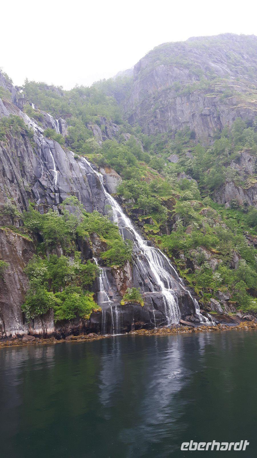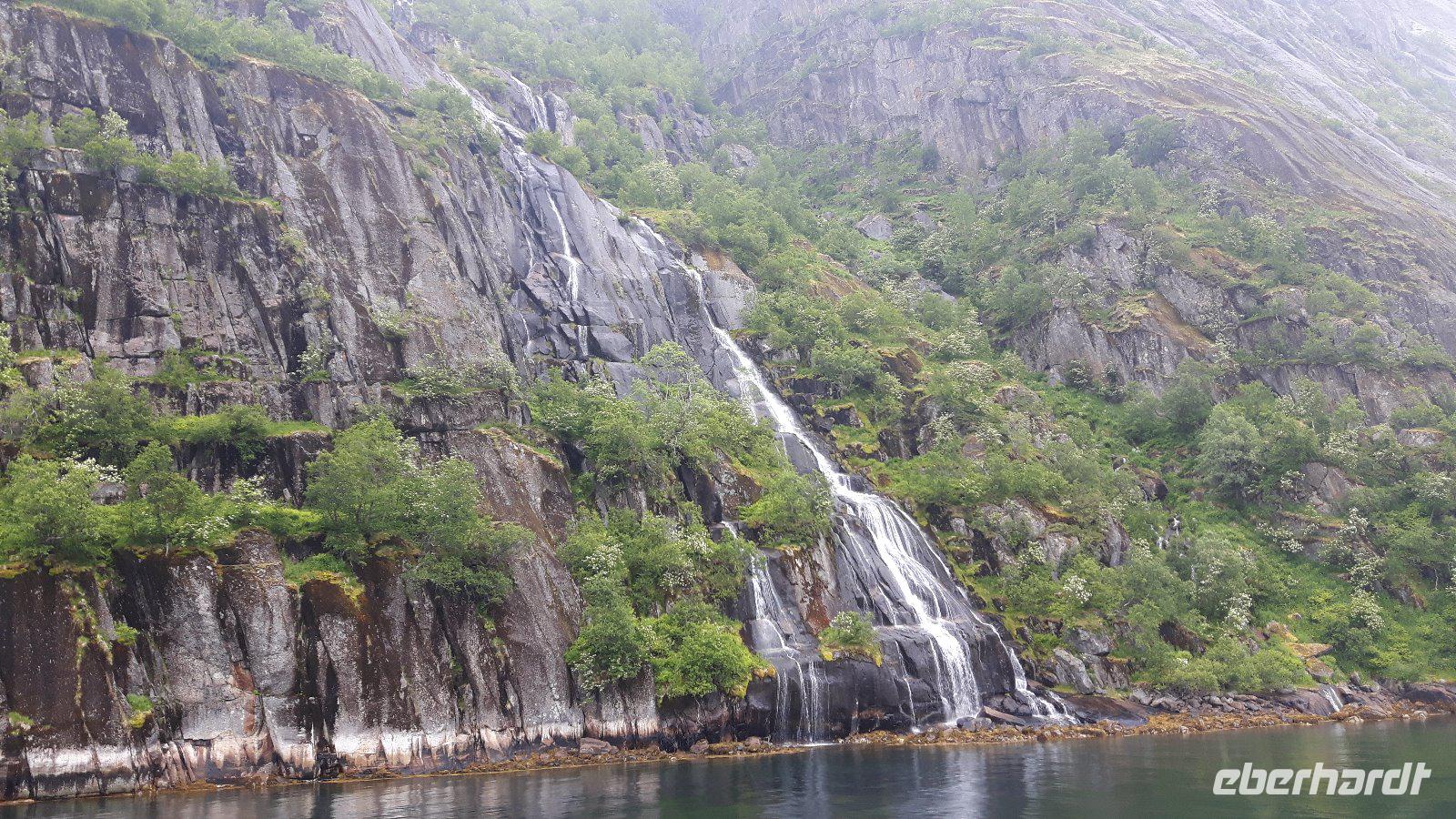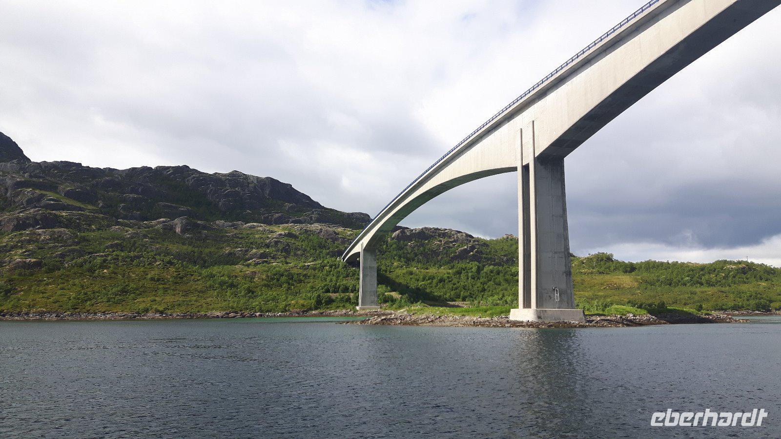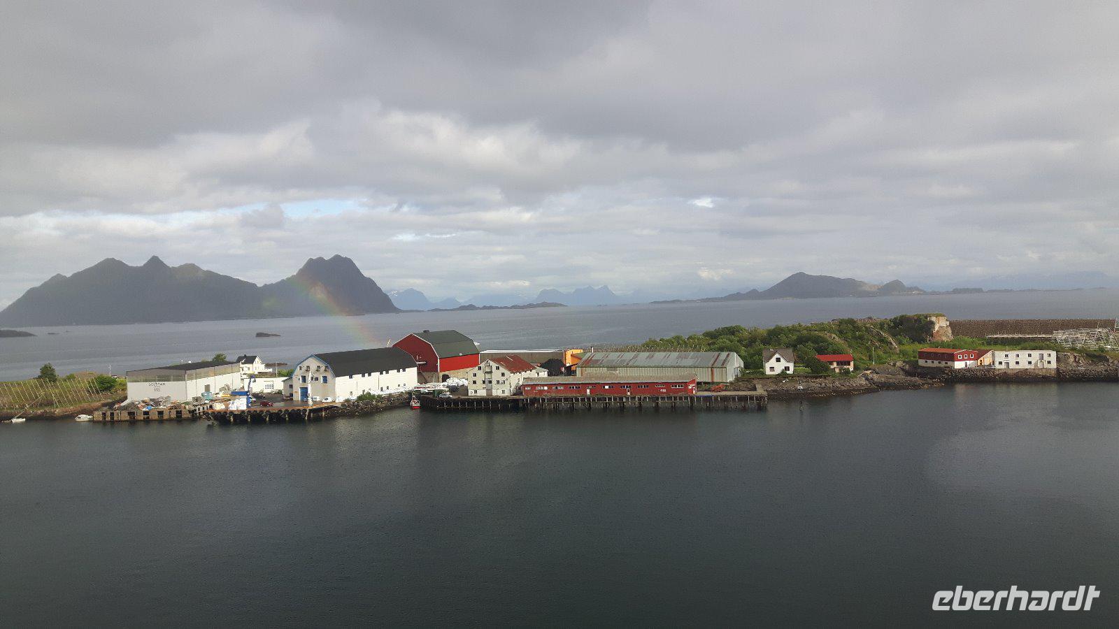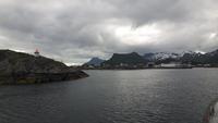 Am heutigen Morgen hingen tiefe Wolken über der Stadt und über dem Tromsøsund. Die 1965 erbaute Eismeerkathedrale war unser erstes Ziel und gilt gleichzeitig als Wahrzeichen der Stadt. Wer wollte, konnte die Kirche von innen besichtigen und hatte so einen besonderen Eindruck - vor allem das bunte Glasfenster hinter dem Altar, eines der größten Glasgemälde Europas, beeindruckte. Wieder auf der Europastraße 6 angekommen, ging es weiter in Richtung Bardufoss - der nahe gelegene norwegische Nationalwasserfall Målselvfossen war unser Ziel. Gegen Mittag trafen wir ein und es wurde so langsam Zeit für eine kleine Mahlzeit. Bei Ankunft wurde den meisten von uns eine herrlich schmackhafte Lachssuppe mit extra viel Fisch gereicht - ein Gedicht...! Anschließend hatten wir Gelegenheit, uns die 600 Meter langen tosenden Wassermassen aus der Nähe anzuschauen. Der Wasserfall weist nämlich mitunter ein Wasservorkommen von 750 m³ pro Sekunde auf und hat drei Stufen mit einer Gesamtfallhöhe von 22 Meter. Es war insgesamt ein ungeheuer grandioses Naturerlebnis! Berühmt ist er vor allem durch seine Lachse und wir konnten die mit 450 Metern längste Lachstreppe Nordeuropas besichtigen - einige wenige Lachse waren zu sehen. Viel Glück hatten wir nicht, denn leider war heute selbst an dem in die Lachstreppe eingebauten Fenster im Lachsaquarium nicht viel zu sehen! Nichts desto Trotz - gut gelaunt reisten wir weiter durch die Berge und über die Fjelle von Troms... und gegenüber von Narvik am Ofotfjord entlang. Nach der Überquerung der Tjeldsundbrücke kamen wir auf der Insel Hinnøya, der mit Ausnahme von Spitzbergen größten Insel Norwegens, an. Bereits am Nachmittag erreichten wir die im nördlichen Teil dieser Insel gelegene Stadt Harstad, unser nächstes Etappenziel. Hier blieb Zeit für einen gemütlichen Spaziergang entlang des geschützten Hafens, obwohl der „Wettergott" heute nicht so ganz mitspielte und es leider teilweise sogar regnete.
