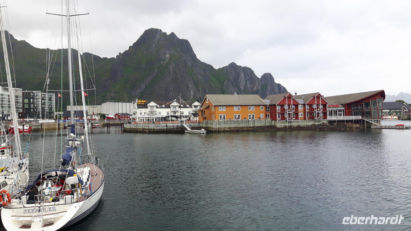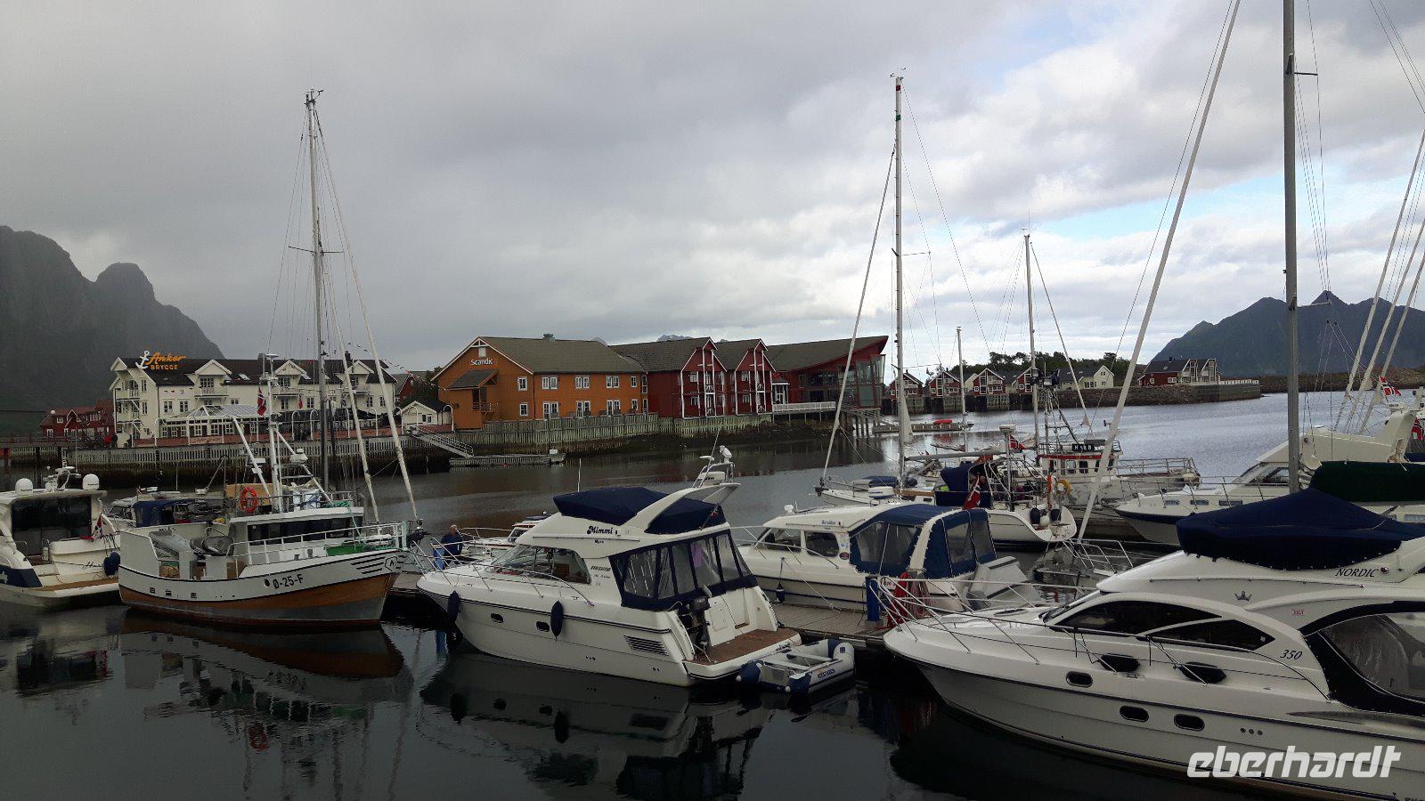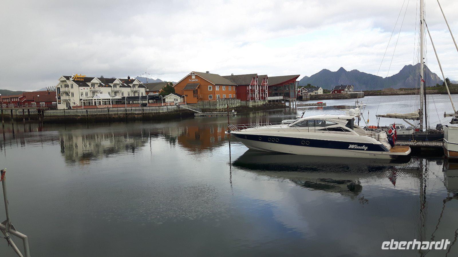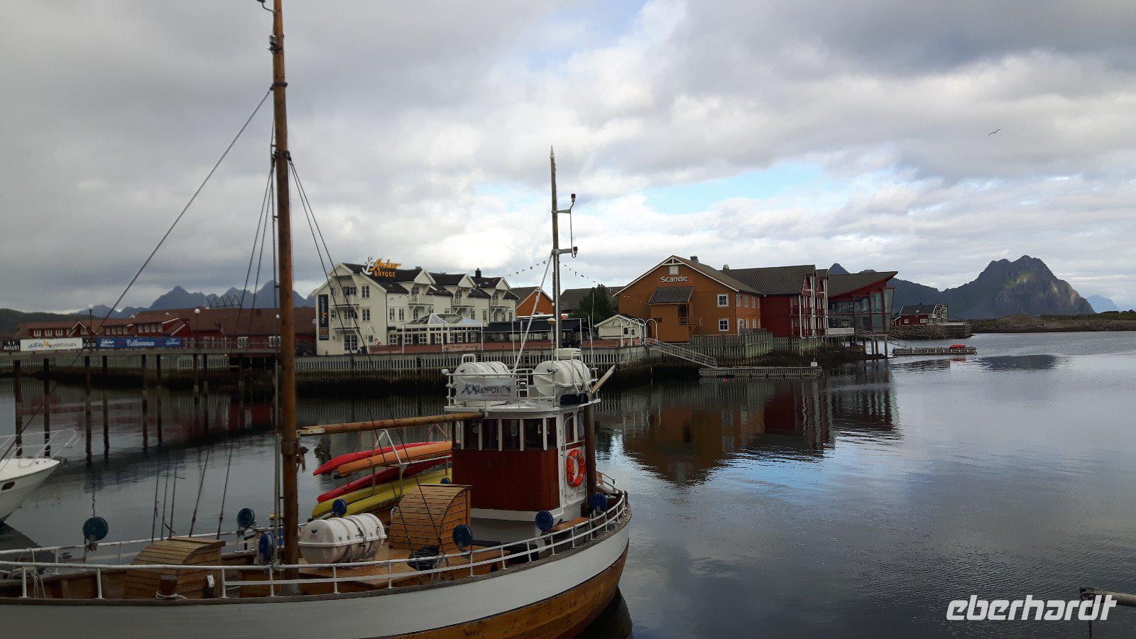 Heute hieß es vorerst „Ausschlafen" und in aller Gemütlichkeit frühstücken. So ein ruhig startender Tag war dringend nötig, denn wir waren ja nunmehr schon ein paar Tage unterwegs und hatten schon so einiges erlebt. Gegen 10 Uhr starteten wir jedoch, denn wir wollten auch heute wieder einiges sehen... Nur eine kurze Fahrt und wir kamen auf der Halbinsel Trondenes an, wo sich direkt vor den Toren der Stadt die Kirche von Trondenes, die nördlichste mittelalterliche Steinkirche, befindet. Von dieser Landzunge aus hatte man übrigens auch einen tollen Blick auf die Stadt Harstad! Weiter ging es auf relativ schmalen Straßen und durch viel unberührte Natur mit nur wenigen kleinen Ortschaften zu einer kleinen Rundfahrt durch den nördlichen Teil der Insel Hinnøya - schließlich hatten wir heute alle Zeit der Welt...! Unsere Mittagspause legten wir dann später in Lødingen, dem sogenannten „Tor zu den Lofoten", ein. Anschließend brachte uns unser Reisebus über die Raftsundbrücke zum kleinen Hafenort Hanoy, wo wir bereits vom Kapitän des extra für uns gecharterten Schiffes, der MS „Øykongen", erwartet wurden. Unser Buschauffeur Harald brachte uns direkt ans Schiff und somit war durch die kurzen Wege ein schneller Umstieg möglich. Harald fuhr allein von dannen und ihn sollten wir erst in Svolvaer wieder treffen. Unsere Seeadler-Safari konnte nunmehr beginnen! Voller Erwartungen ging es vorerst durch die Meerenge des Raftsundes zum Trollfjord. Hier beeindruckte uns in erster Linie die grandiose Landschaft, denn 1.000 Meter hohe Felsen ragen steil in die Höhe! Niemand konnte sich in diesem Moment vorstellen, dass hier tatsächlich die Hurtigrutenschiffe und auch Kreuzfahrtschiffe hinein fahren können, denn die Einfahrt in den Fjord ist mit 100 Metern sehr schmal! Die Besatzung unseres Schiffes fütterte die Möwen, denn so sollten angeblich dann auch die Seeadler in die Nähe kommen. Wir ließen uns überraschen und tatsächlich umkreiste schließlich ein Seeadler unser Boot. Es ist schon ein einmaliges Erlebnis, diese riesigen Vögel live zu erleben. Am späten Nachmittag erreichten wir unser heutiges Ziel, den Hafen von Svolvær und spazierten sogleich zu unserem unweit gelegenen Scandic-Hotel. Durch die Zentrale Lage des Hotels war auch hier die Möglichkeit gegeben, einen individuellen Bummel durch den idyllischen Ort zu unternehmen.