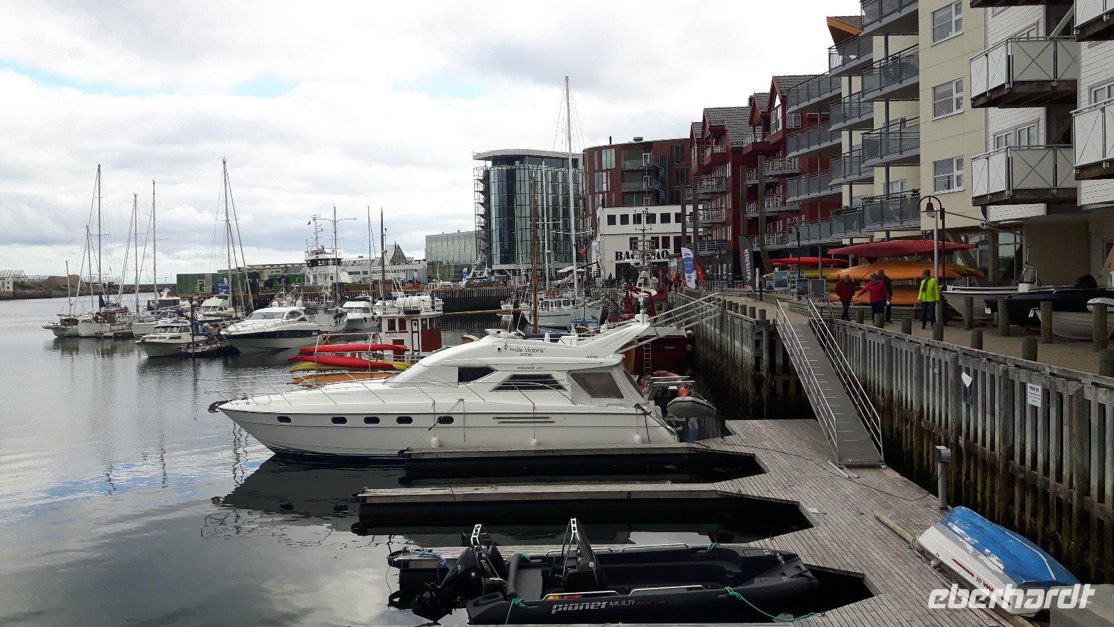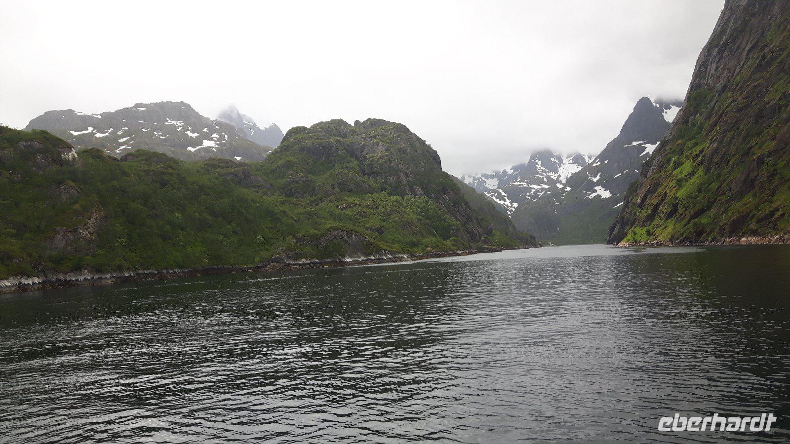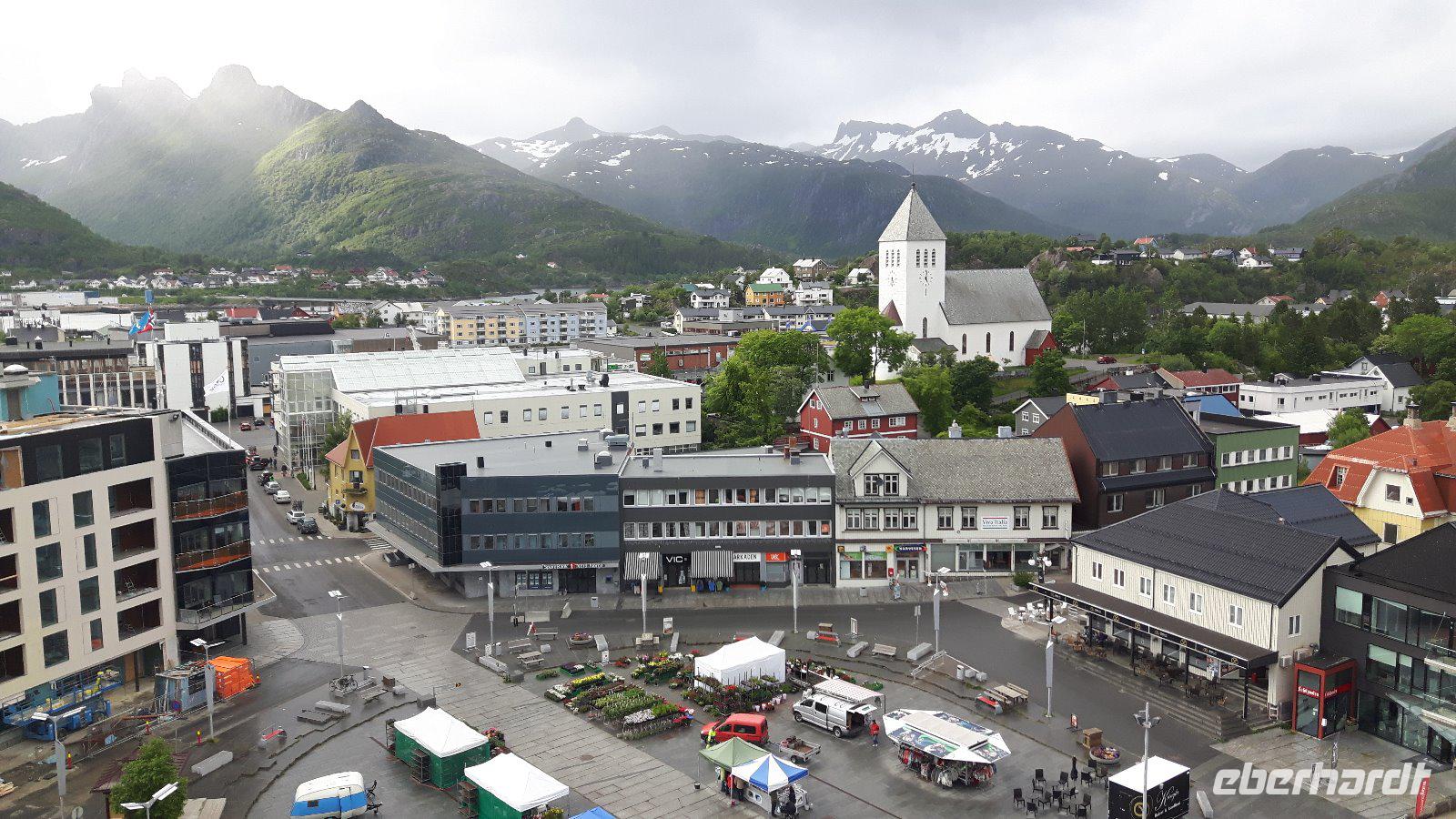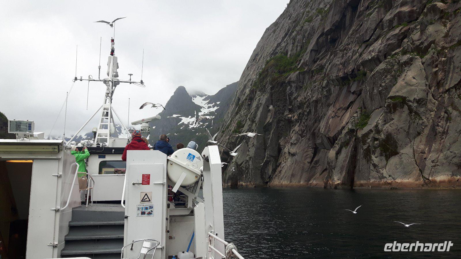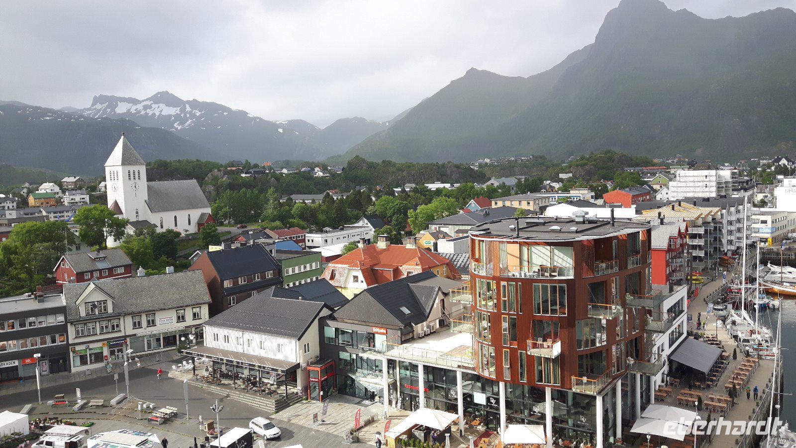 Heute hieß es vorerst „Ausschlafen" und in aller Gemütlichkeit frühstücken. So ein ruhig startender Tag war dringend nötig, denn wir waren ja nunmehr schon ein paar Tage unterwegs und hatten schon so einiges erlebt. Gegen 10 Uhr starteten wir jedoch, denn wir wollten auch heute wieder einiges sehen... Nur eine kurze Fahrt und wir kamen auf der Halbinsel Trondenes an, wo sich direkt vor den Toren der Stadt die Kirche von Trondenes, die nördlichste mittelalterliche Steinkirche, befindet. Von dieser Landzunge aus hatte man übrigens auch einen tollen Blick auf die Stadt Harstad! Weiter ging es auf relativ schmalen Straßen und durch viel unberührte Natur mit nur wenigen kleinen Ortschaften zu einer kleinen Rundfahrt durch den nördlichen Teil der Insel Hinnøya - schließlich hatten wir heute alle Zeit der Welt...! Unsere Mittagspause legten wir dann später in Lødingen, dem sogenannten „Tor zu den Lofoten", ein. Anschließend brachte uns unser Reisebus über die Raftsundbrücke zum kleinen Hafenort Hanoy, wo wir bereits vom Kapitän des extra für uns gecharterten Schiffes, der MS „Øykongen", erwartet wurden. Unser Buschauffeur Harald brachte uns direkt ans Schiff und somit war durch die kurzen Wege ein schneller Umstieg möglich. Harald fuhr allein von dannen und ihn sollten wir erst in Svolvaer wieder treffen. Unsere Seeadler-Safari konnte nunmehr beginnen! Voller Erwartungen ging es vorerst durch die Meerenge des Raftsundes zum Trollfjord. Hier beeindruckte uns in erster Linie die grandiose Landschaft, denn 1.000 Meter hohe Felsen ragen steil in die Höhe! Niemand konnte sich in diesem Moment vorstellen, dass hier tatsächlich die Hurtigrutenschiffe und auch Kreuzfahrtschiffe hinein fahren können, denn die Einfahrt in den Fjord ist mit 100 Metern sehr schmal! Die Besatzung unseres Schiffes fütterte die Möwen, denn so sollten angeblich dann auch die Seeadler in die Nähe kommen. Wir ließen uns überraschen und tatsächlich umkreiste schließlich ein Seeadler unser Boot. Es ist schon ein einmaliges Erlebnis, diese riesigen Vögel live zu erleben. Am späten Nachmittag erreichten wir unser heutiges Ziel, den Hafen von Svolvær und spazierten sogleich zu unserem unweit gelegenen Scandic-Hotel. Durch die Zentrale Lage des Hotels war auch hier die Möglichkeit gegeben, einen individuellen Bummel durch den idyllischen Ort zu unternehmen.