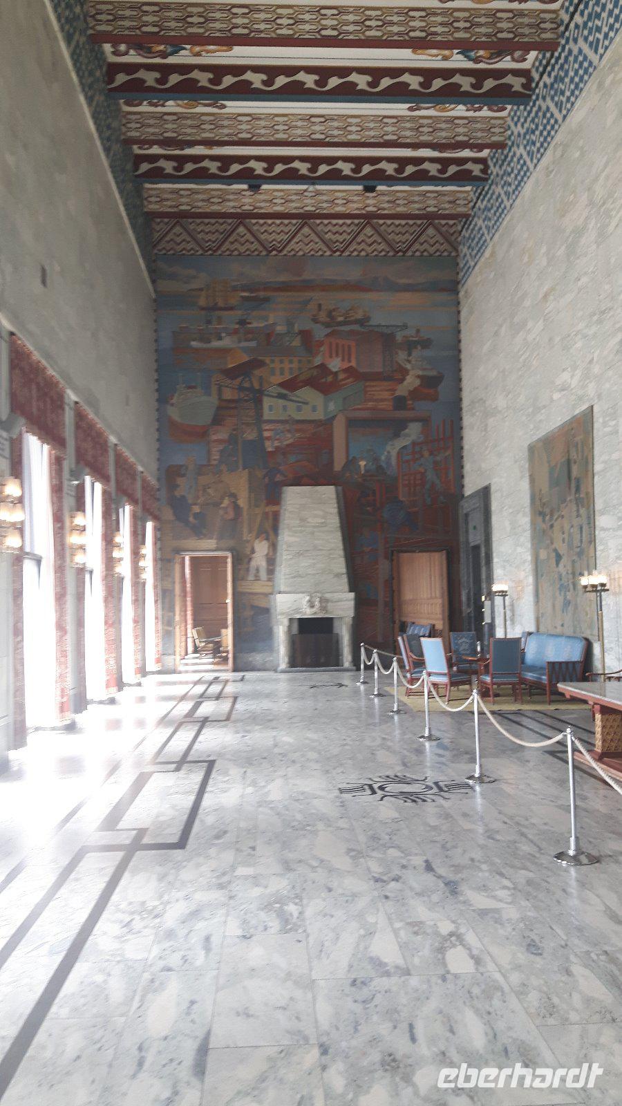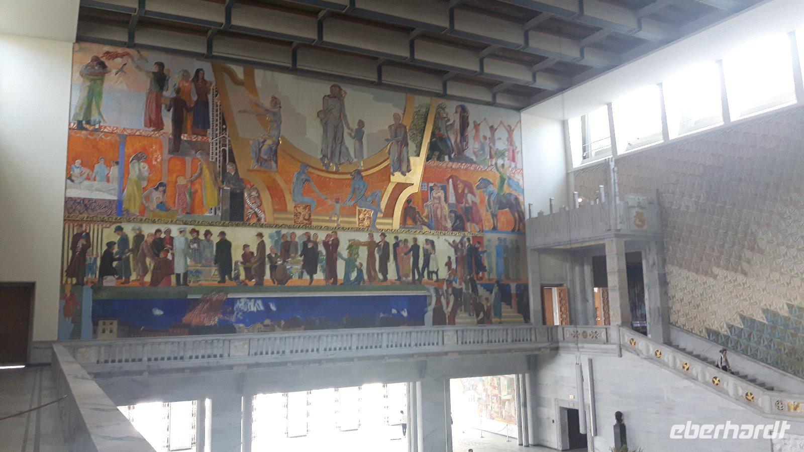 Unsere Stadtführerin Stine holte uns gegen 9 Uhr am Hotel ab und sofort legten wir einen kurzen Fotostopp an der benachbarten Holmenkollen-Schanze ein. Danach besuchten wir gemeinsam den legendären Vigeland-Park, ein wahrhaftiger Höhepunkt unseres Oslo-Aufenthaltes. Hier hat der bekannte norwegische Künstler Gustav Vigeland immerhin Beeindruckendes geschaffen und schon beim Betreten des berühmten Skulpturenparkes ist man für den ersten Moment einfach nur sprachlos vor Staunen! Vigeland hat sich in Oslo den Traum vieler Künstler erfüllt - er hat ein großartiges Gesamtkunstwerk geschaffen und die in Skulpturen dargestellten Menschen und Tiere sind so lebensecht, so voller Bewegung und Emotion, dass man meint, sie atmen zu sehen - wirklich grandios! Später erreichten wir dann auch noch die Insel Bygdøy, bekannt durch seine zahlreichen Museen. Abschließend ging es ins Zentrum der Stadt und dort sahen wir dann unter anderem das Neue Opernhaus, das seit April 2008 nun auch die Spielstätte der Norwegischen Oper ist und auf dessen Dach man hinauf gehen kann. Des Weiteren fuhren wir am Königlichen Palast, dem Nobel-Institut und dem Rathaus vorbei. Nach Der Stadtführung verabschiedeten wir uns nunmehr auch von unseren Fluggästen, die den Heimflug von Oslo aus antraten. Etwas Freizeit am Nachmittag für die übrigen Gäste rundete unseren intensiven Besuch Oslos ab. Am Abend checkten wir dann auf dem Fährschiff der „Stena Saga" ein und ließen uns ein liebevoll gestaltetes Abendessen vom Buffet schmecken - echt lecker! Die anschließende Ausfahrt aus dem Oslofjord war ebenso beeindruckendend!