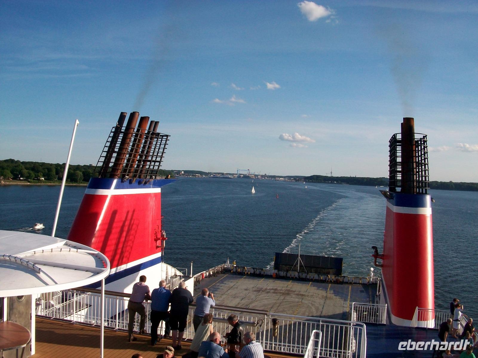 In der Fußgängerzone gibt es zahlreiche Cafés die zur Einkehr einladen; gegen fünf jedoch ist das Boarding für die Fähre vorgesehen und hier ist nun unsere Gruppe wieder komplett. Eine Stunde später gibt es das Abendessen vom sehr reichhaltigen Buffet und während wir es uns schmecken lassen, legt das Schiff ab und die Hafenanlagen von Kiel ziehen vorbei.
