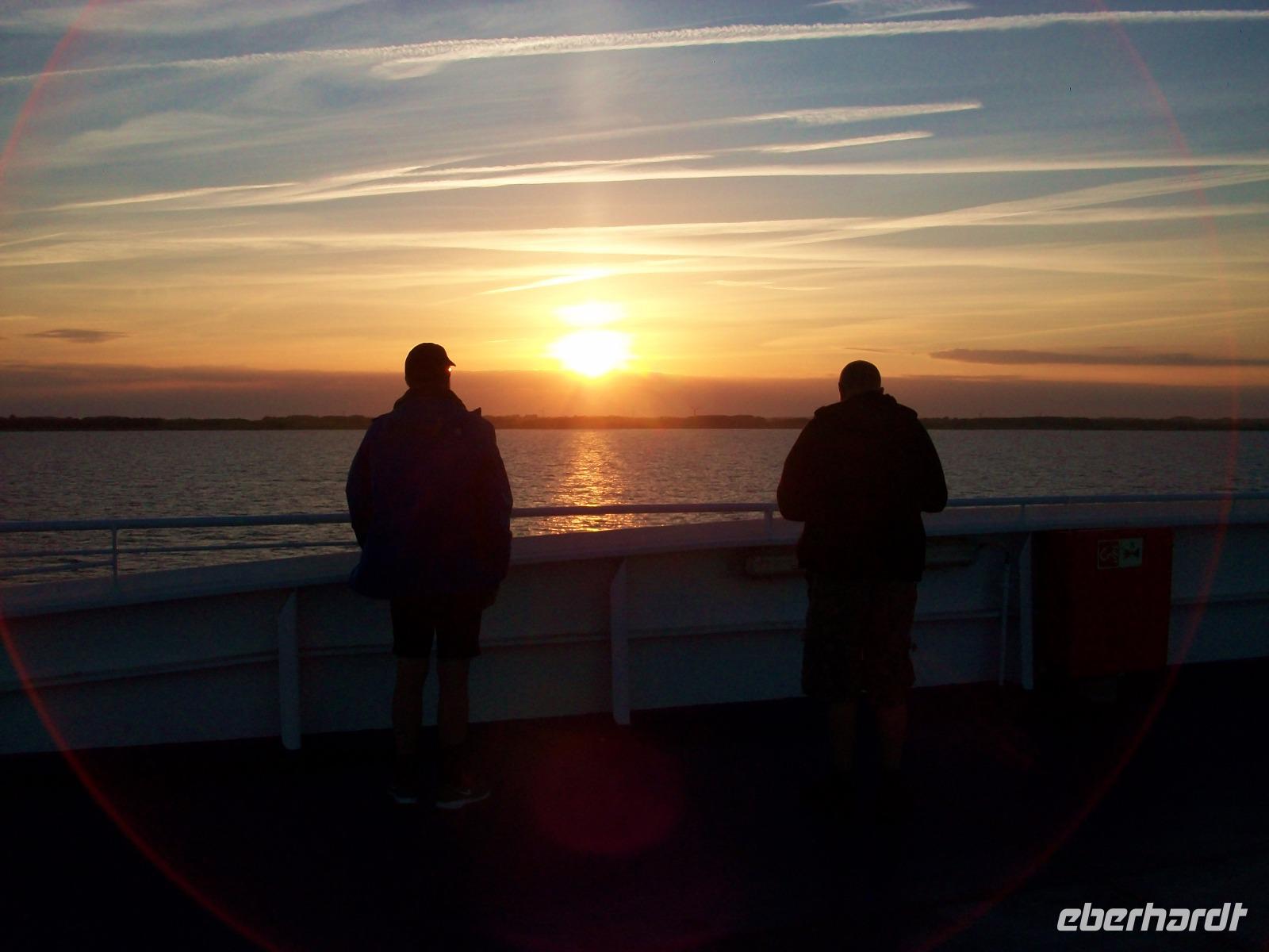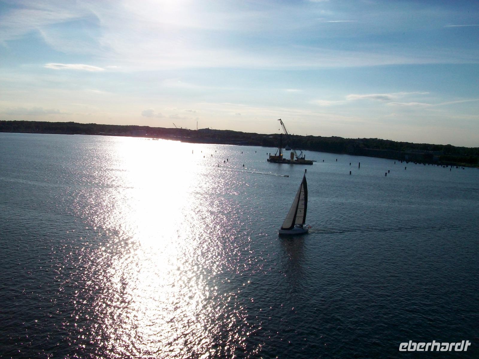 Nach dem Essen lohnt ein Gang aufs Oberdeck; die Sonne wärmt auch noch am Abend und wir gelangen durch die Kieler Förde, hier sind zahlreiche Segler unterwegs. Vorbei an Laboe und dem Marinedenkmal gelangen wir auf das Meer; noch ein Gläschen an der Bar und ein schöner erster Tag geht gemütlich zu Ende.