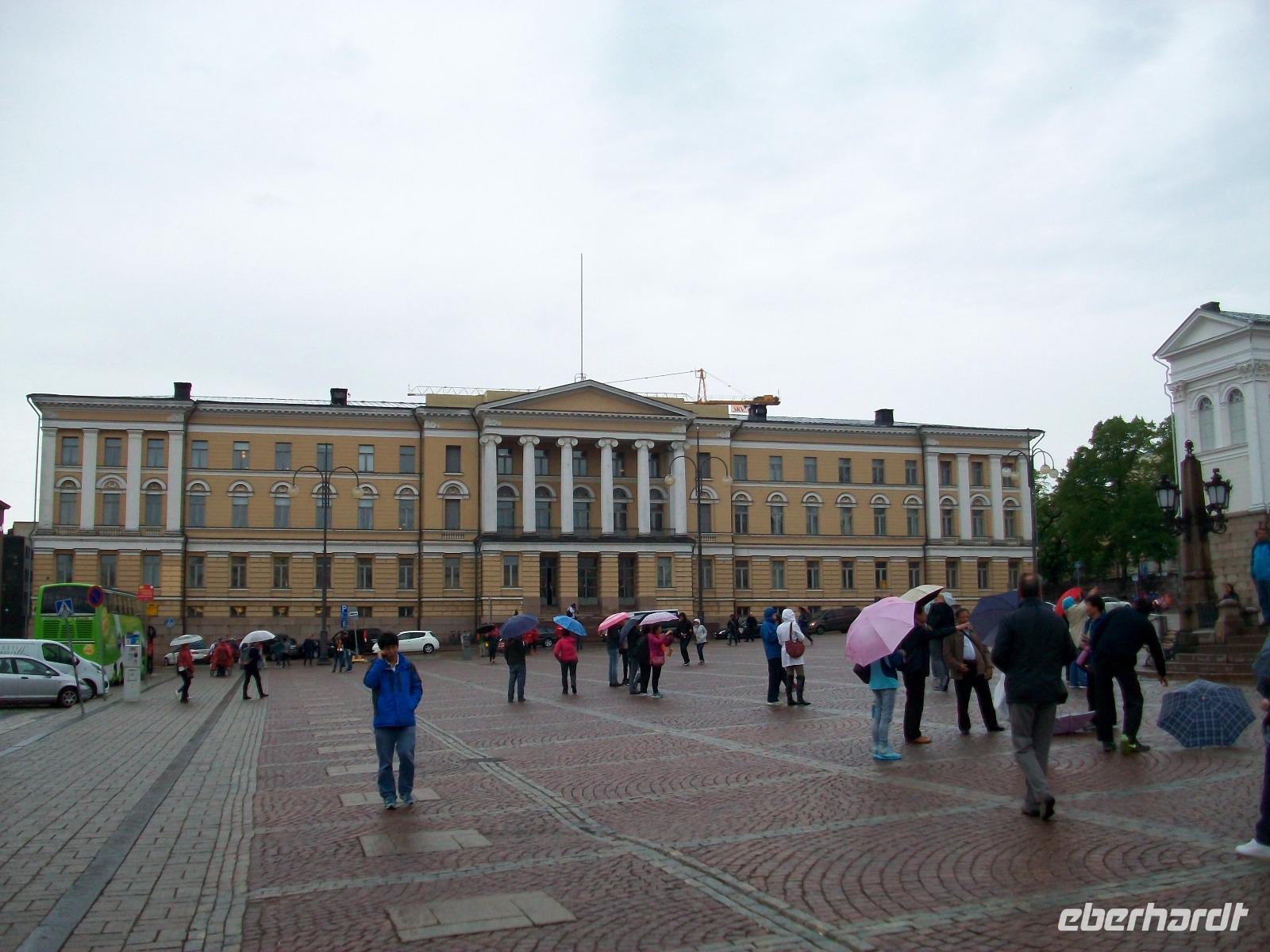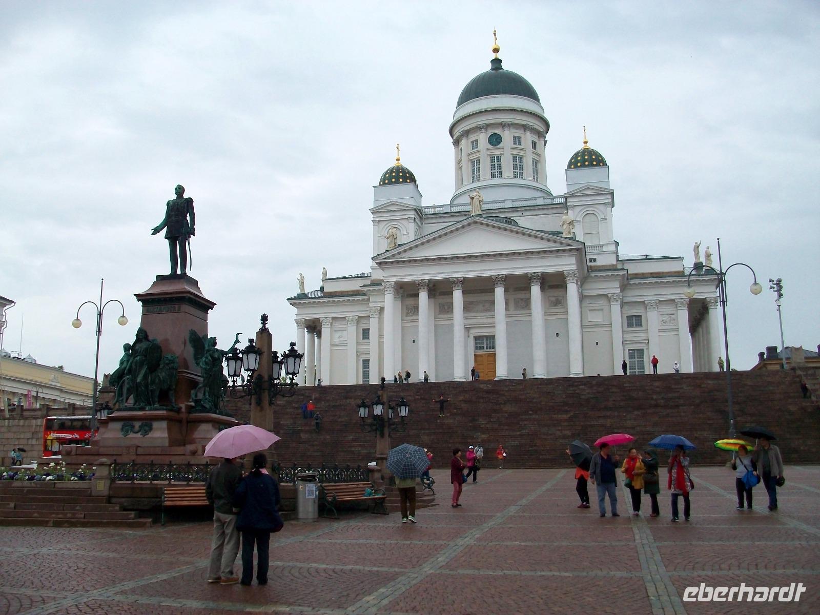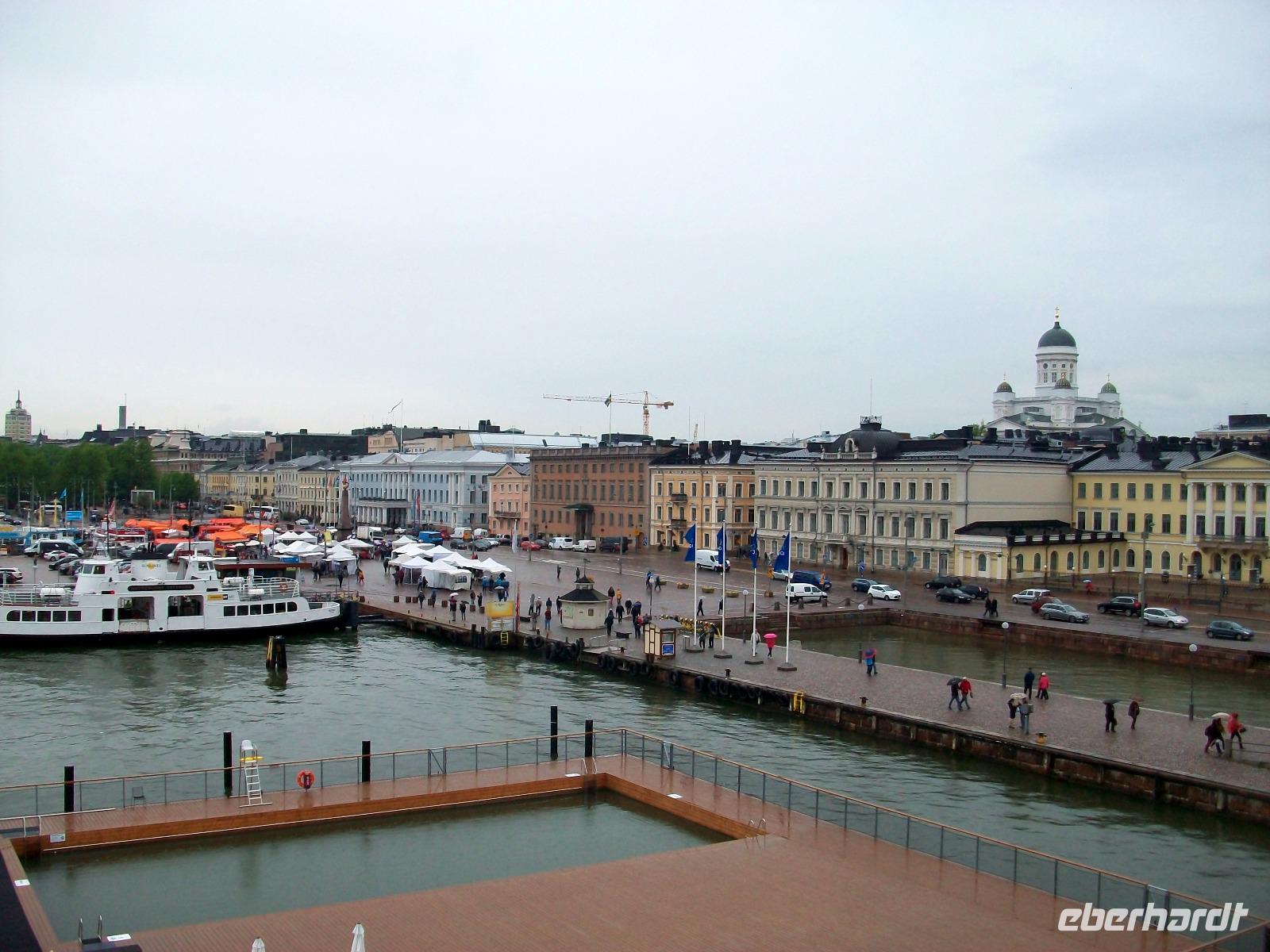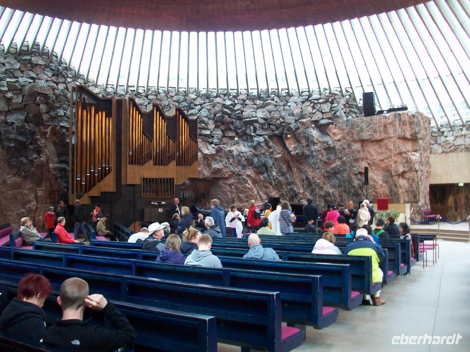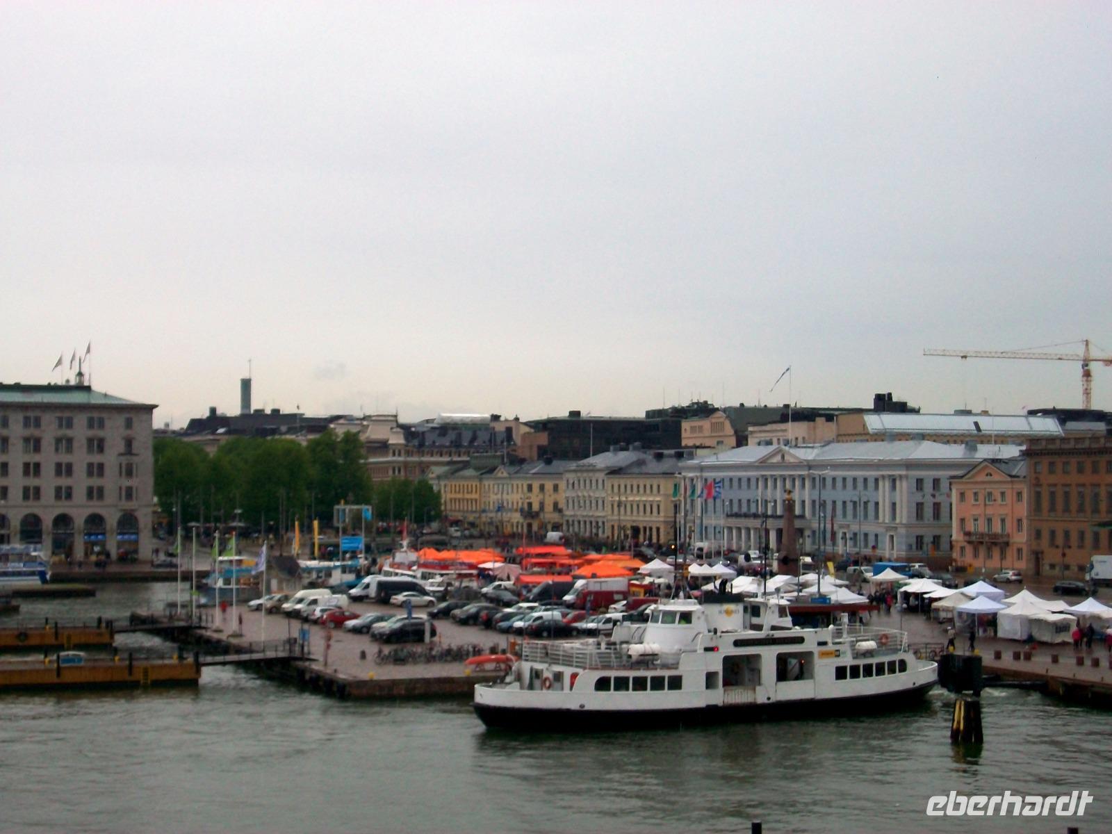 Bald kommt die schöne Silhouette der Stadt in Sicht und kurz vor zehn legen wir an. Jetzt sind alle Fahrgäste der Fähre auf den Beinen und nur langsam geht es von Bord. Dennoch, unsere Gruppe findet sich und zeitgleich kommt auch der Bus vorgefahren. Hier können wir nun Bernd, unseren Fahrer auf der weiteren Tour begrüßen und irgendwie hat auch Tim, unser Stadtführer, den Bus gefunden. Leider zeigt sich das Wetter vorerst trüb, doch was Helsinki zu bieten hat ist doch sehr sehenswert. Wir gelangen vom Meer in die Innenstadt und bald steigen wir aus um zu Fuß den Felsendom zu betrachten. Es ist eine der vielen Sehenswürdigkeiten dieser Stadt, eine moderne Kirche in Granit geschlagen, absolut beeindruckend! Dann geht es weiter in den Park der dem berühmtesten finnischen Komponisten Jean Sibelius gewidmet ist, wir sehen das Denkmal zu seinen Ehren. Weiter geht die Fahrt kreuz und quer durch Helsinki, wir betrachten die gepflegten Bauten, die Kirchen und beenden die Tour direkt am Meer. Hier gönnen wir uns noch etwas Freizeit und einen Mittagsimbiss, auf dem Fischmarkt gibt es frischen Fisch, lecker!