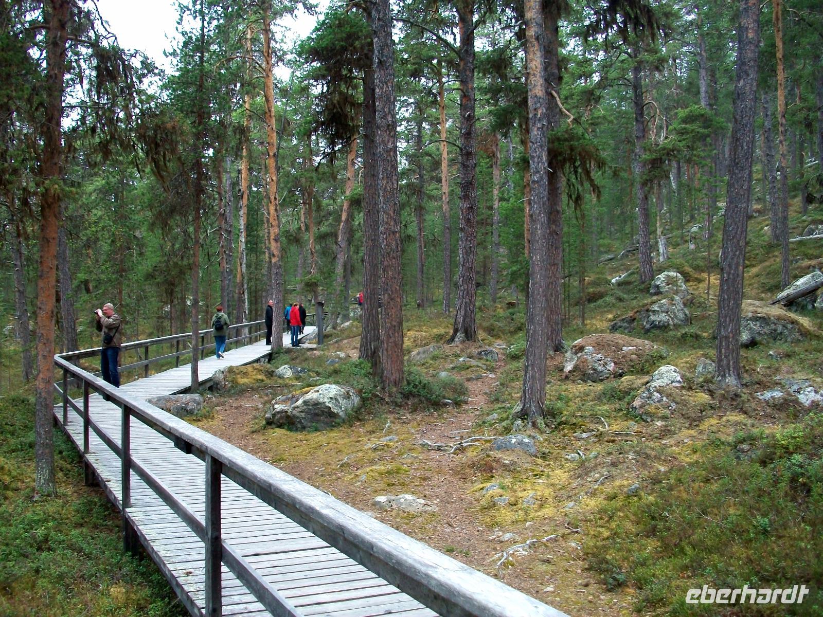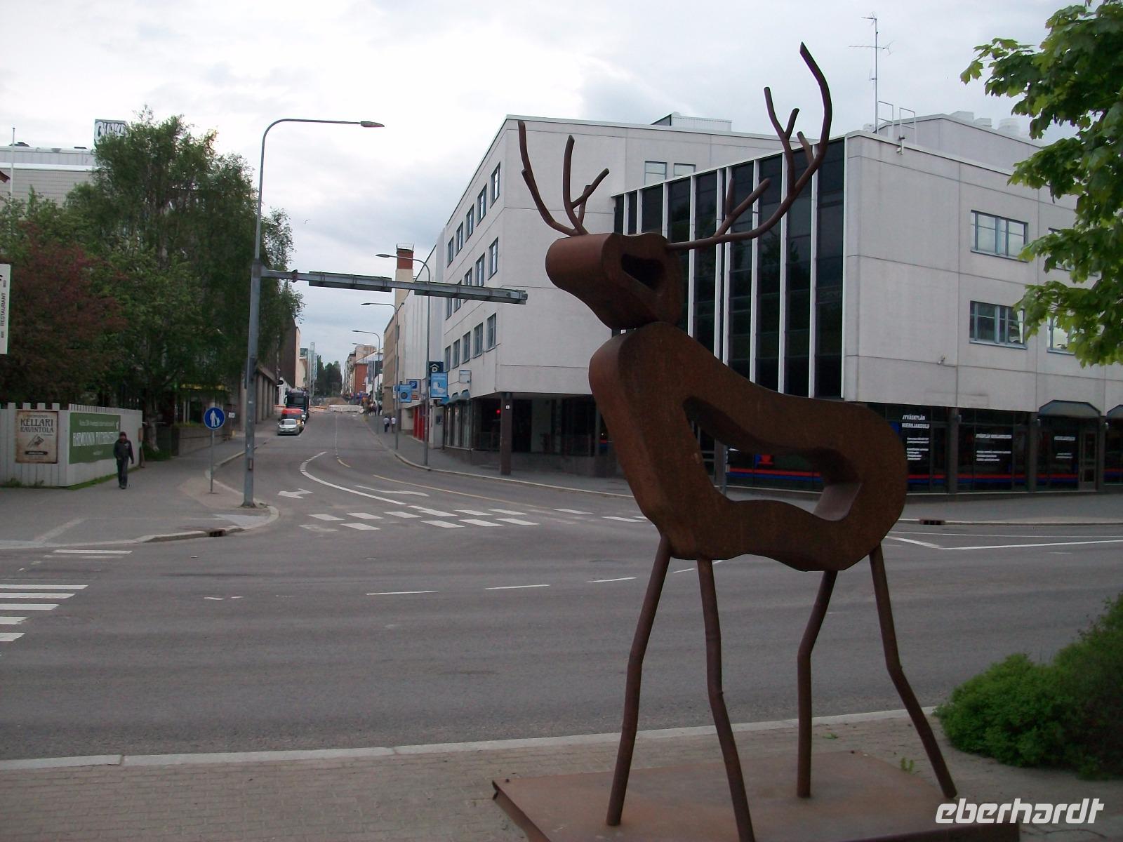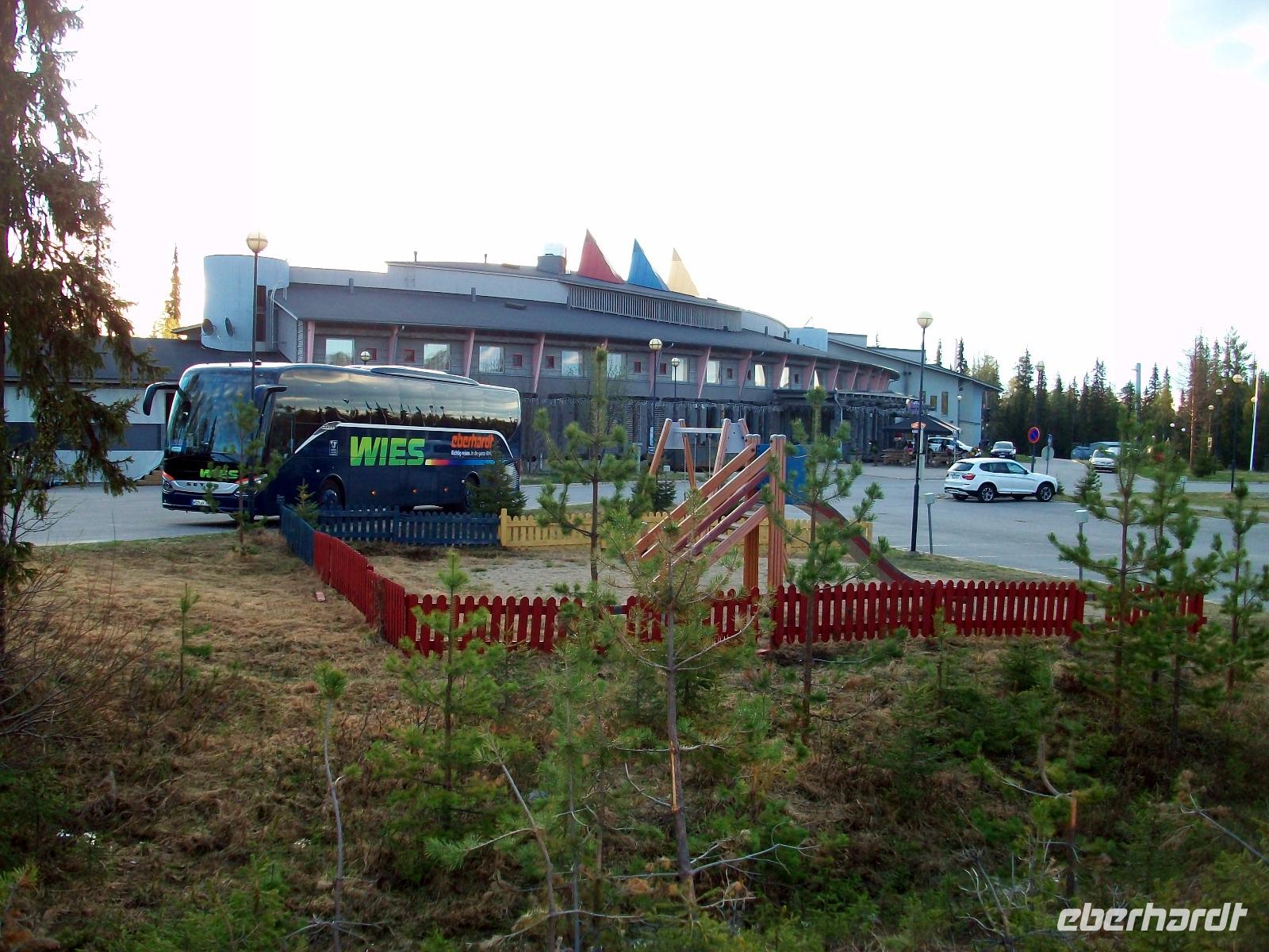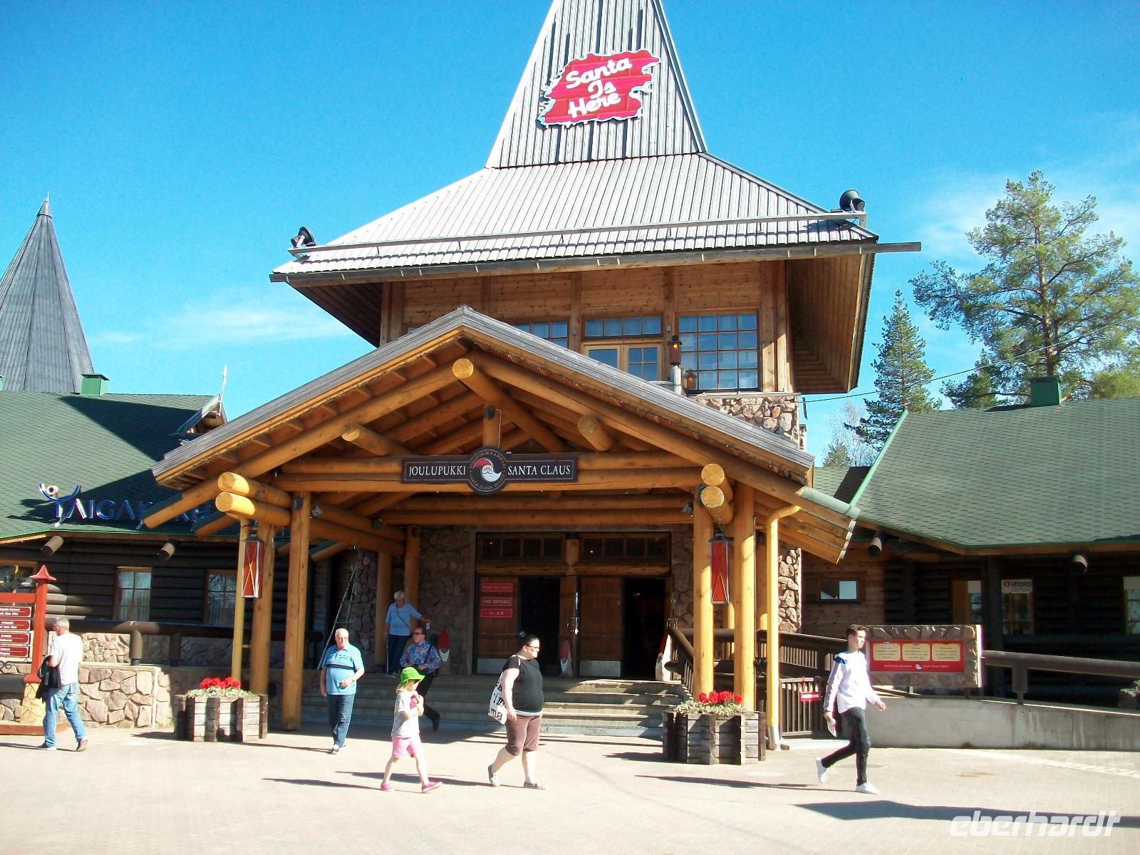 9.6.2017. Ein langer Tag liegt vor uns, deshalb müssen wir auch früh starten. Heute hat sich nun die Sonne herausgewagt, sie wird uns den ganzen Tag begleiten und für angenehme Temperaturen sorgen. Unser Weg führt uns nun weiter nach Norden; durch dünnbesiedelte Gebiete und unberührte Natur gelangen wir gegen Mittag zur bekannten finnischen Hafenstadt Oulu und in der Nähe des Wassers gönnen wir uns eine kurze Pause für eine Stippvisite. Es ist Markt und ein buntes Treiben empfängt uns bei sommerlichen Temperaturen. Lange können wir nicht verweilen, unser Weg ist noch weit und parallel des Bottnischen Meerbusens, es ist der nördliche Zipfel der Ostsee, gelangen wir in das Flusstal des Kemijoki. Die Kilometer verschwinden unter den Rädern des Busses, bald sehen wir die Häuser von Rovaniemi, dahinter liegt dann der Polarkreis. Es ist ein besonderer Ort denn hier wohnt der Weihnachtsmann. Als wir aussteigen werden wir von weihnachtlichen Klängen empfangen, bei über 20° Celsius ein eigenartiges Gefühl. Hier gönnen wir uns nun ein Stündchen Zeit; quer über den Asphalt ist ein dicker Strich gezogen, er symbolisiert den Polarkreis. Mit einem großen Schritt überschreiten wir ihn und schauen uns danach die Werkstatt des Weihnachtsmanns an der sich an diesem Ort doch tatsächlich die Ehre gibt! Wer möchte lässt sich mit ihm und den Wichteln fotografieren; während hier leise der Schnee rieselt haben wir draußen sommerliche Temperaturen. Hier gibt es auch ein Postamt und wer will kann schon heute die Weihnachtspost erledigen, ein besonderer Stempel kommt noch direkt vom Weihnachtsmann darauf.
